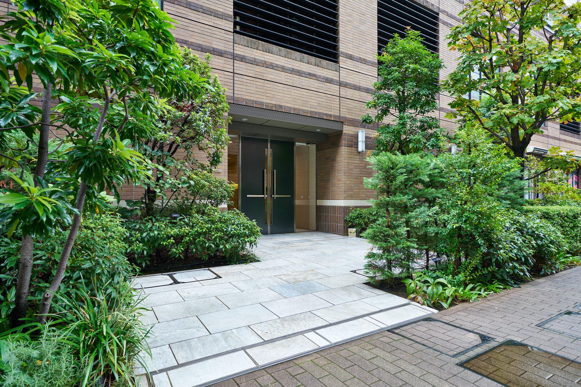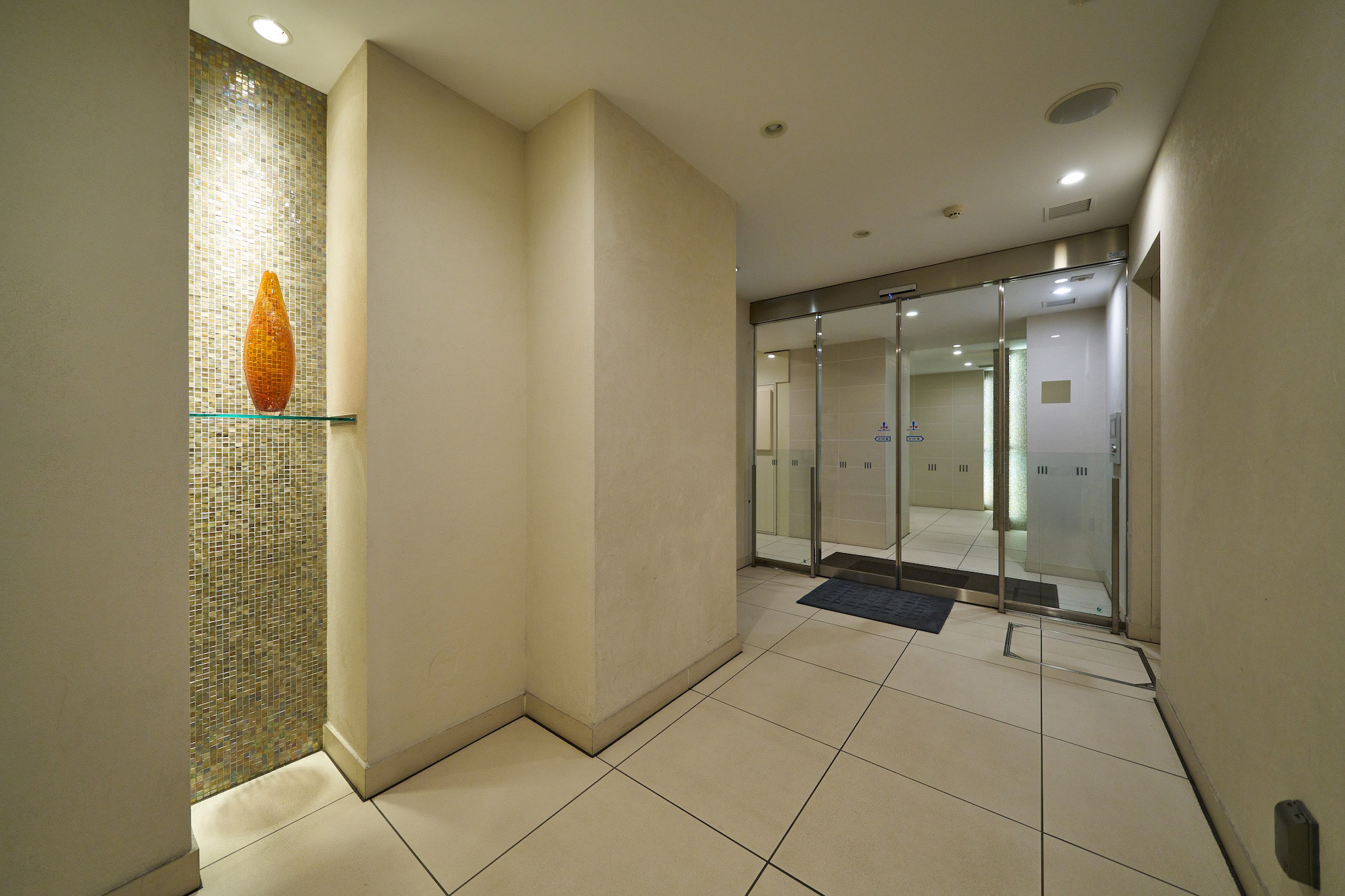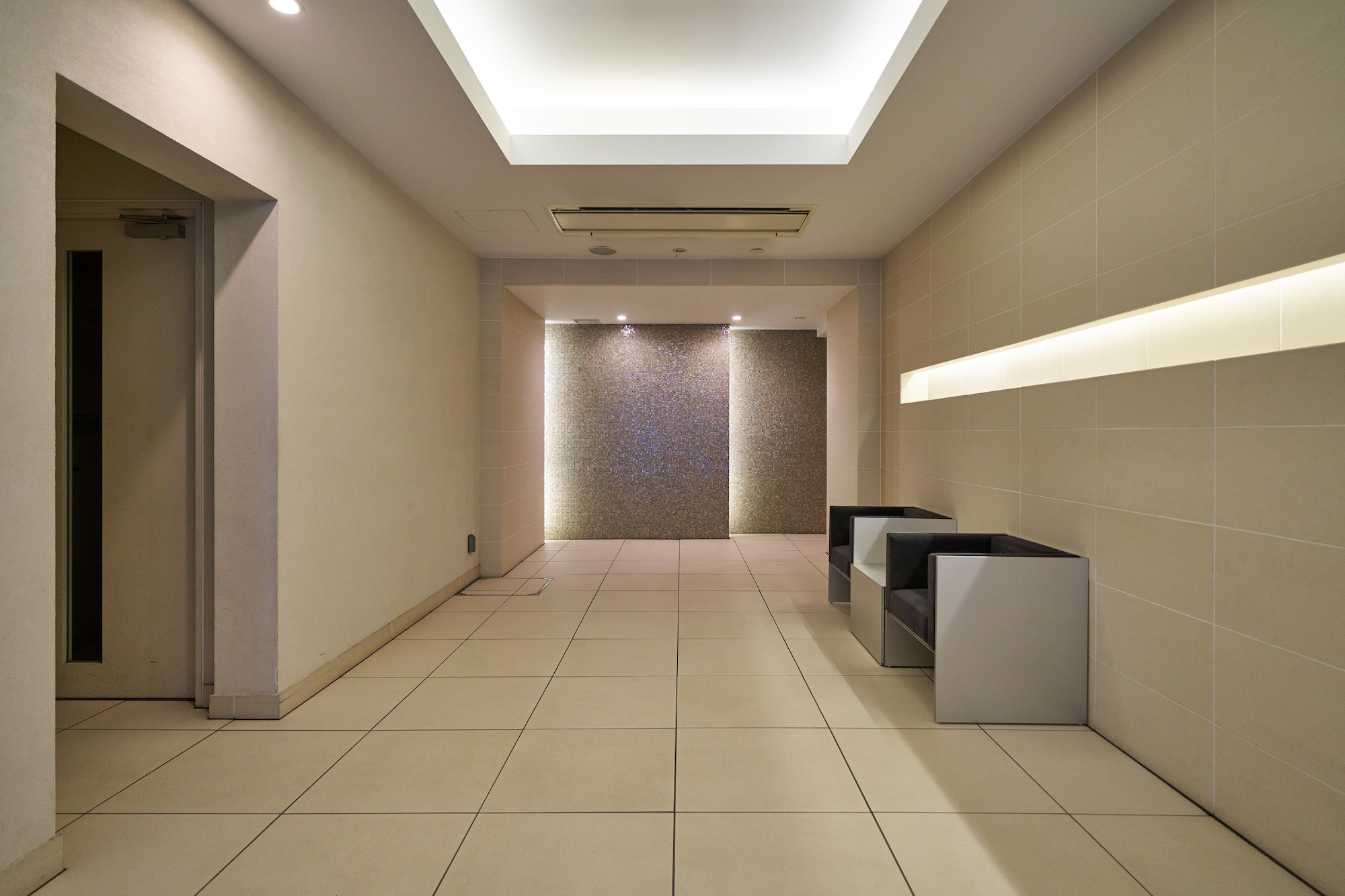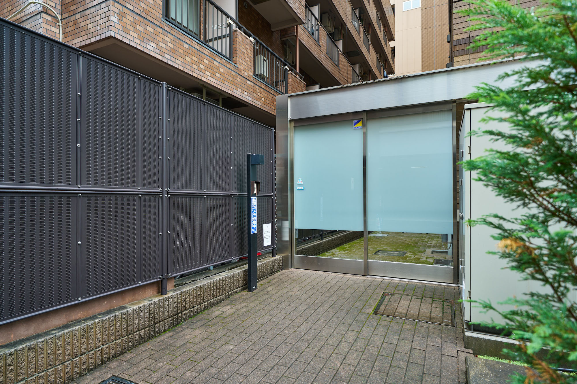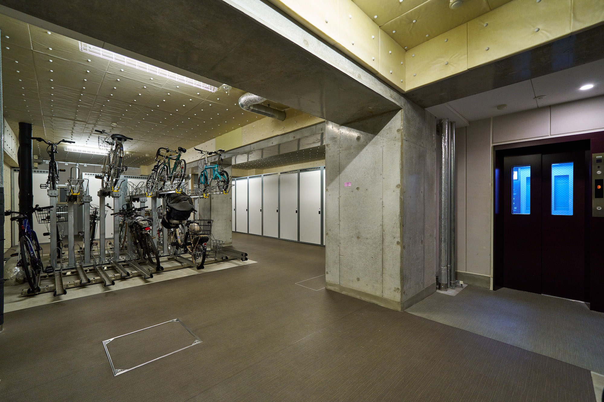 気高く落ち着いた気配を漂わせるエントランスは、都市の緊張をほどきながら優しくお出迎え。息づく緑が内部空間へと導く役割を担うとともに、通りからの視線を遮る役割も果たしています。クランクした動線も、プライバシーへの配慮のひとつです。エントランスの扉の先で待っているのは、外とは別の世界を演出したホール。住まう方が「私に還る」ための気品あふれる空間です。目を惹くベネチアンモザイクでしつらえた正面の壁が、華やかに煌めきながらエレベーターホールへと誘います。駐輪場は建物内、専用エレベーターで上がった3階にあり、自転車を雨風から守り、乗り降りにも便利です。トランクルームも用意されており、快適な生活を後押ししてくれます。