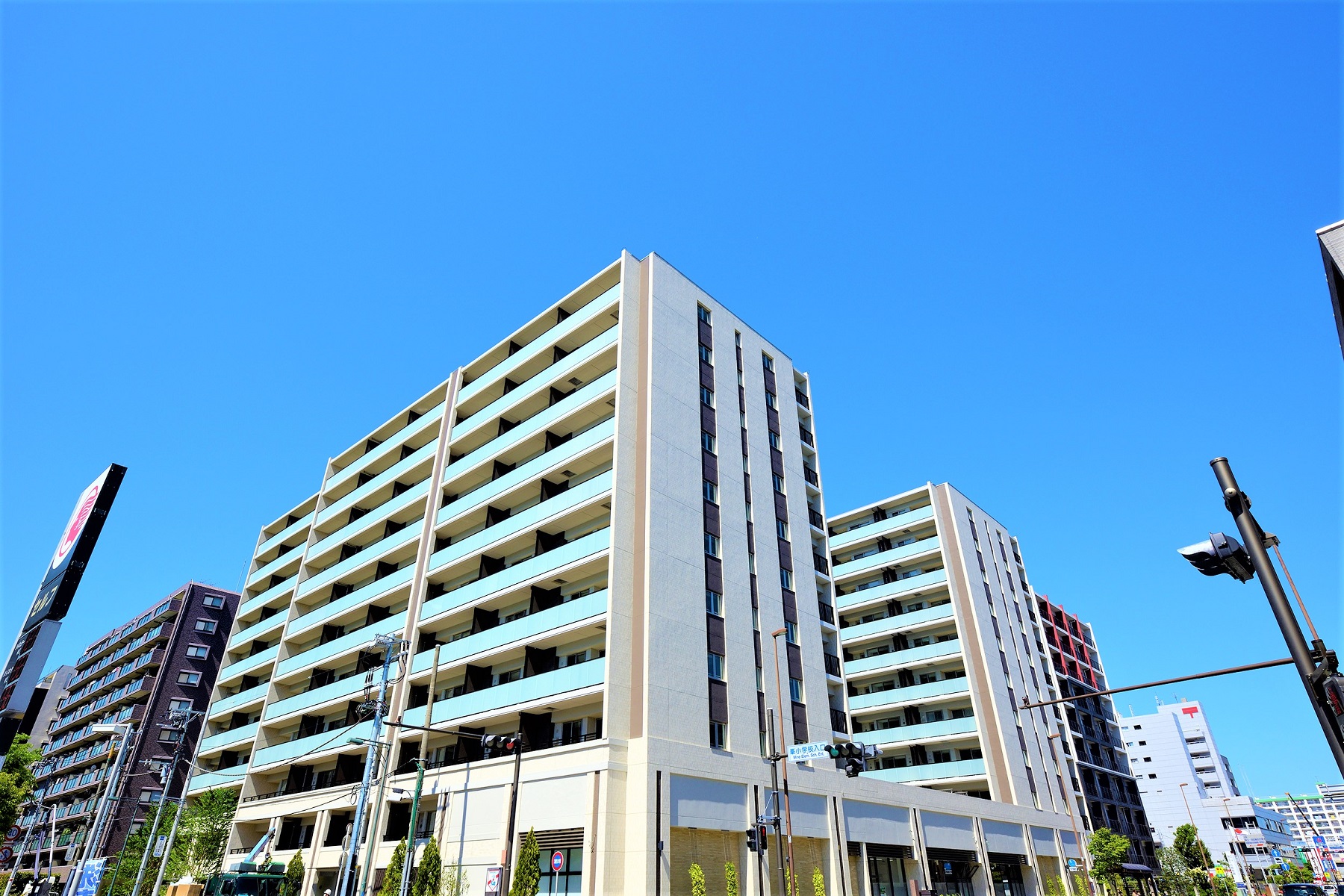デザイン 伸びやかに、リズミカルに。星川の新たな優景を描く。 外壁は明るいベージュ色を基調とし、素材感のあるタイルや砂目地、乳白ガラスの手すりを採用。ファサードを分節しながら空へ伸びあがるマリオンを描き、ダークカラーをアクセントにあしらって、伸びやかでリズミカルな佇まいをデザインしました。