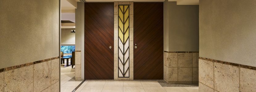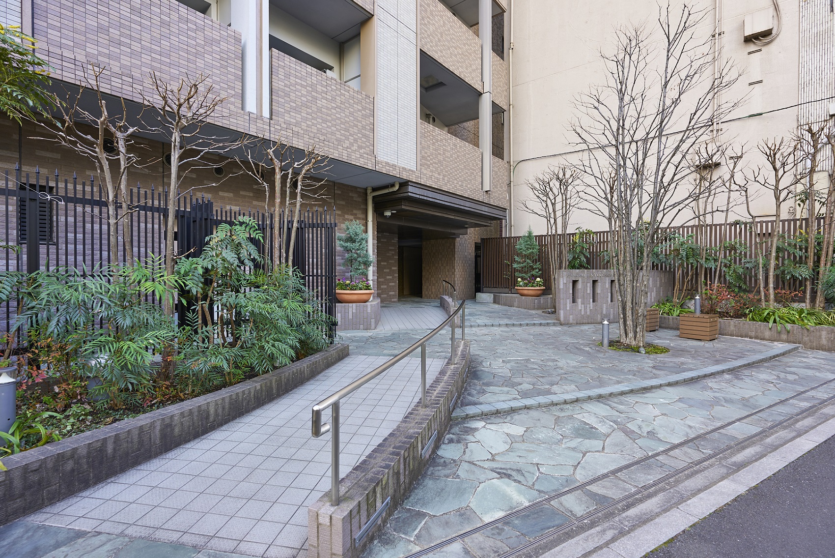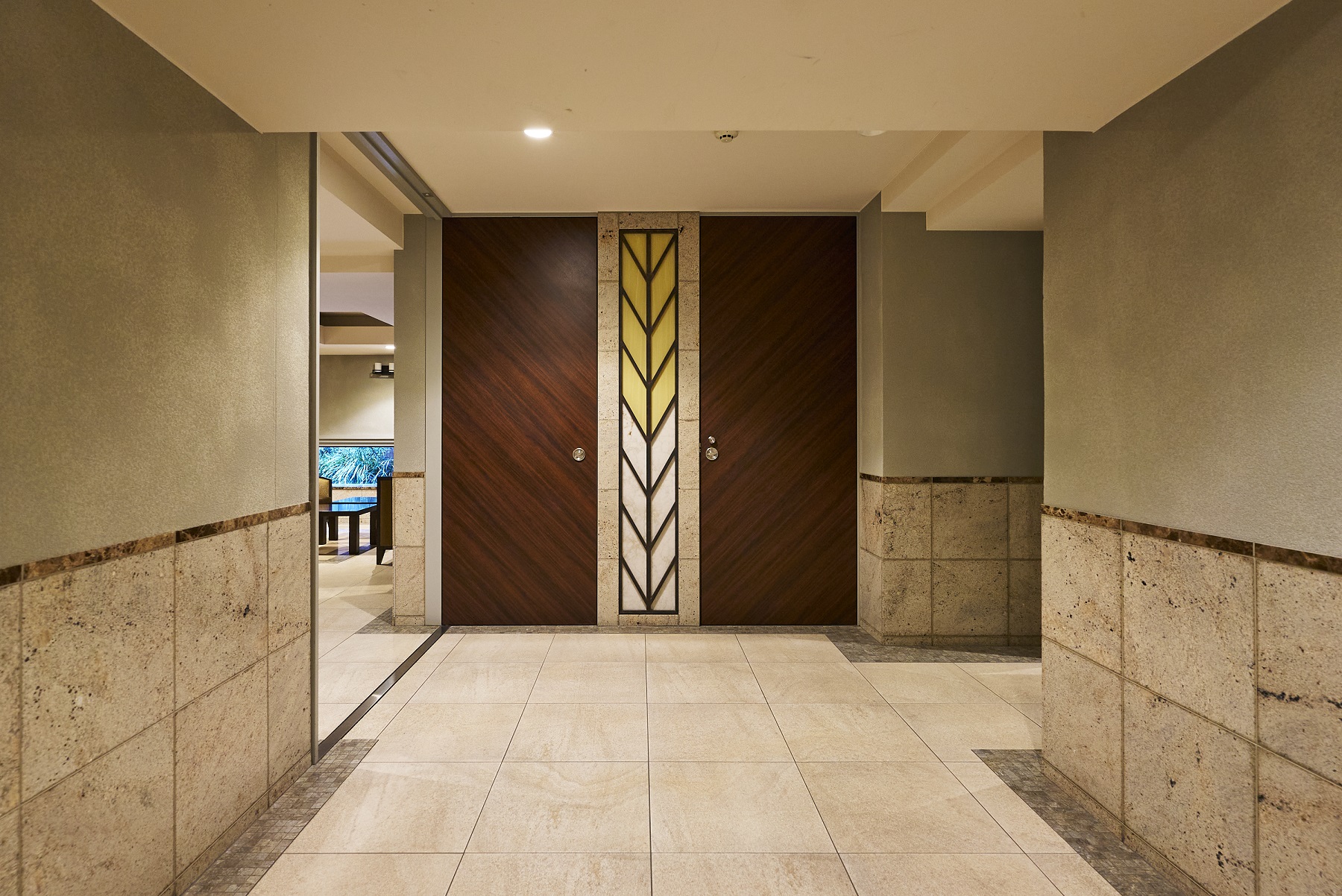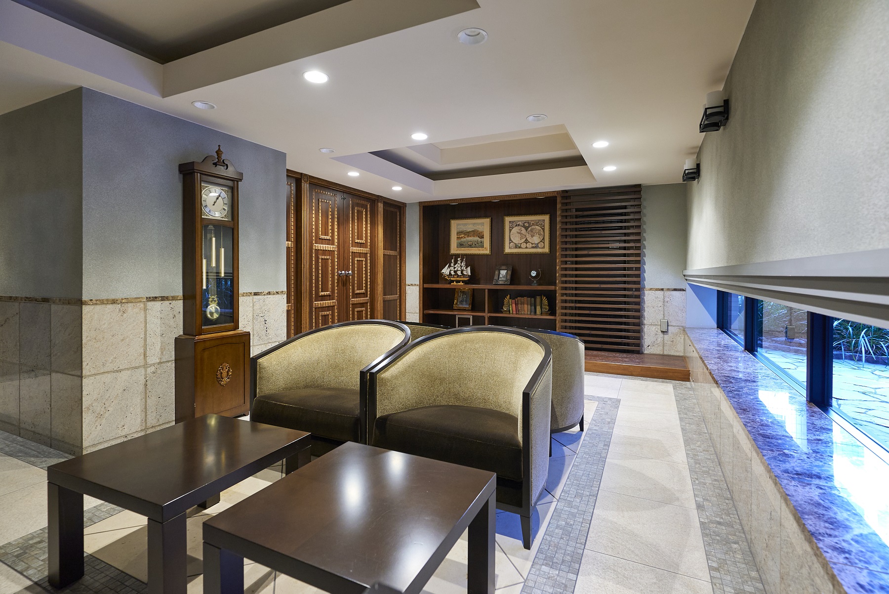 「ホワイエ」は、住まう方専用の落ち着いたラウンジ空間です。芸術的にアレンジされた床面のタイル模様や開放感溢れる折り上げ天井。アンティークなしつらえの中に、横浜らしい社交の時代が蘇りそうです。また、石庭の装いをモダンに再現した「ピクチャーガーデン」の風景を切り取るようにしつらえられた、ワイドなビューウィンドーが魅力。緑・石・水の景色に癒されて、充足のひとときが流れます。吉田町通りに面した「ブライトエントランス」は、重厚感ある佇まいで、2層吹き抜けのホールにはアーティスティックな照明が施され、洗練された空間です。北側の「ガーデンエントランス」には、美しい石目模様を描く自然石貼りに緑豊かなコミュニティスペース「ガーデンプラザ」が設けられています。また、安全とプライバシーに配慮した内廊下設計で、美しいタイルカーペットやダウンライトが、上質な雰囲気で住まいへエスコートします。