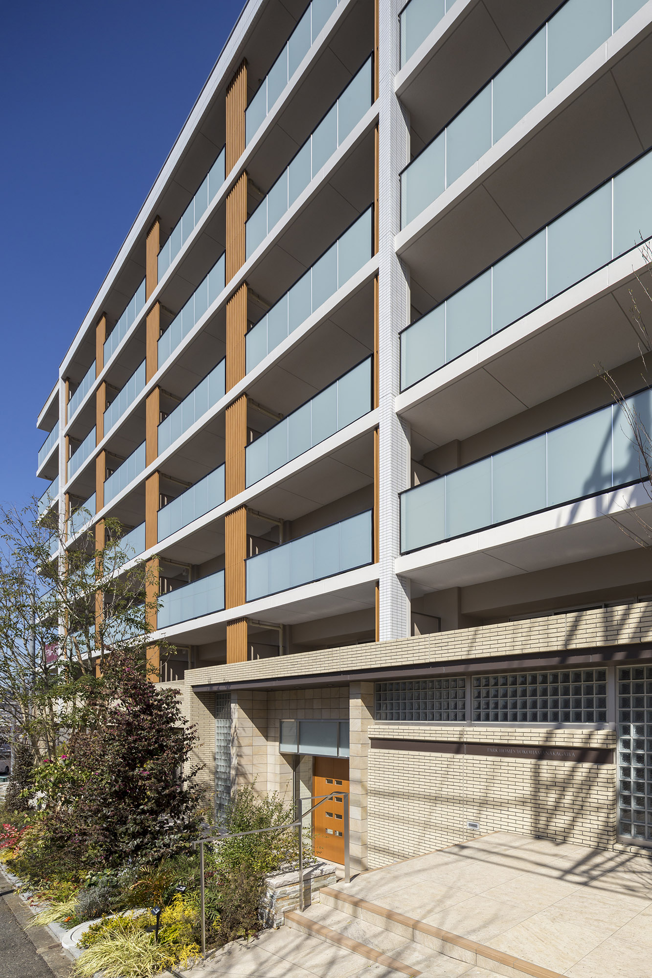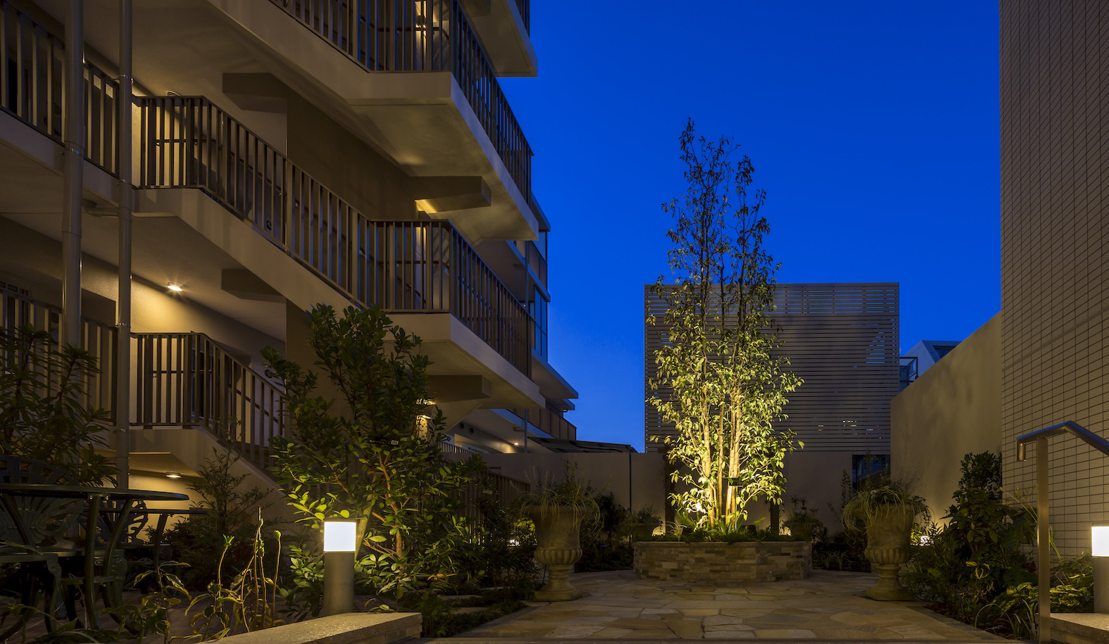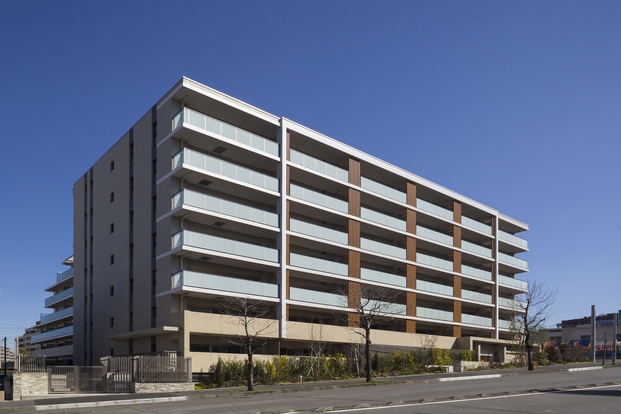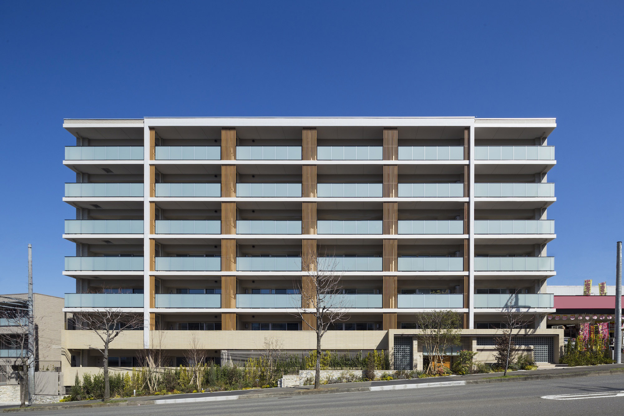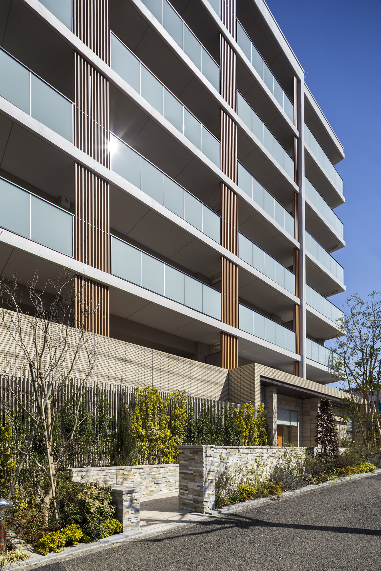 港北ニュータウンの潤いを継ぐ街並みに、凛と映える佇まいが調和する「パークホームズ横濱中川」。ベージュタイルを基調にした外壁タイルとやさしいコントラストを描くのは、ガーデンにも使用されている石積み風タイル。アクセントに木調ルーバーを施すなど、ぬくもりに満ちたマテリアルで邸宅を彩っています。あたたかなデザインが風格を感じさせると共に、白いマリオンが洗練の表情をプラス。美しくもやさしさを感じさせる佇まいです。