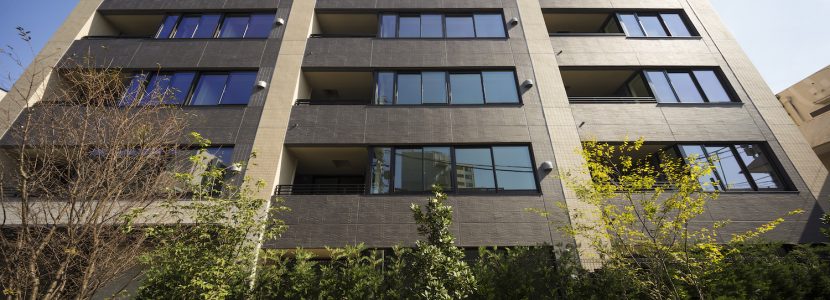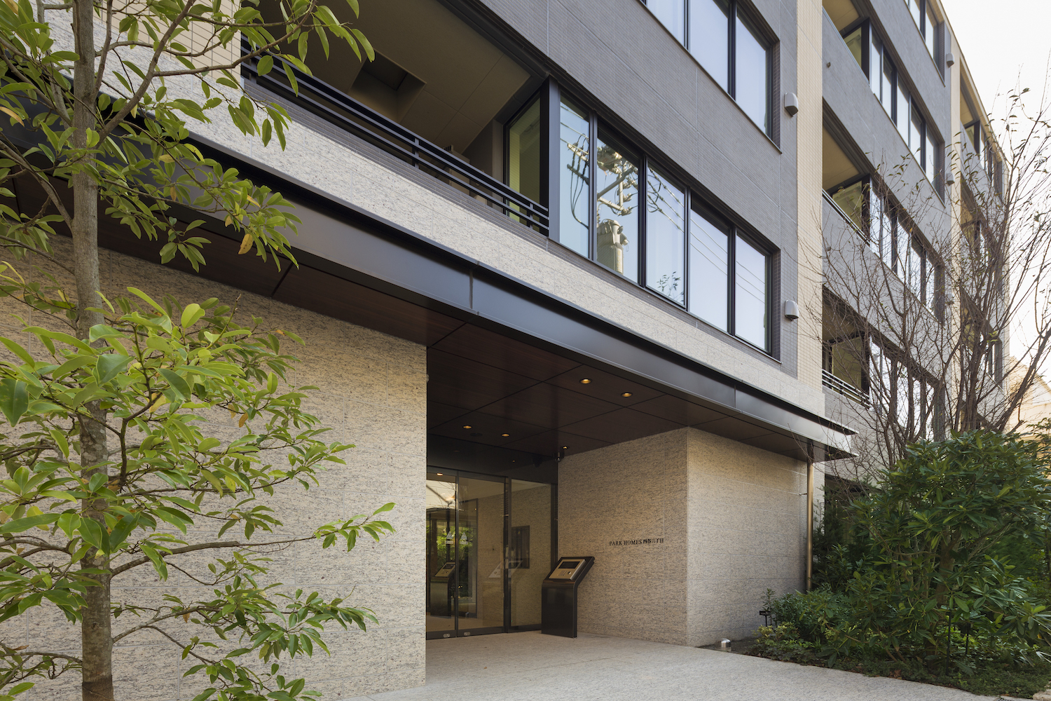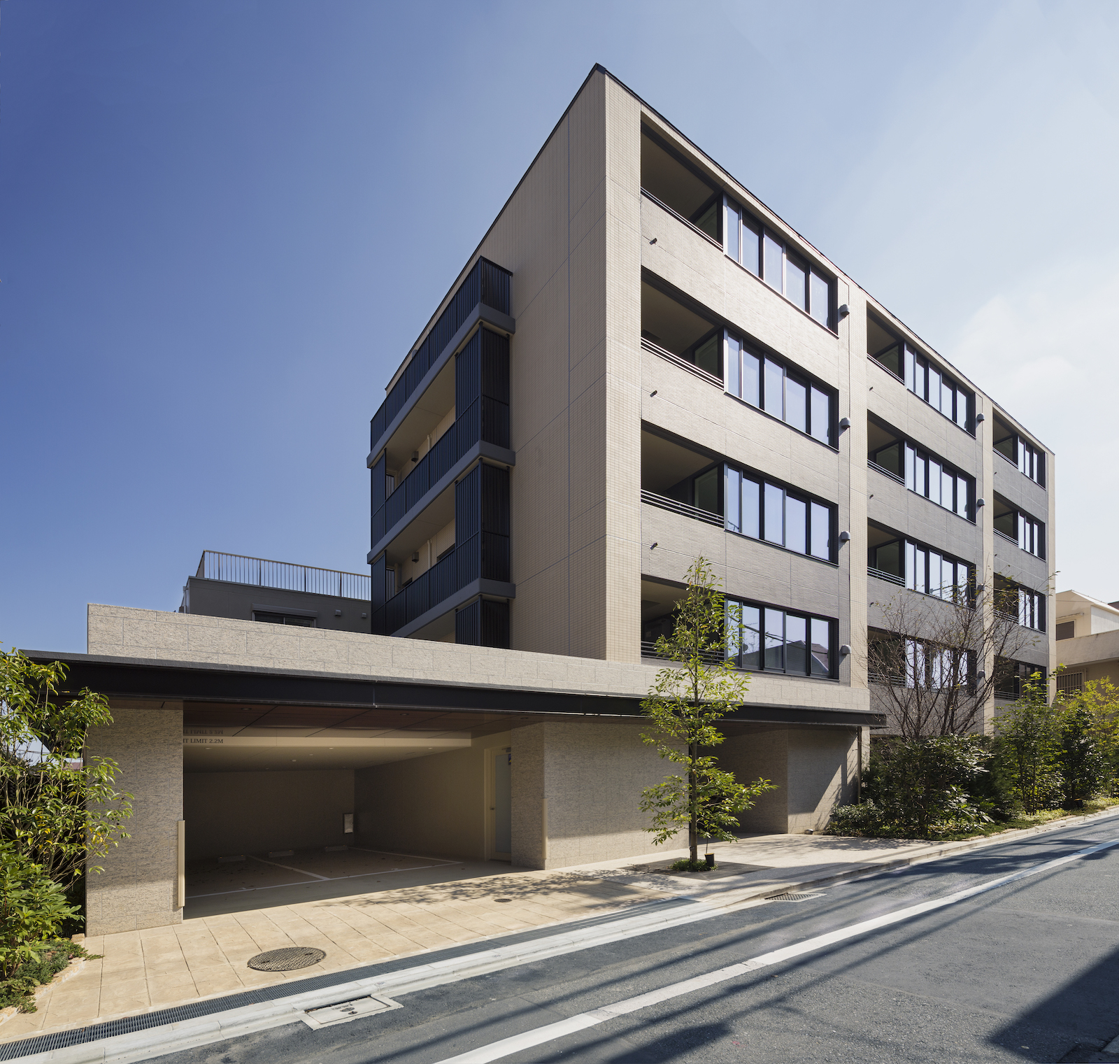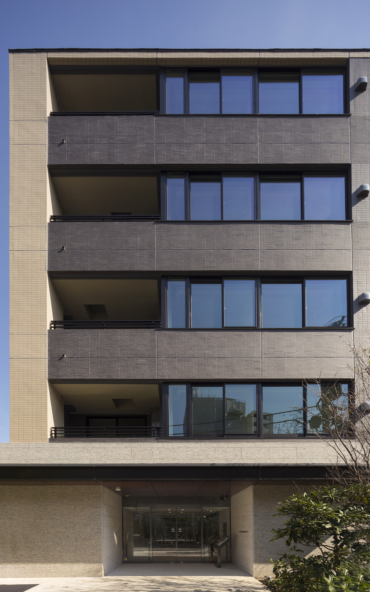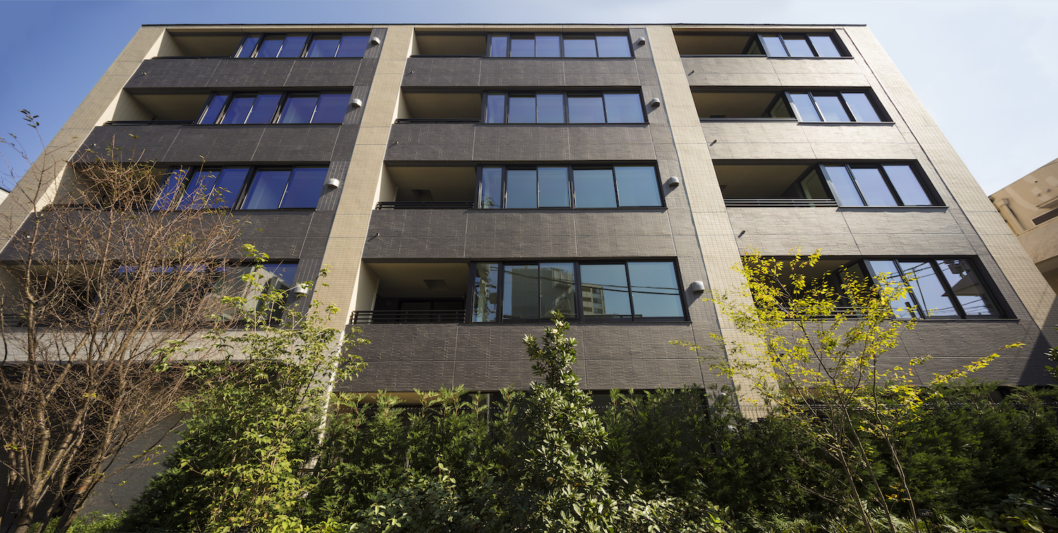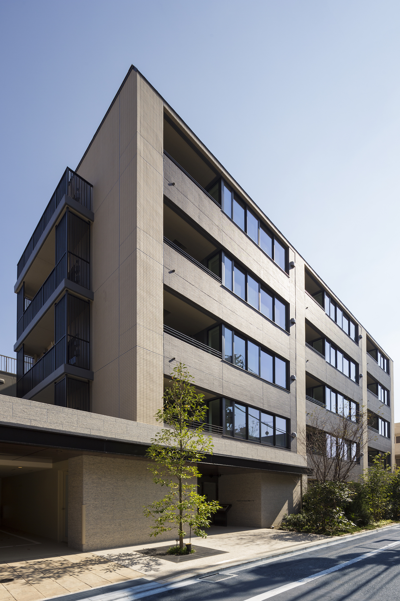 街並みと調和するベージュのタイルと、シックな印象のダークブラウンのボーダータイル、そこにバルコニーのルーバーフェンスや窓のフレームが全体をさらに引き締め、洗練されたファサードを創り上げています。足元には豊かな植栽を配し、建物との美しいコントラストを演出。閑静な住宅街に馴染みながらも存在感のある外観デザインです。