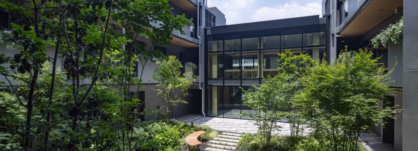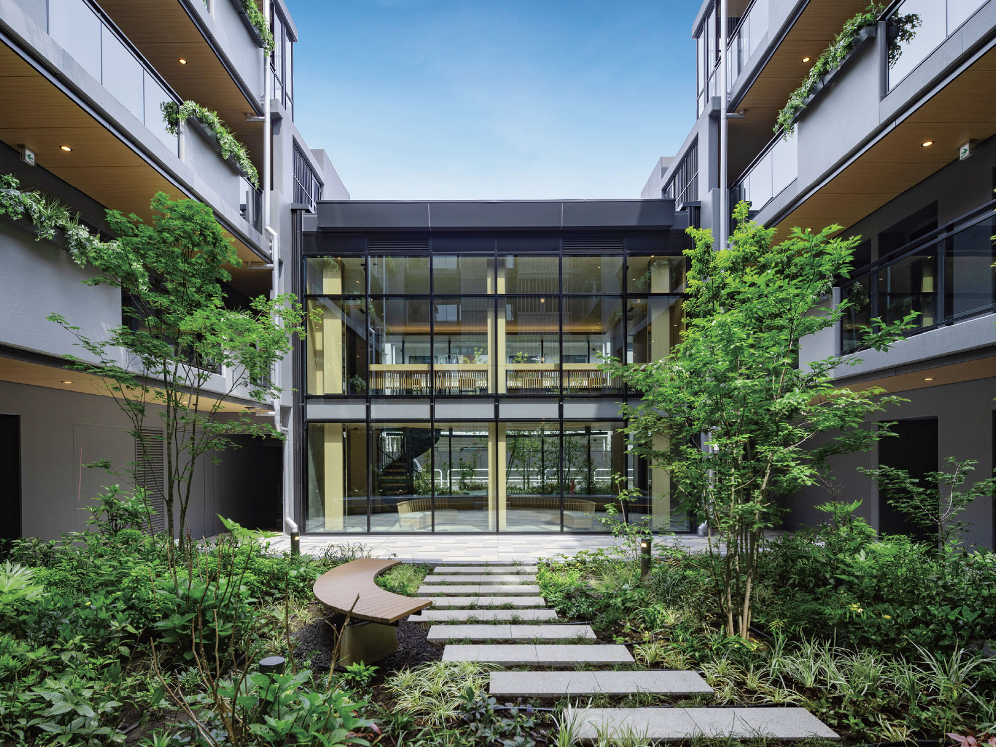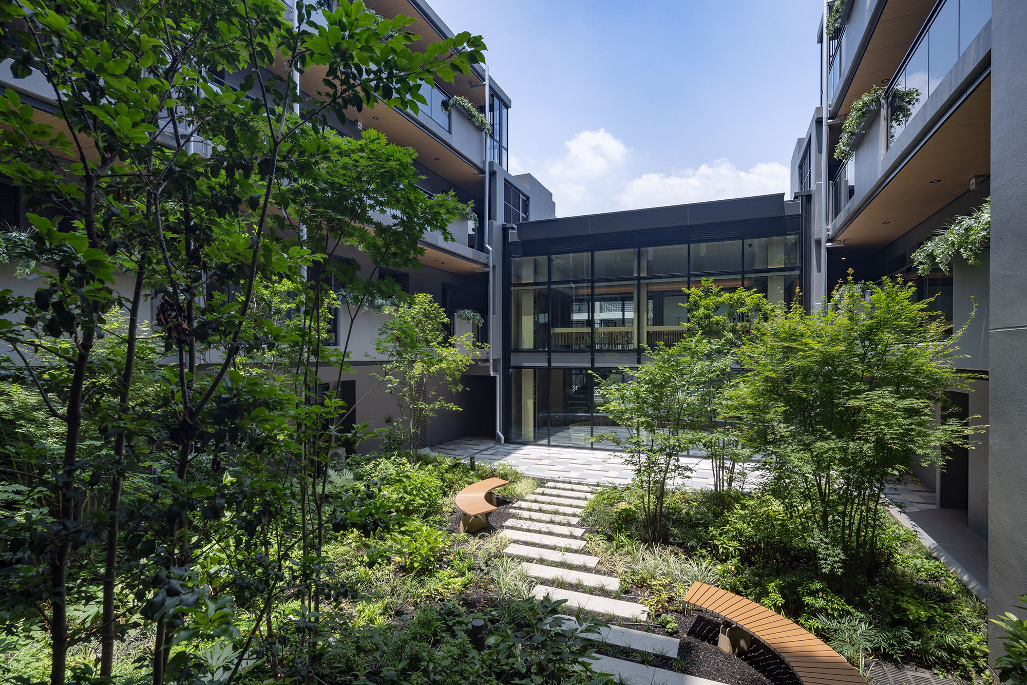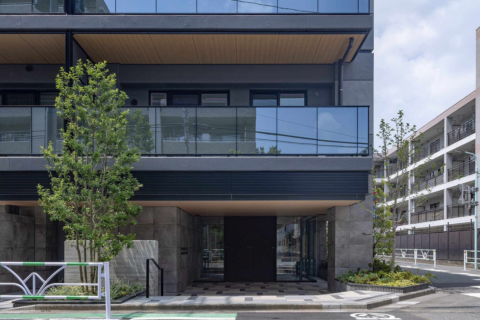 上質な街並みや豊かな緑が広がっている邸宅地に位置する「パークホームズ代々木西原」。外観は優しく深みのあるグレートーンとナチュラルな木目が生活をやさしく包み込むような素材や色彩を使用。メインエントランス側の東西ファザードは邸宅としての佇まいを際立たせるために、外壁はグレートーンの塗装材で仕上げ、スラブラインは水平ラインを強調してシャープなシルエットと質感を演出しています。バルコニーの軒裏は木目調とし、バルコニー手摺には高い意匠性と外部からの目線を切る機能性を併せ持つガラスパネルとして「ラミスカイ」(※)を採用。空や外部からの光が映しこむ、爽やかでナチュラルな景観が創出されています。華美な装飾ではなく、シンプルに上質に、閑静な街並みと呼応する邸宅デザインです。
