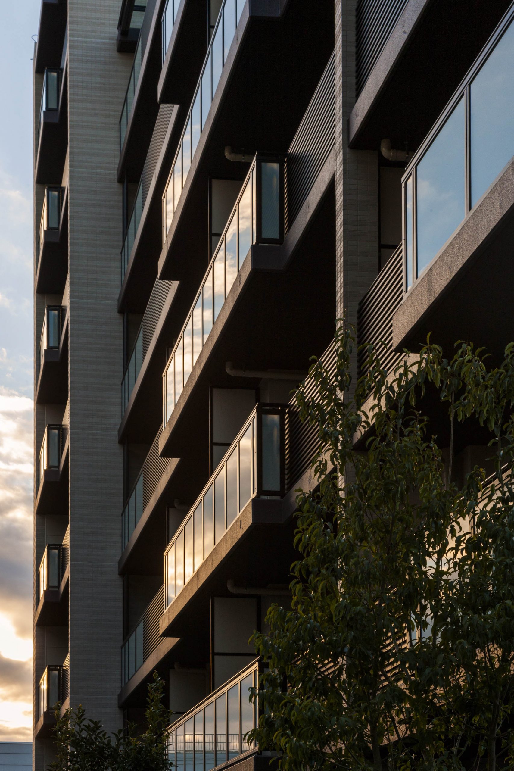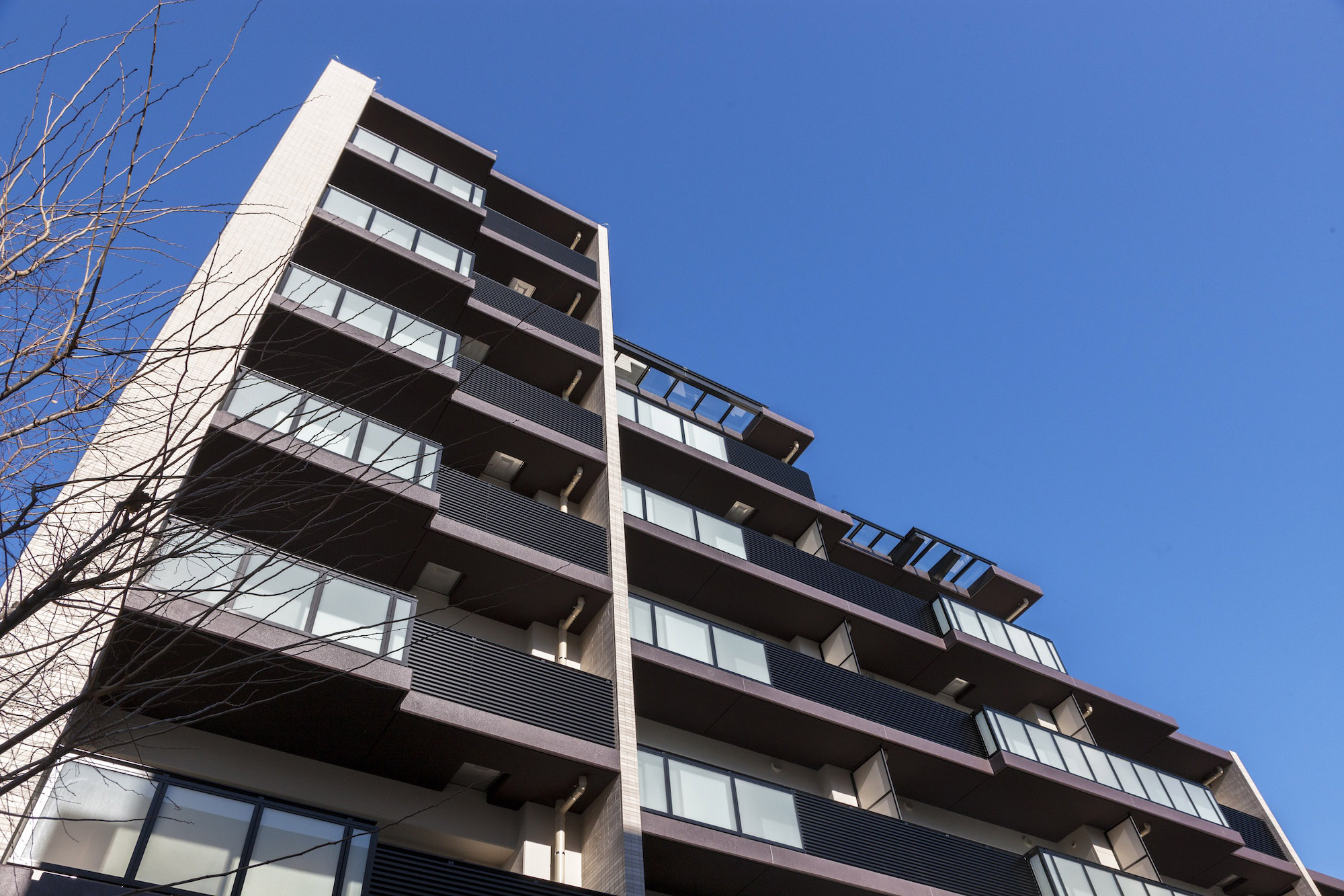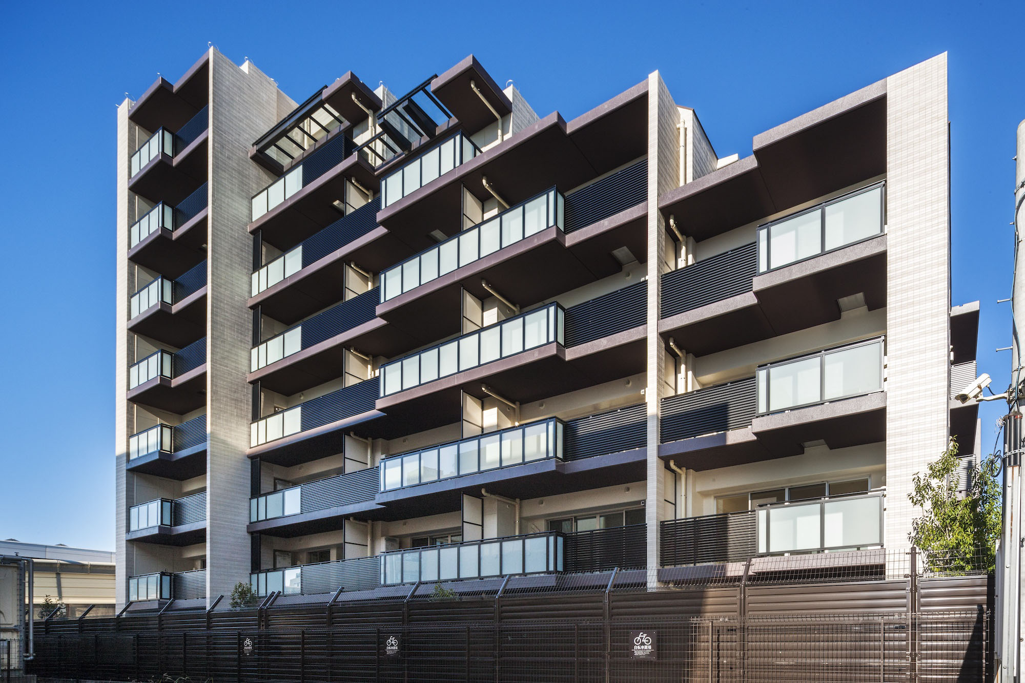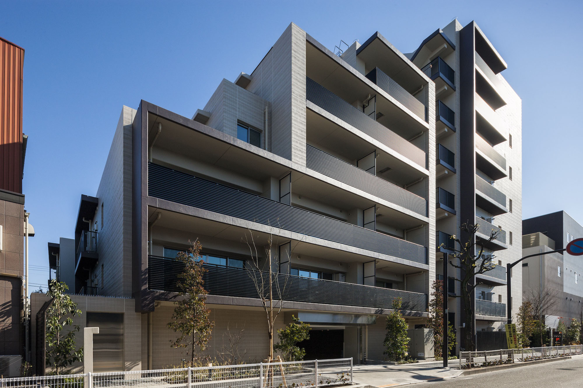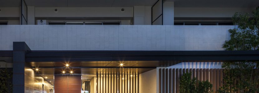 街並みと調和するベージュ系のタイルを基調に、縦横にシックなダークブラウンのアクセントを施した、洗練されたファサード。バルコニーを乳白のガラス手摺とアルミルーバー手摺を組み合わせることで、豊かな表情を創り出しています。足元には豊かな植栽を配し、建物との美しいコントラストを演出。閑静な住宅街に馴染みながらも存在感のある外観デザインです。