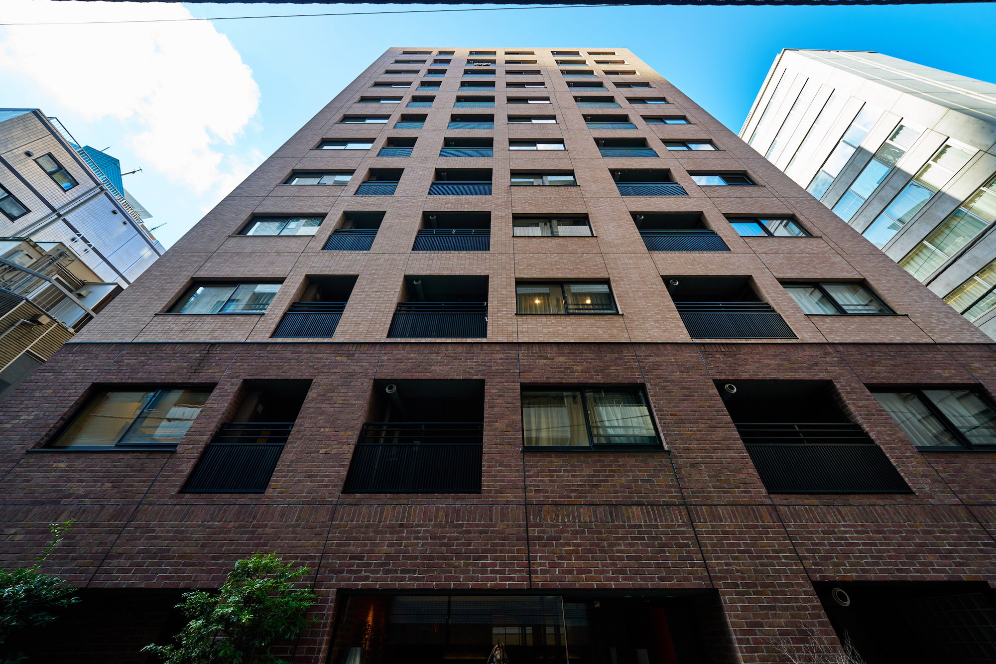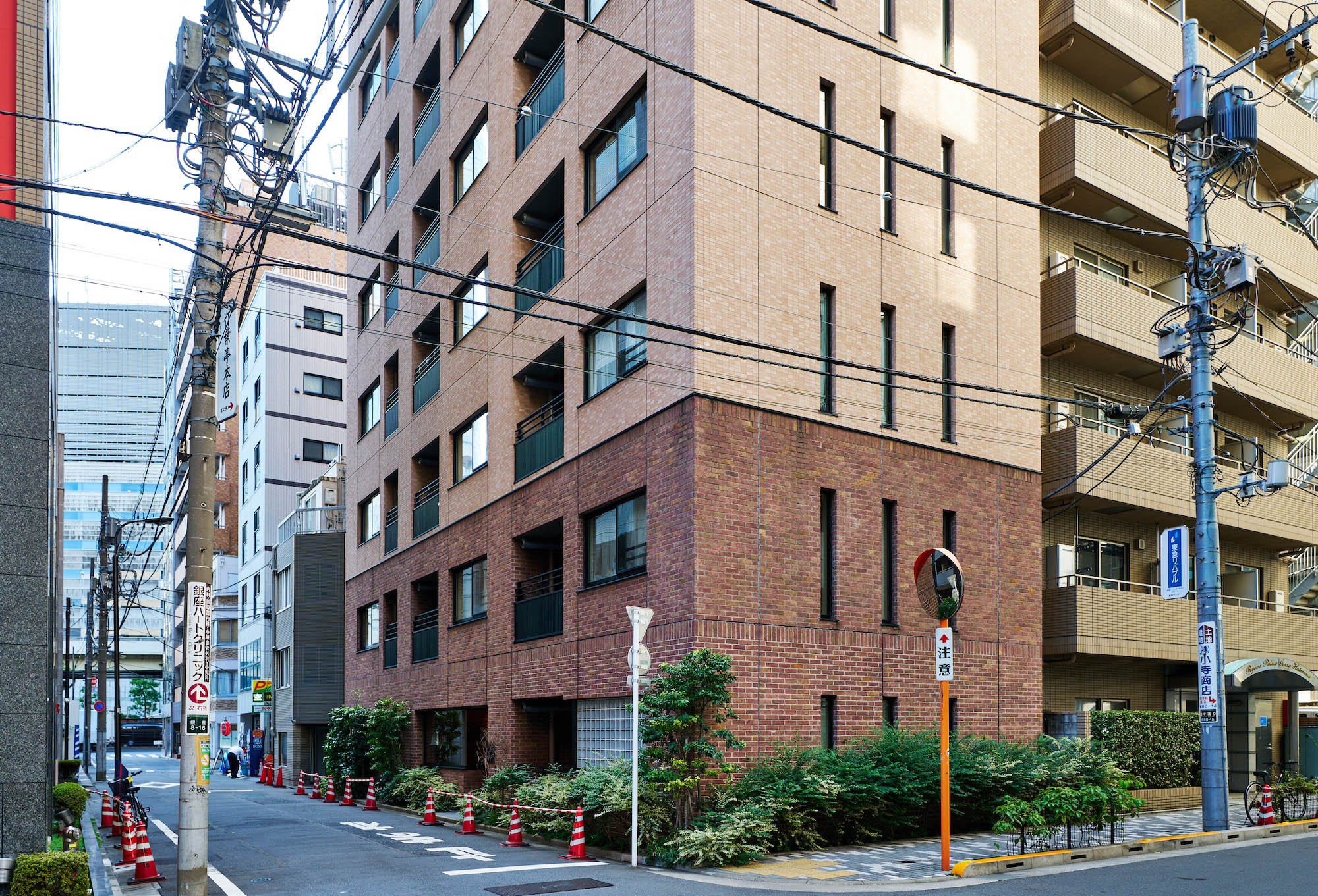 外壁基壇部に煉瓦調のタイルを施したファサードデザイン。重厚感を醸しながらもどこか穏やかな外観は、煉瓦づくりの西欧建築が建ち並んだ、古き良き銀座の街並みをイメージしています。華やかな銀座の中でも比較的閑静な一角に位置する「パークリュクス銀座8丁目 mono」に相応しい、悠々とした貫禄を感じさせる佇まいです。
