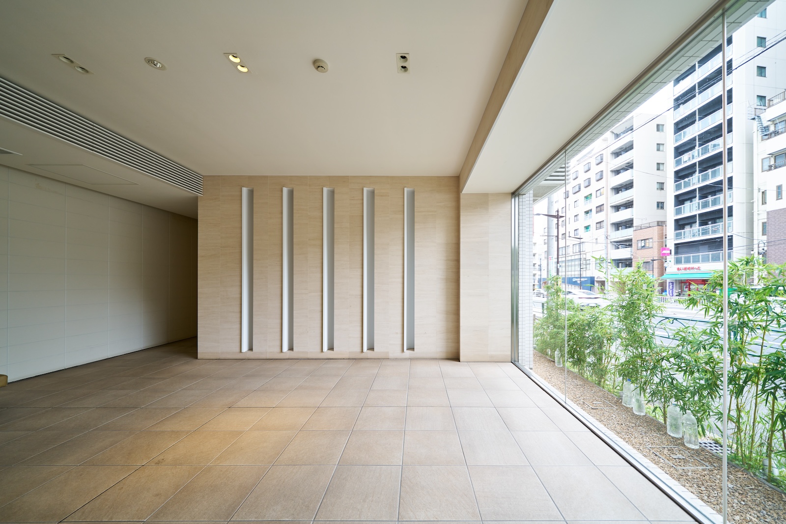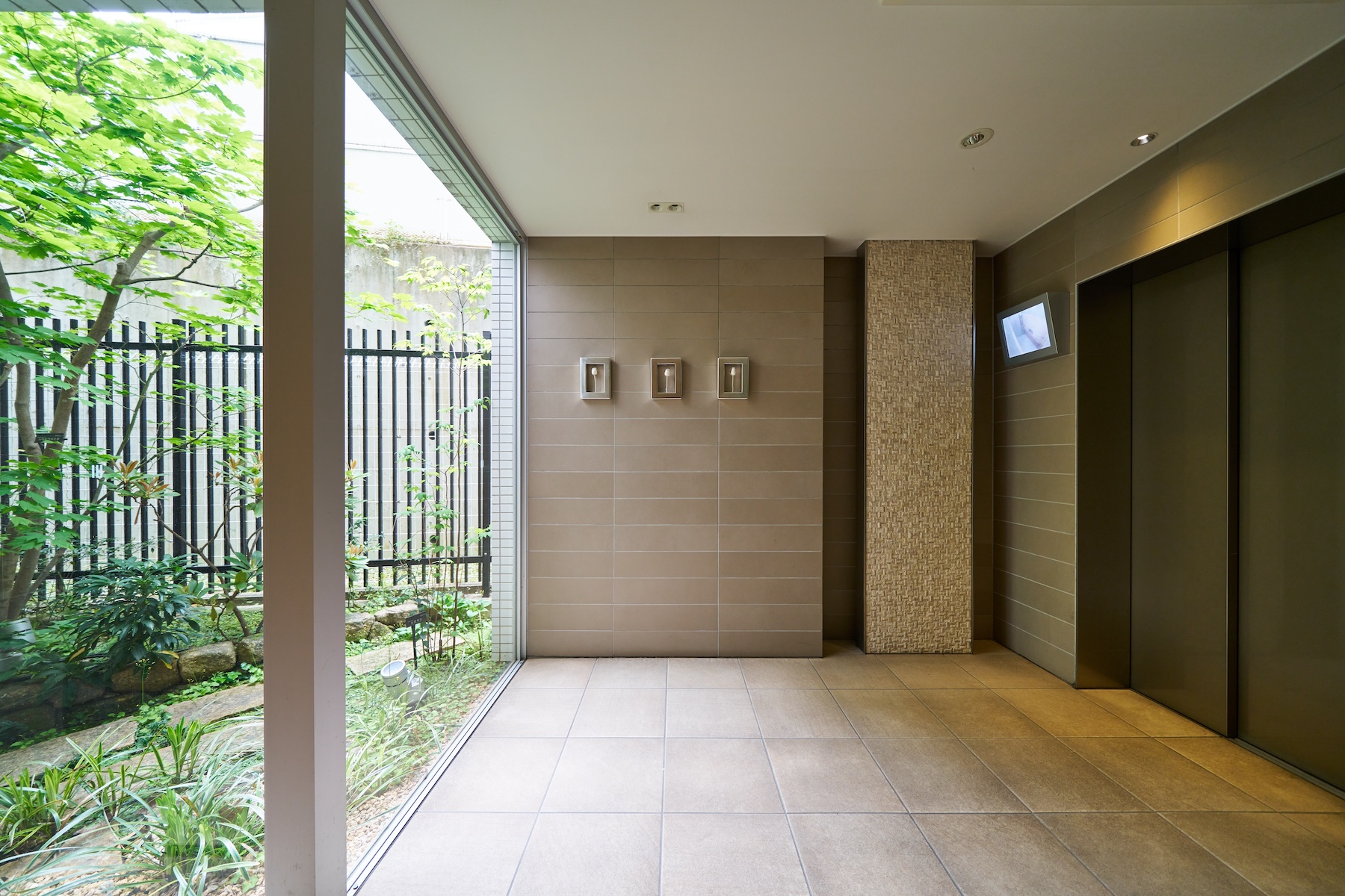 エントランスホールは折り上げ天井で、ピクチャーウィンドウから植栽を望む、広がりのある空間設計。 木調の壁や落ち着いたインテリアの採用により、まるでホテルのラウンジのような雰囲気を演出。夜にはやさしい間接照明の光が陰影をつくり出し、やすらぎへと導いてくれます。エントランスの前庭やエレベーターホールの中庭など、随所に植栽スペースが設けられ、「視覚的なやすらぎ」にも配慮されています。