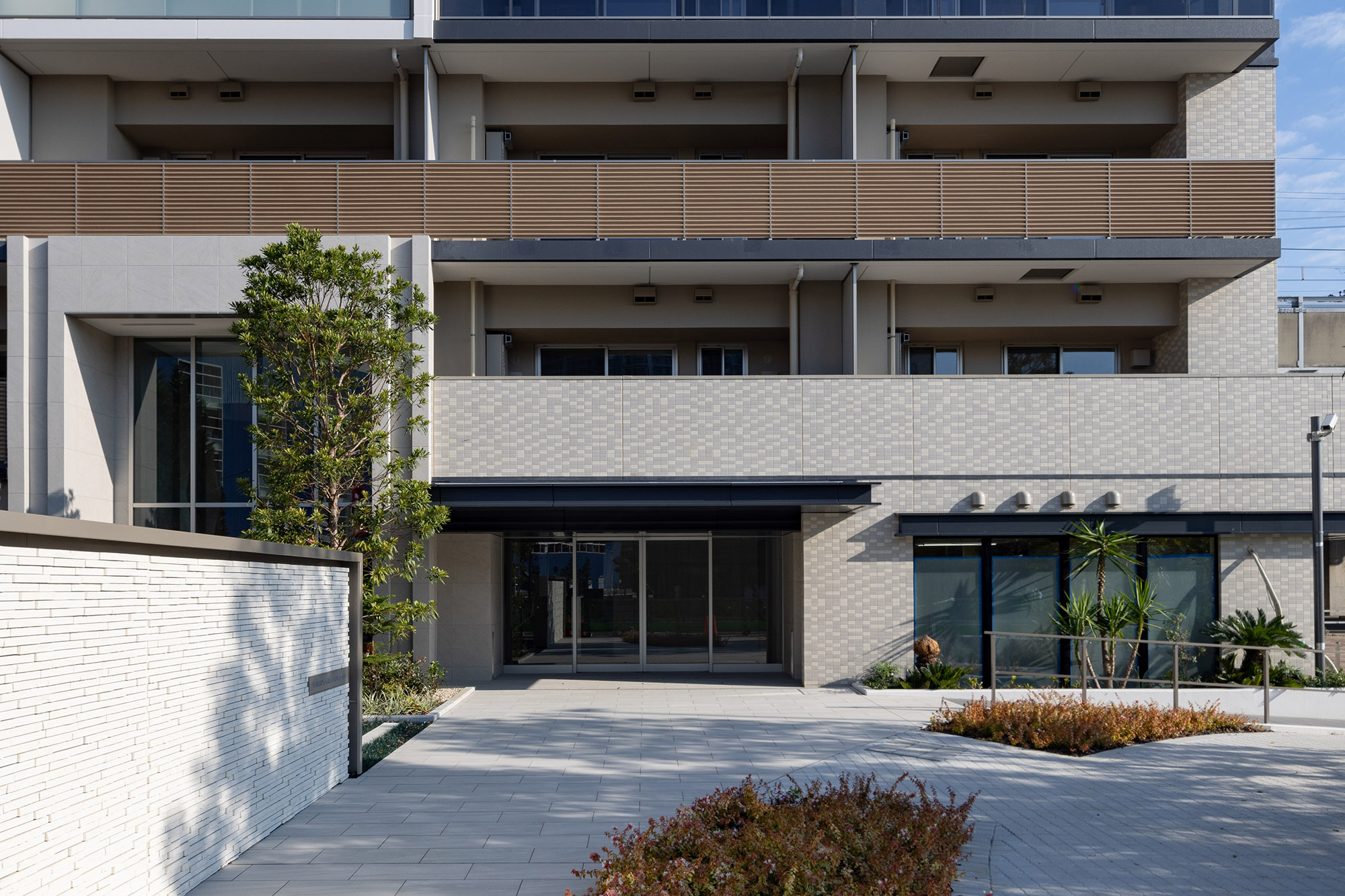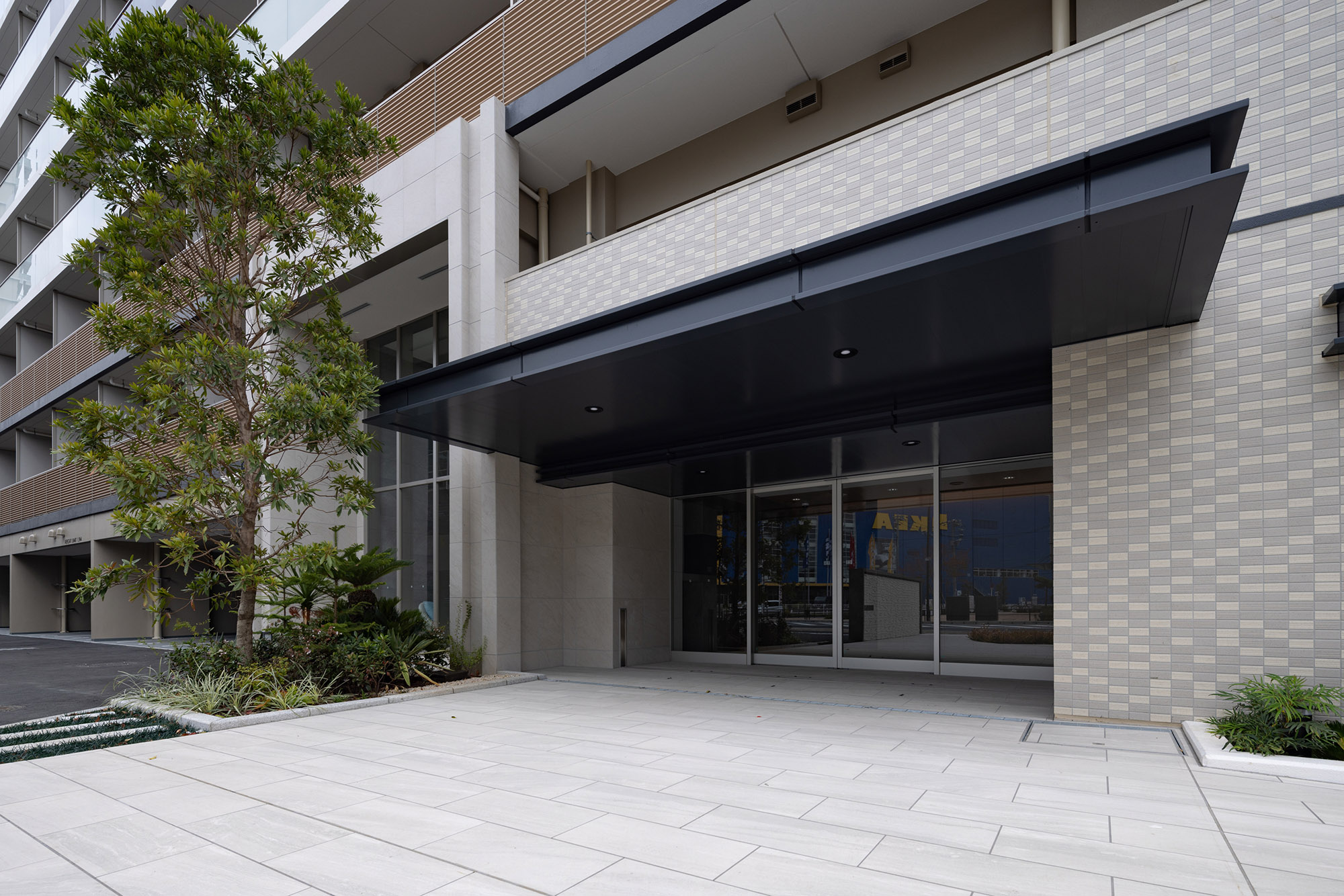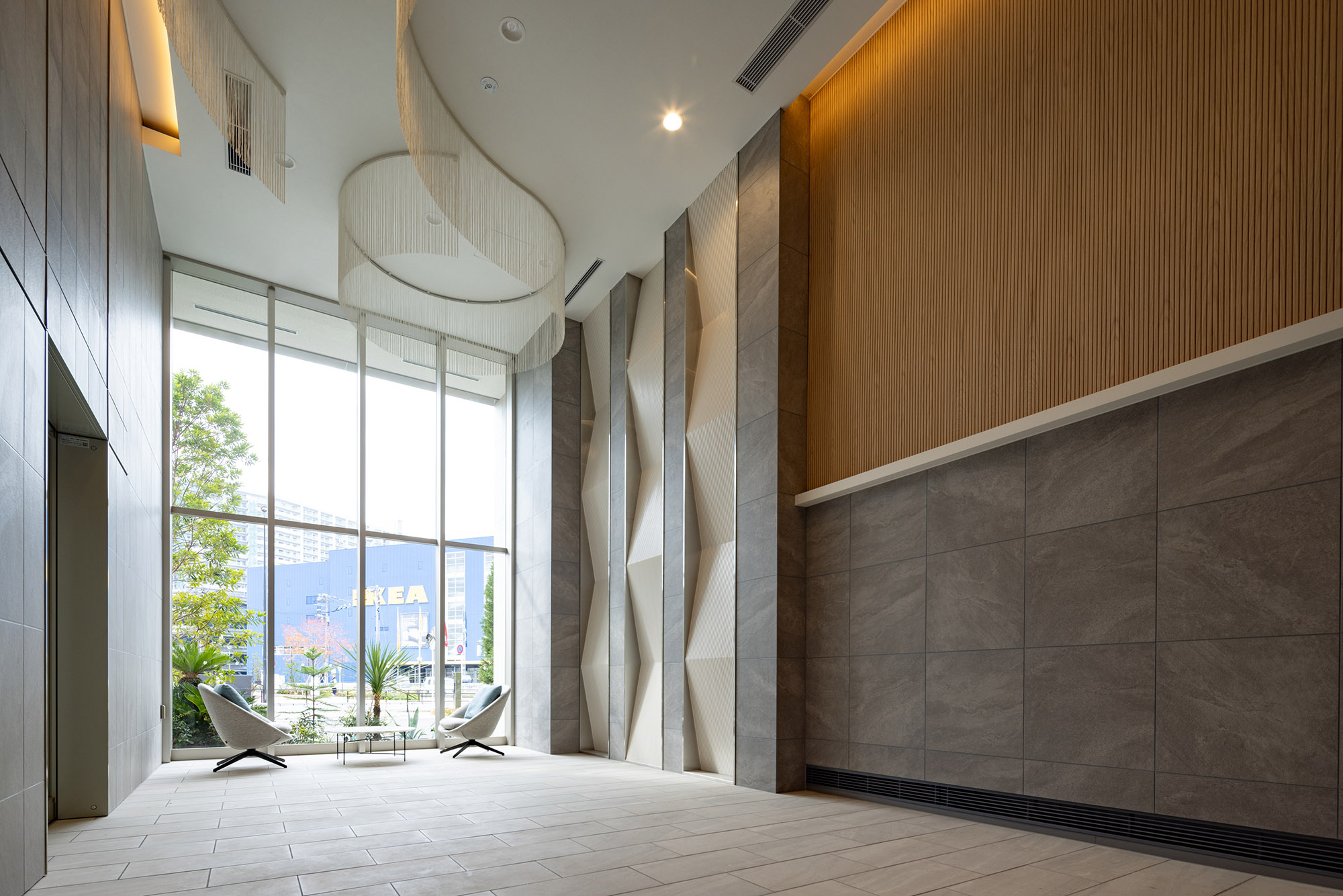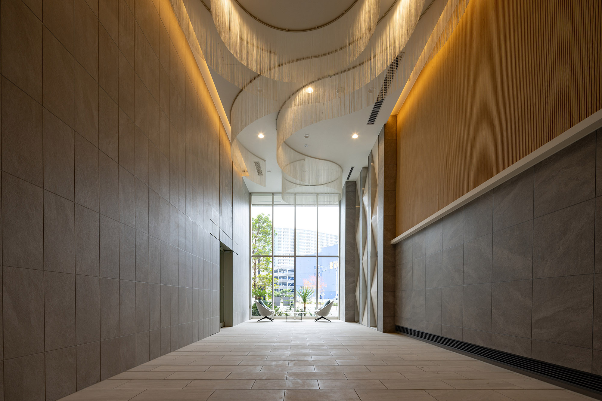 エントランス前の広場に配した約8mのシンボルツリー「マテバシイ」をはじめ、駅前のバスロータリーや「ららテラスTOKYO-BAY」に隣接する都市性に優れた立地に潤いあふれるランドスケープを構築。さらに車寄せスペースやエントランス前の広場状空地など、利便性や見た目の美しさに配慮した工夫も取り入れています。2層吹き抜けの広く伸びやかなエントランスホールは、天井に曲線状のフリンジを配し、海風や波紋のイメージを表現。住まう方や来訪者をお招きする迎賓空間として、上質かつ重厚感あふれる佇まいを設えています。