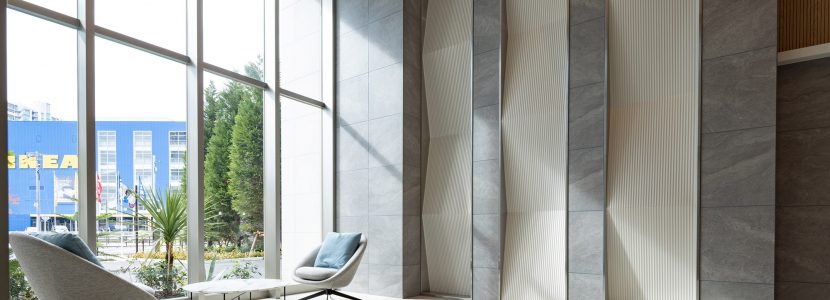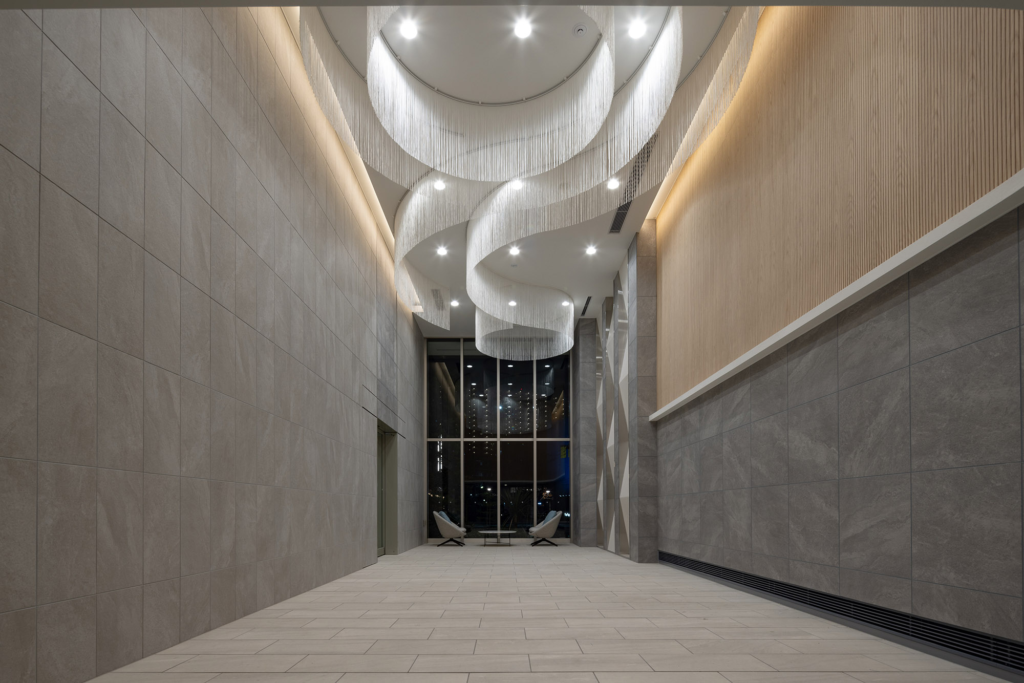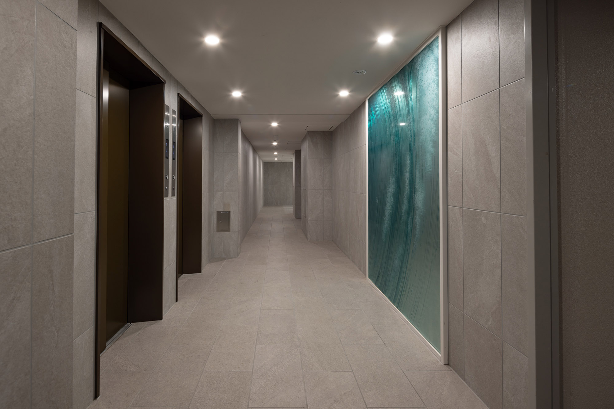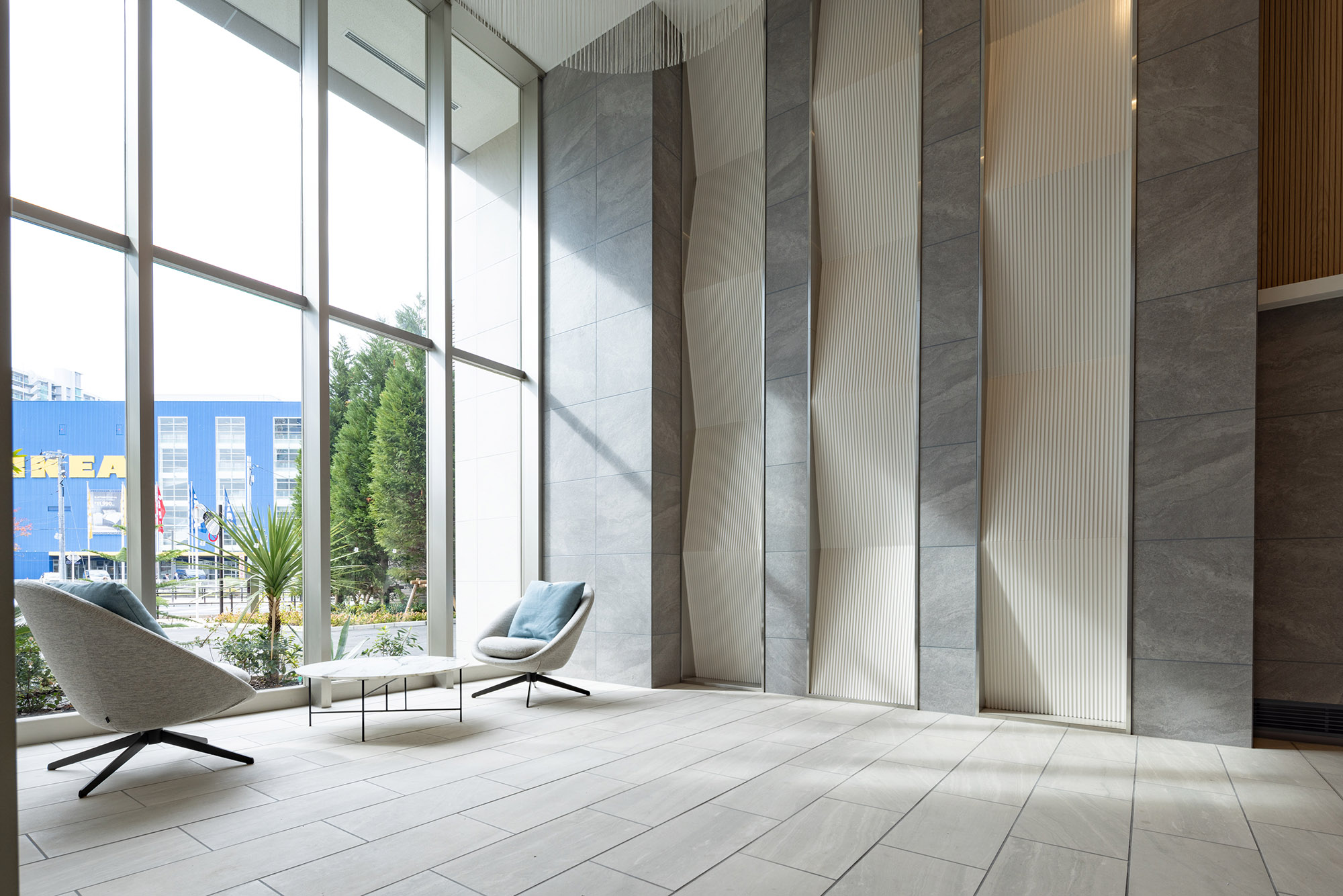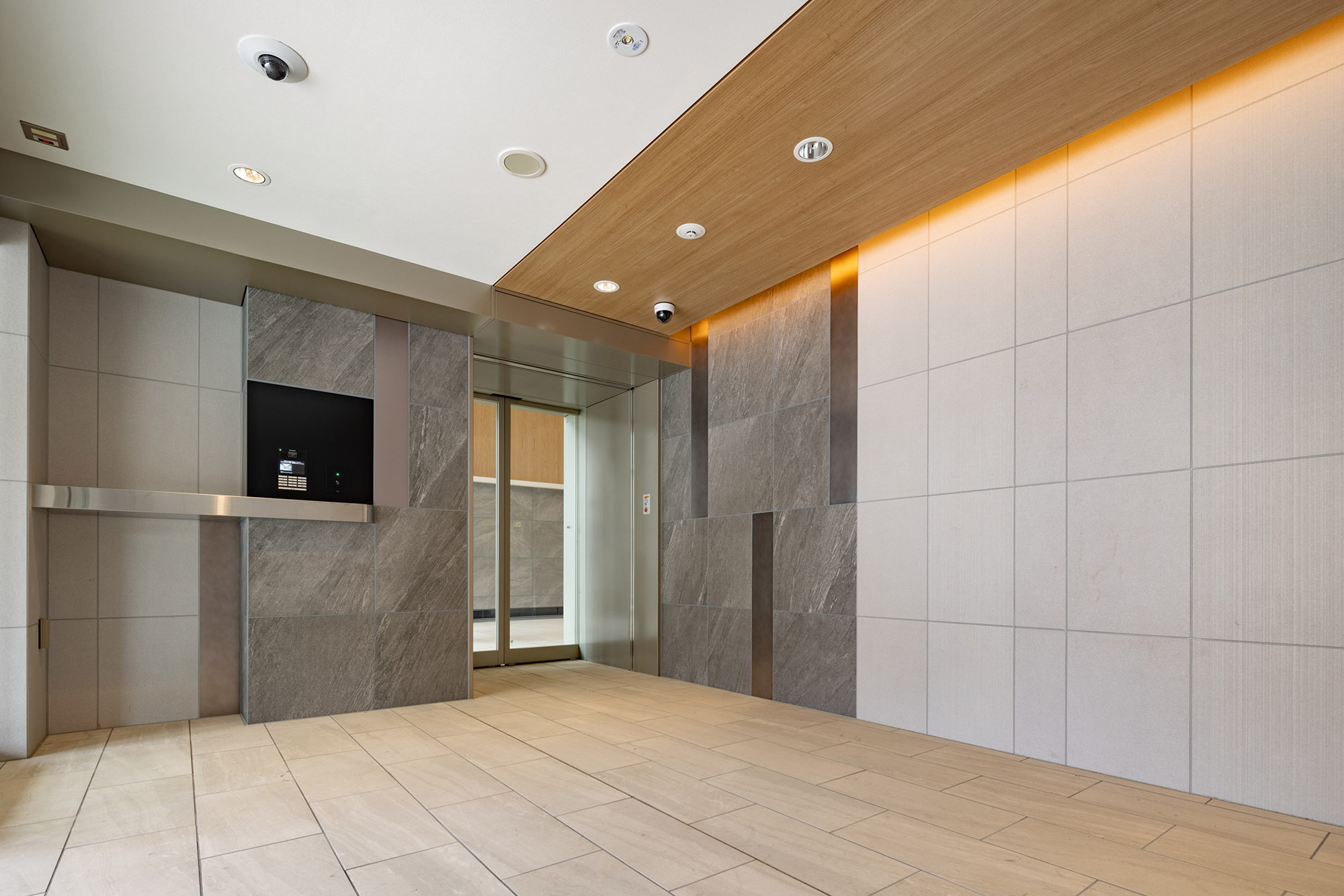 エントランス前の広場に配した約8mのシンボルツリー「マテバシイ」をはじめ、駅前のバスロータリーや「ららテラスTOKYO-BAY」に隣接する都市性に優れた立地に潤いあふれるランドスケープを構築。さらに車寄せスペースやエントランス前の広場状空地など、利便性や見た目の美しさに配慮した工夫も取り入れています。2層吹き抜けの広く伸びやかなエントランスホールは、天井に曲線状のフリンジを配し、海風や波紋のイメージを表現。住まう方や来訪者をお招きする迎賓空間として、上質かつ重厚感あふれる佇まいを設えています。