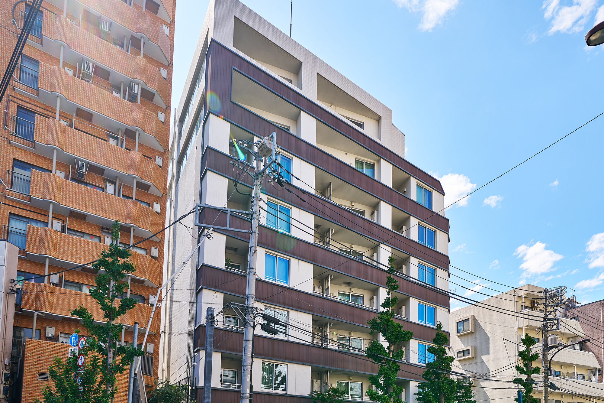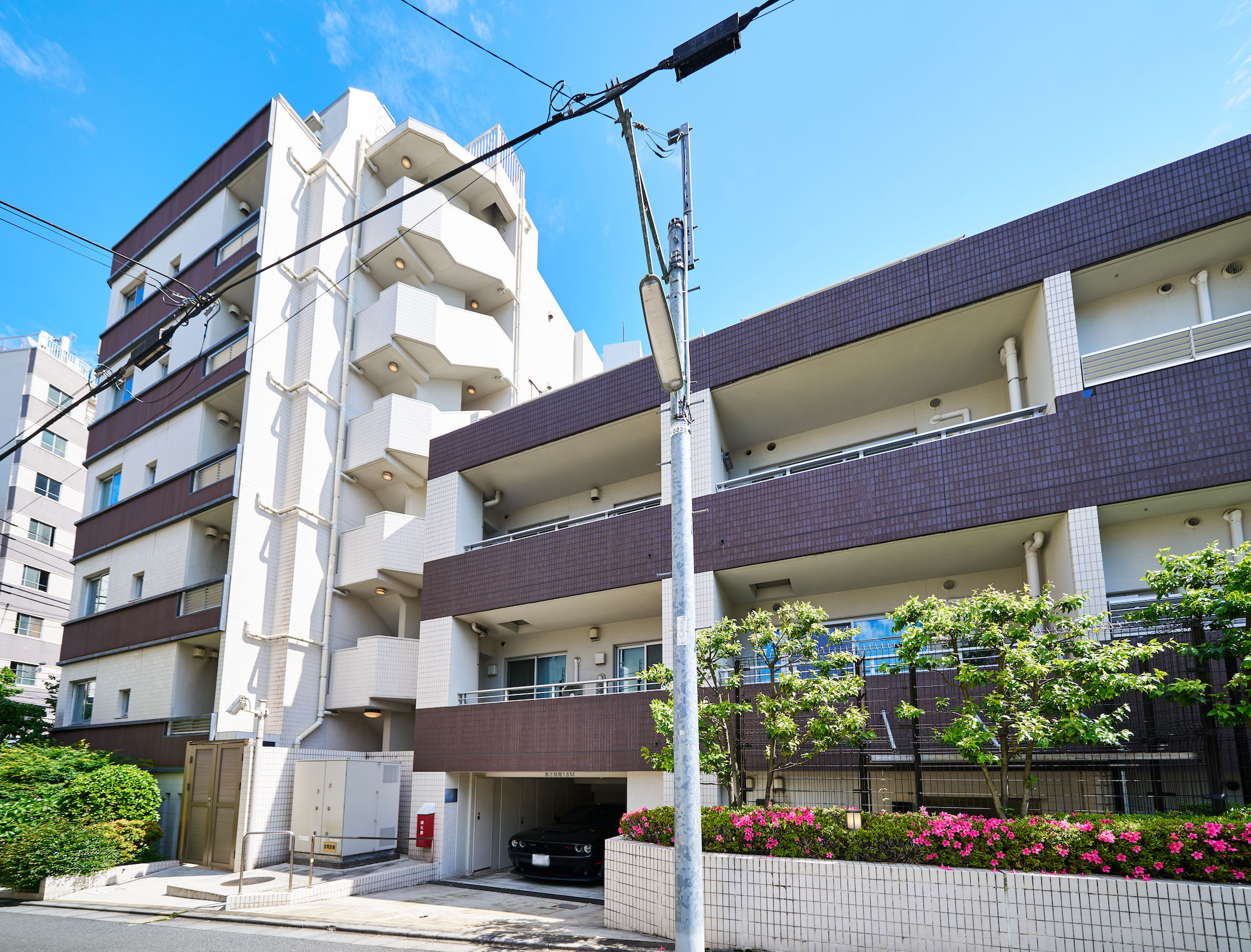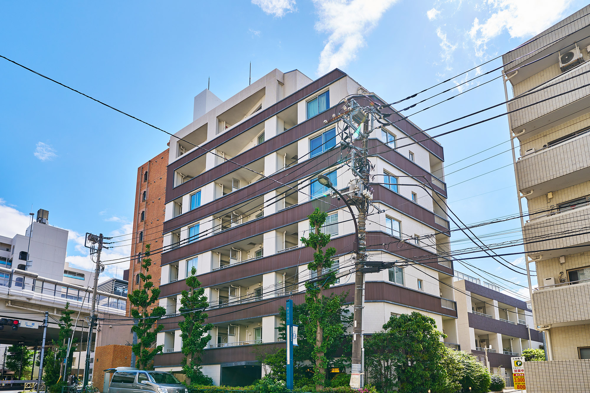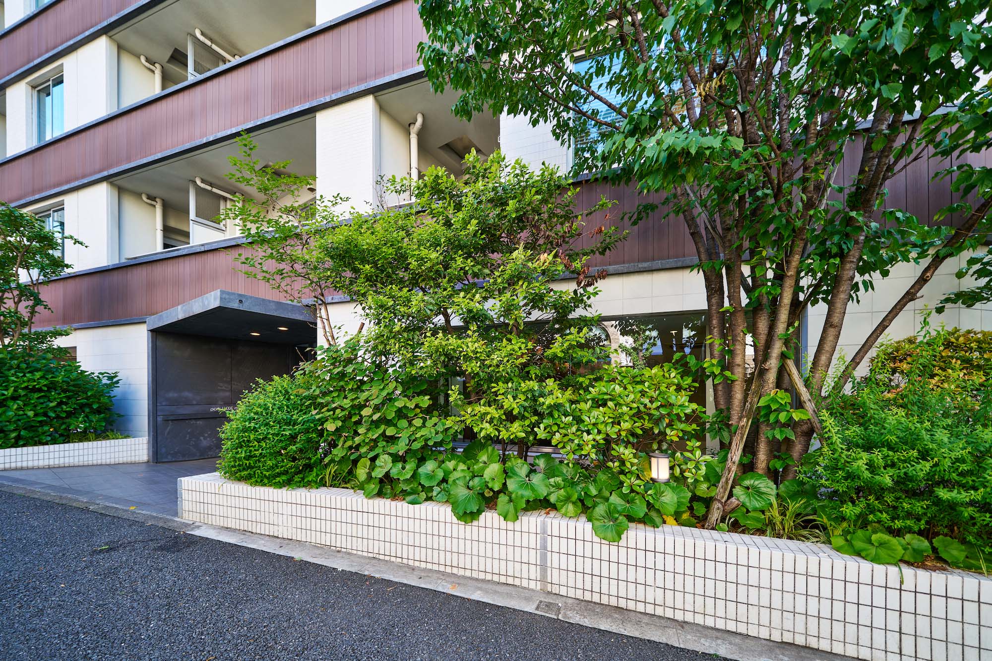 世田谷公園へと続く通りに佇む印象的な建築美。外観や共用空間の意匠は、建築家・河辺哲雄氏が手掛けています。外観は地上7階建てのフォルムに、水平ラインを強調するようにあしらったステラウッドが、白とブラウンの美しいコントラストを創出。それは都市的でシャープな表情と、自然のやわらかな表情の両立を果たし、三宿の街並みに新しい美意識を放っています。