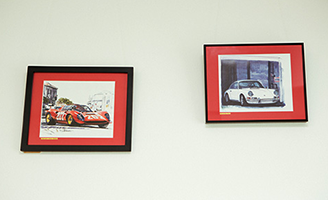 絵や写真はピクチャーレールでディスプレイ。車のイラストが多く、仕事を離れた現在でも自動車に愛着があることを窺わせる。
