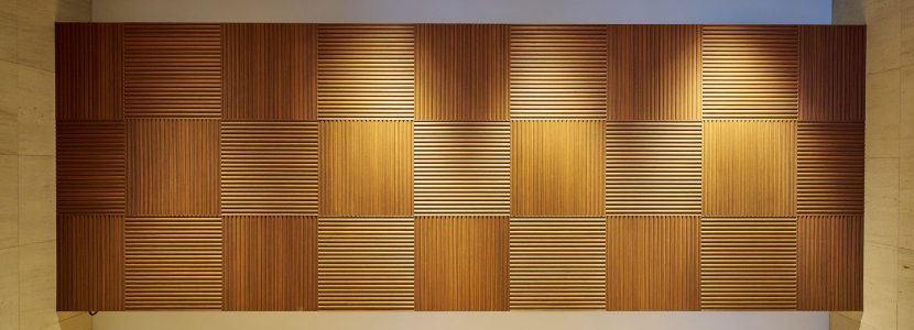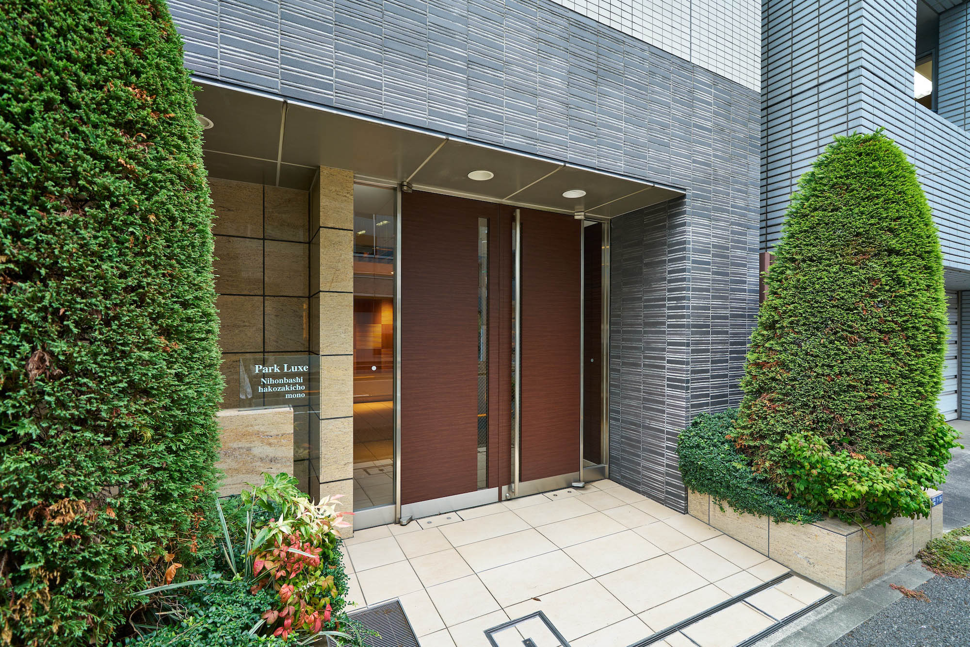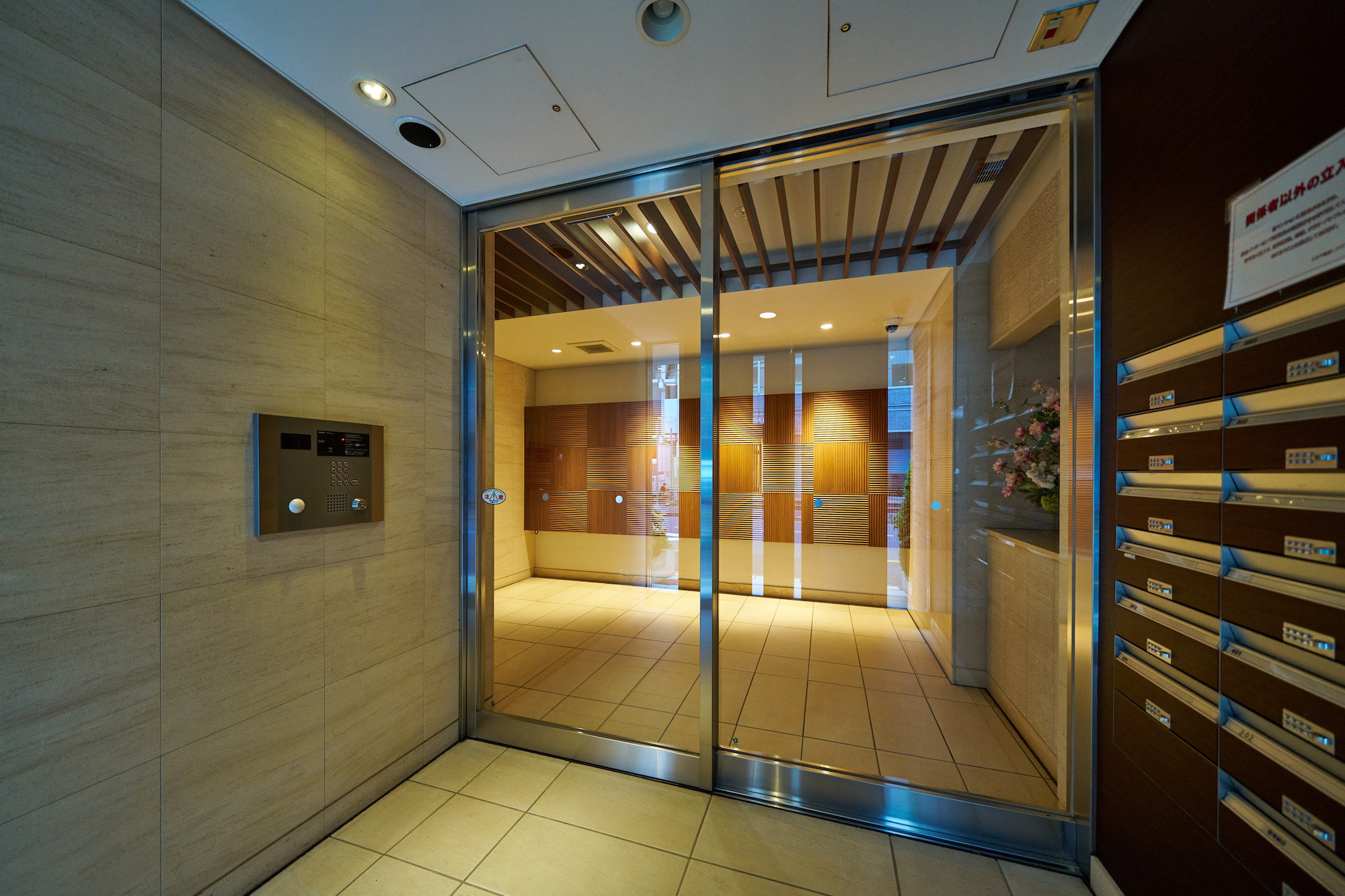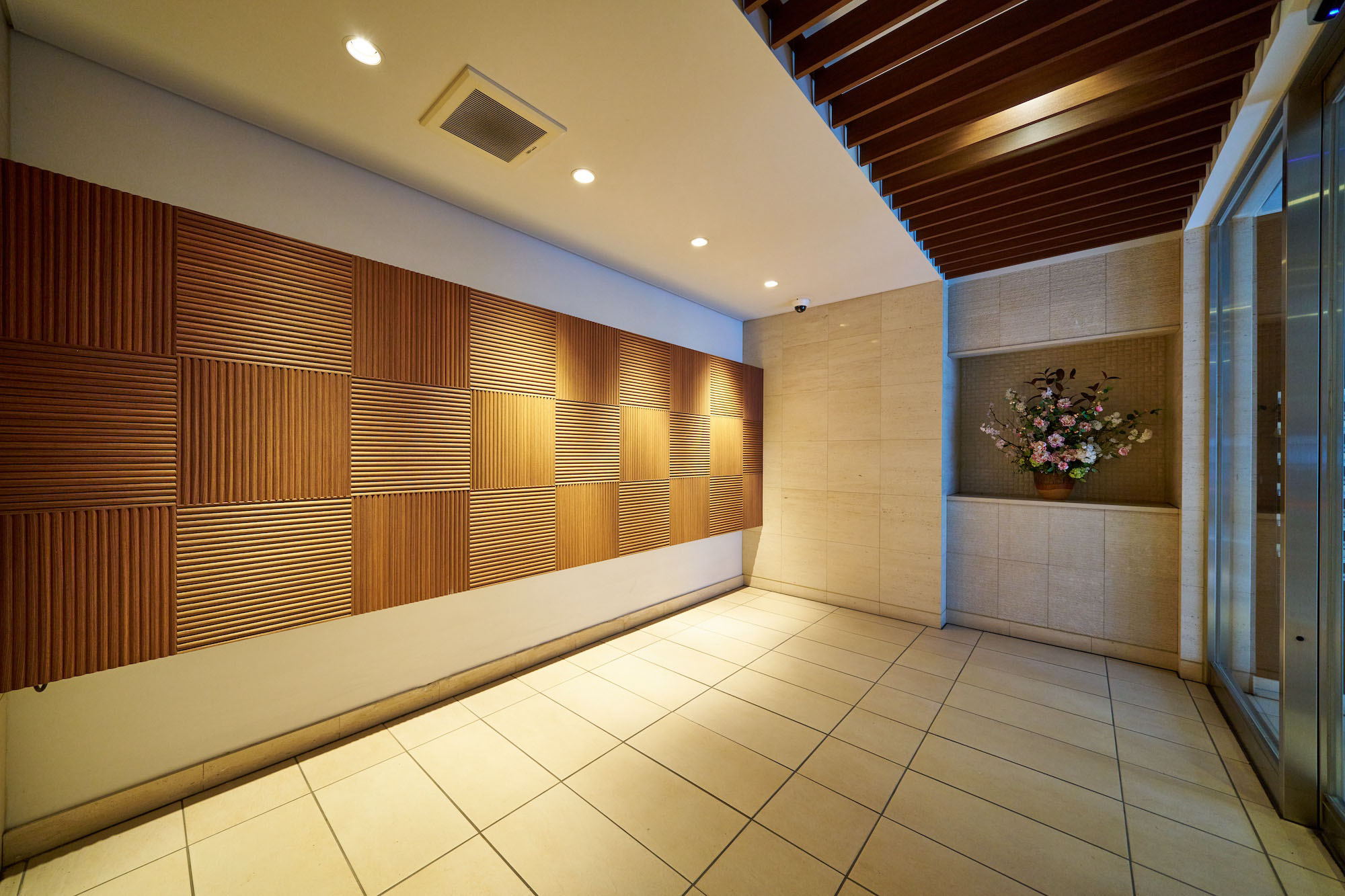濃いグレーのボーダータイルが重厚感を演出する、シックなエントランス。両サイドの植栽は、住む方や訪れる人を丁重にもてなします。入ると正面には、温かみのある木のデザインウォールがお出迎え。天井にも木製のルーバーが施され、暖色の照明とともに優しく内部へと導きます。プライバシー性の高い内廊下設計で、建物に入った瞬間から都市の喧騒を忘れ、安らぎを感じられるレジデンスです。