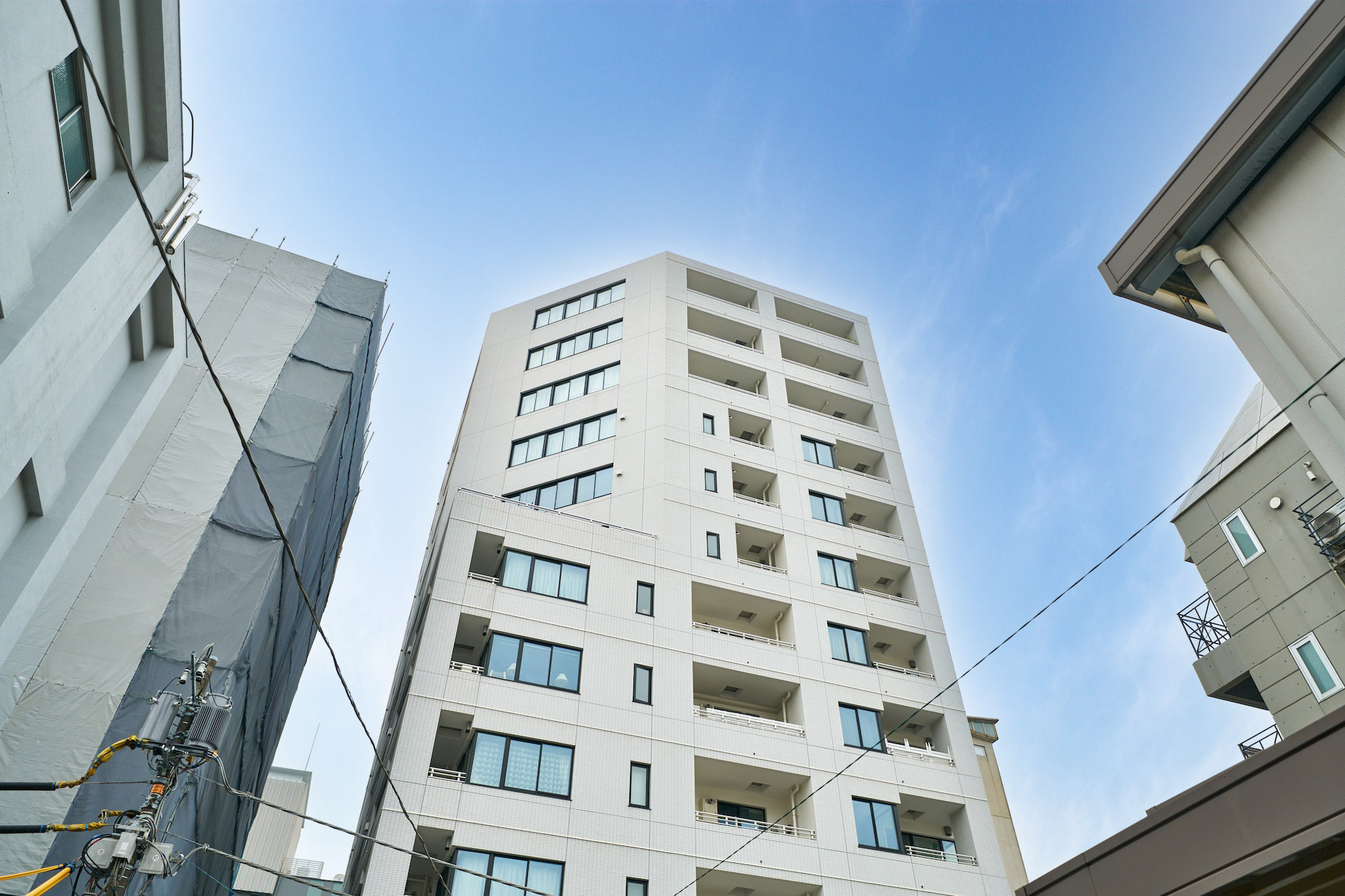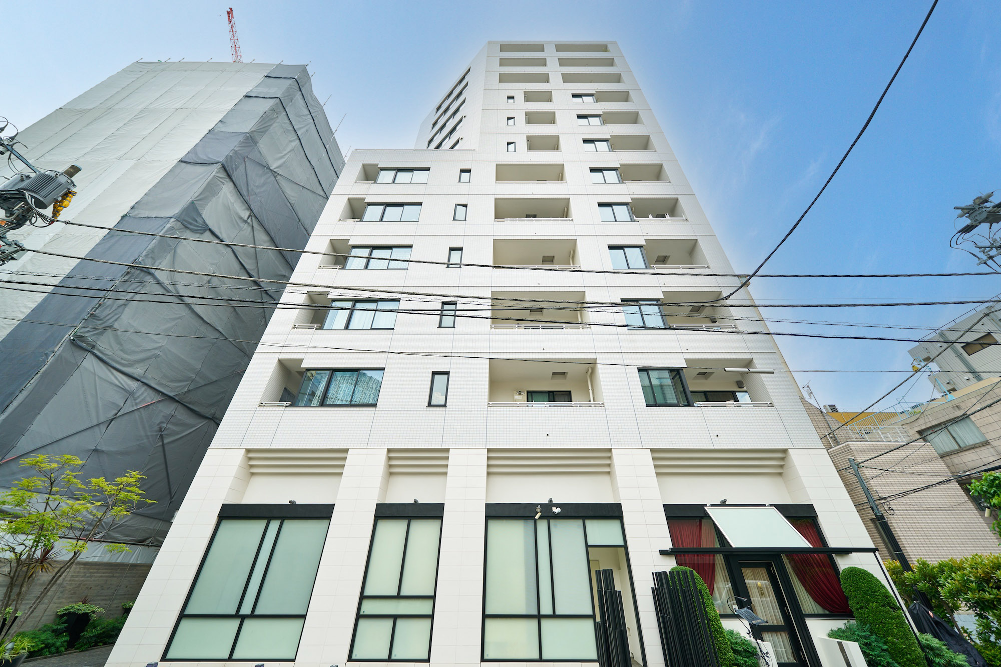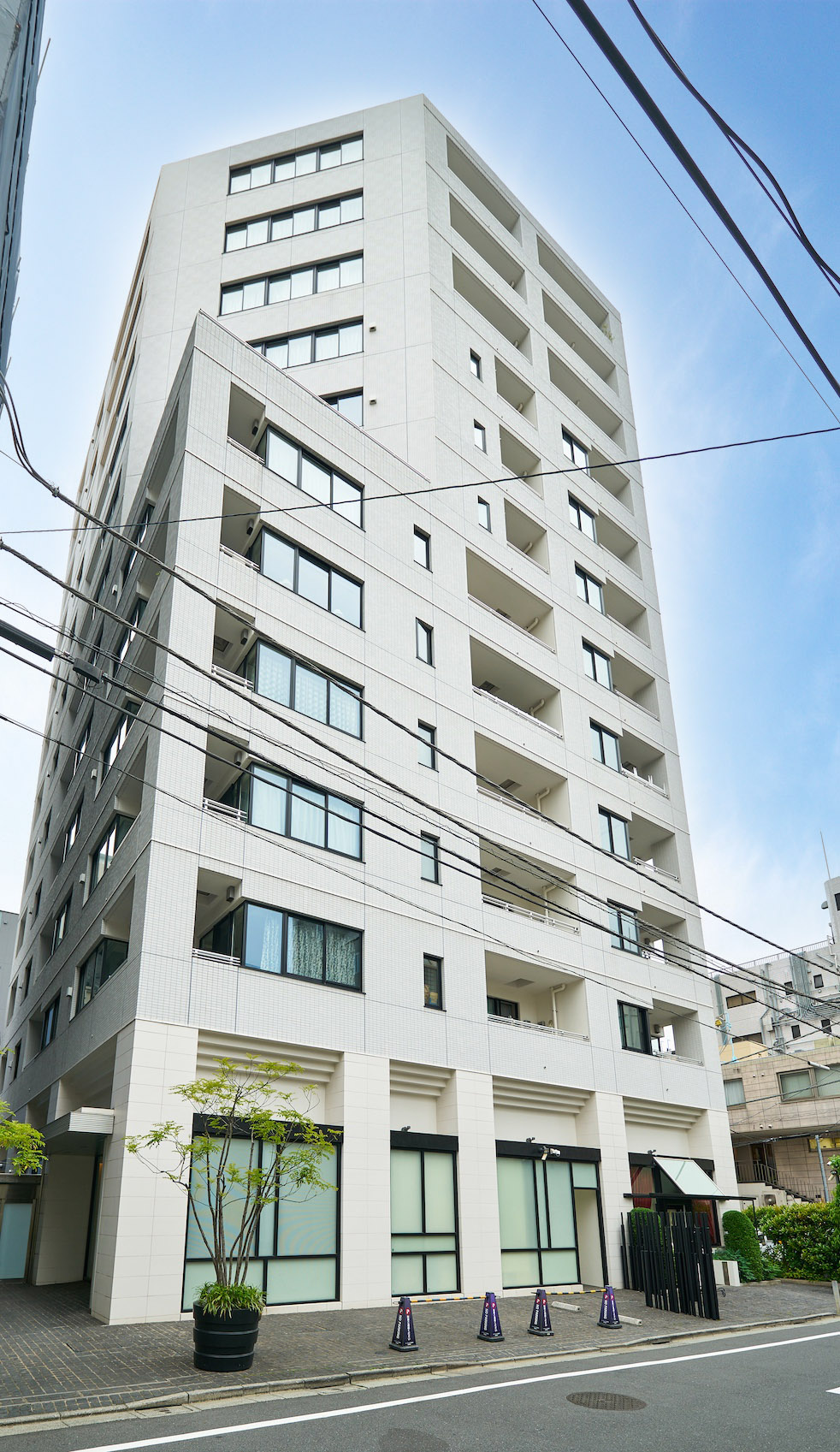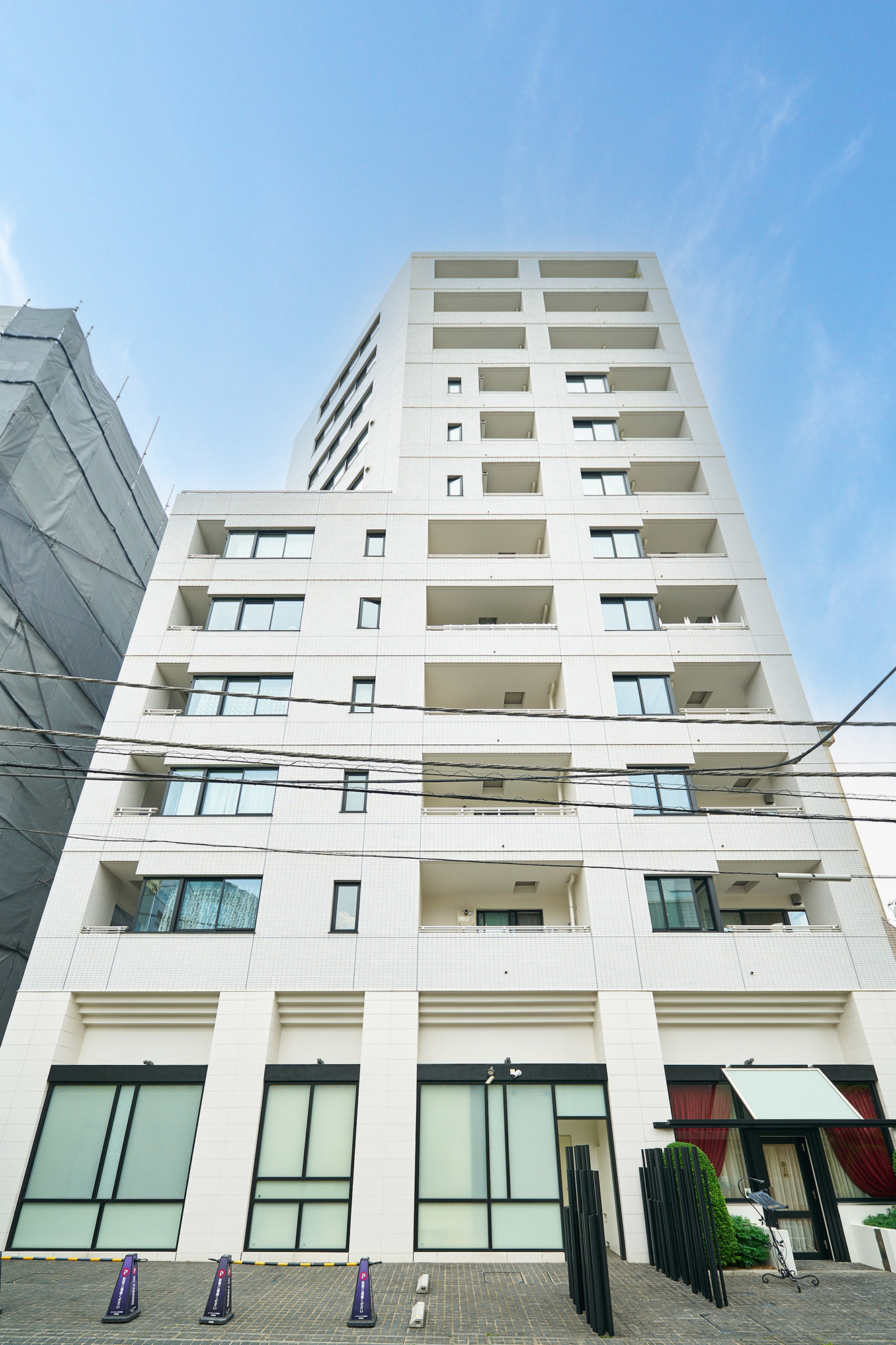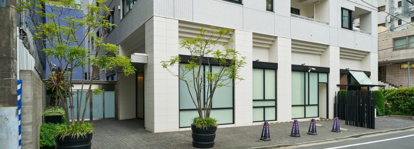 建物デザインは、西麻布の持つ「大人の街」という印象から、生真面目すぎず、遊び心のあるマンションを追求。基調となる白い外壁は、同じ白・質感のタイルを使用し、上層部の一部には正方形タイルを貼るなど、場所によってサイズや貼り方を変えることで、太陽光の加減や眺める角度によって建物の表情に変化を加えています。また、白いタイルに対し黒いフレームのサッシュを採用することで、外観のシャープさを強調。エントランスまわりに採用したガラスは、透明やストライプ模様、フロスト処理など、数パターンの模様のガラスを組み合わせ、変化をつけています。基壇部は、陰影を浮き立たせる意匠に加え、大判のタイルを使うことで、大きなフレームワークを感じさせるデザインにし、重厚感を生み出しています。