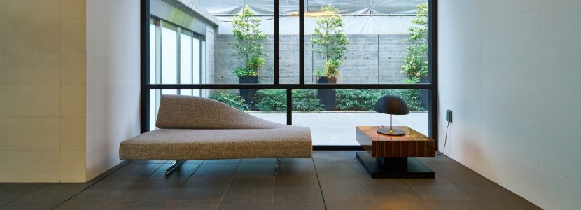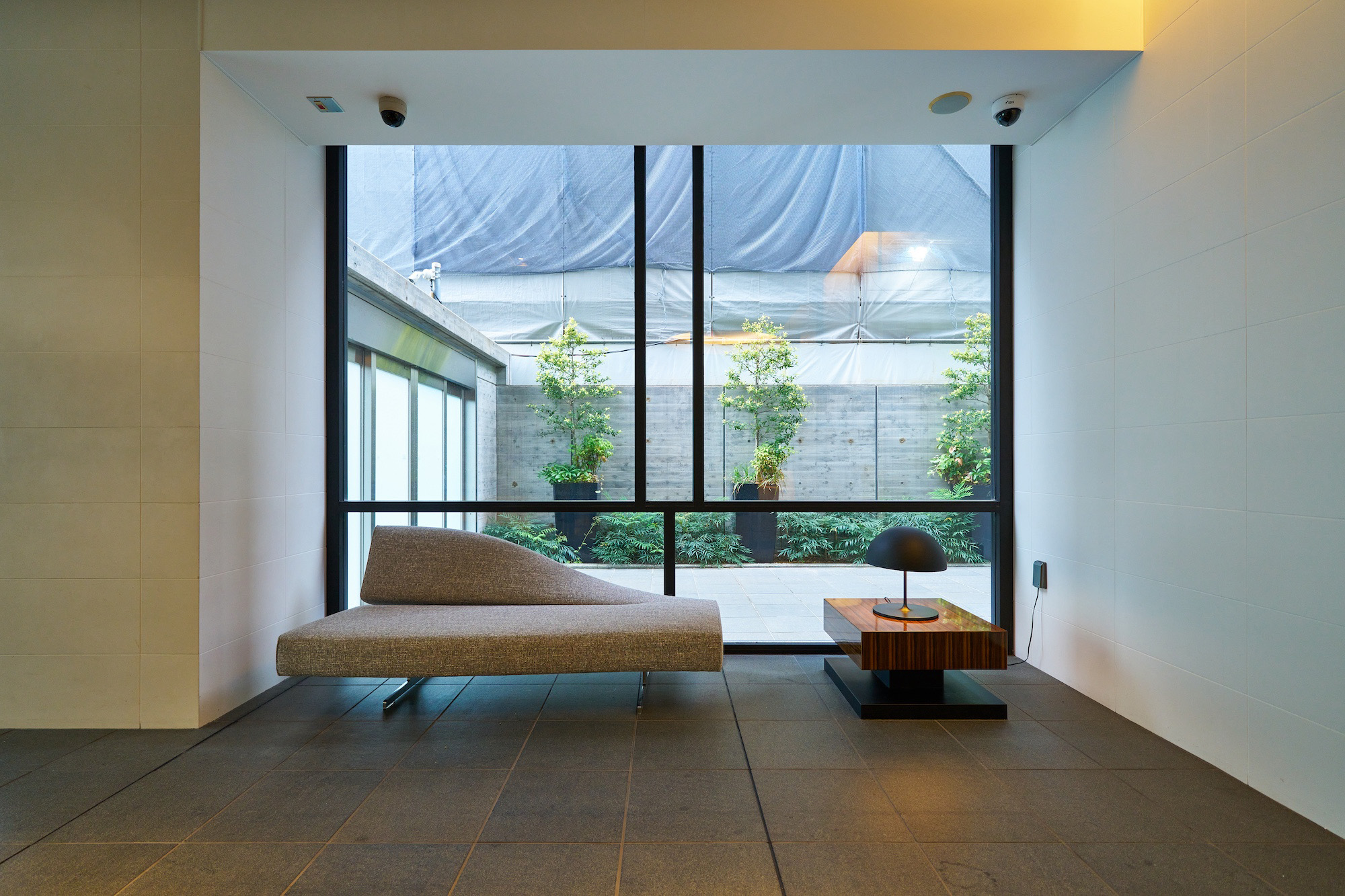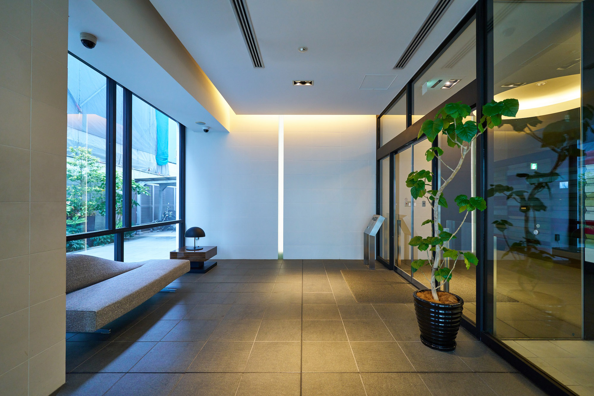 シマトネリコのゲートに誘われるエントランスは、帰宅時に自分の大切な場所へ帰ってきたという「プライベート感」に、「遊び心」がプラスされています。床には黒の花崗岩、エレベーターホールの壁面には黒いアルミ板を採用し、外観の白とは対照的に黒のアートスぺースのような空間を演出。そこに、カクテルをイメージしたカラフルなメールボックス、デザインされたガラス面、ハイセンスなファニチャーなどが“作品”となって「プライベートなギャラリー」を創り上げています。植栽はシマトネリコをシンボルツリーとし、直接地面に植え込むのではなく、黒い大型プランターに配置。ライトアップされることでスタイリッシュな都心の夜を演出します。