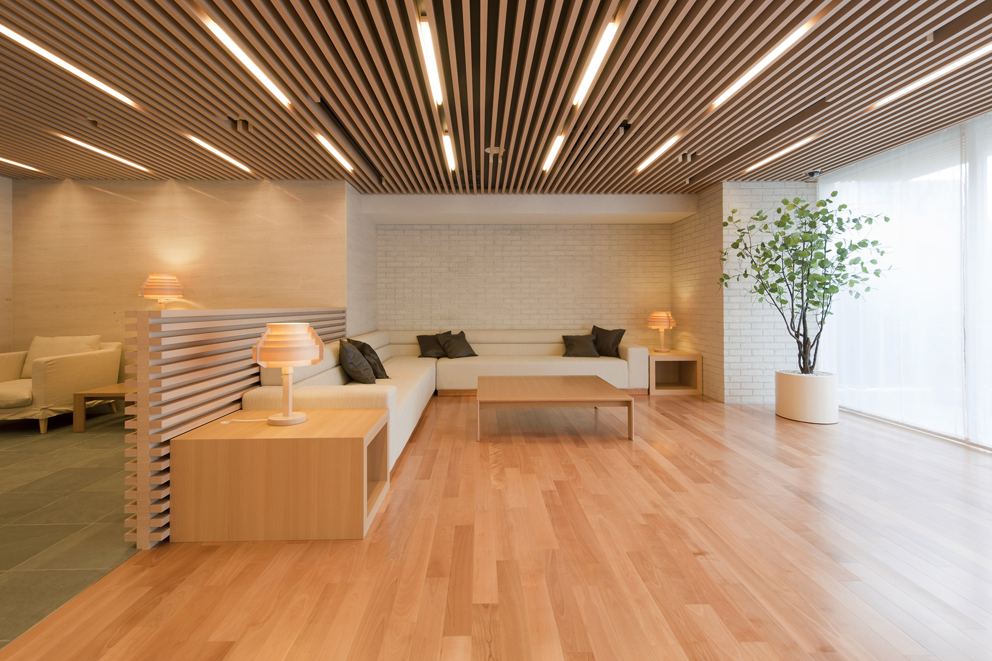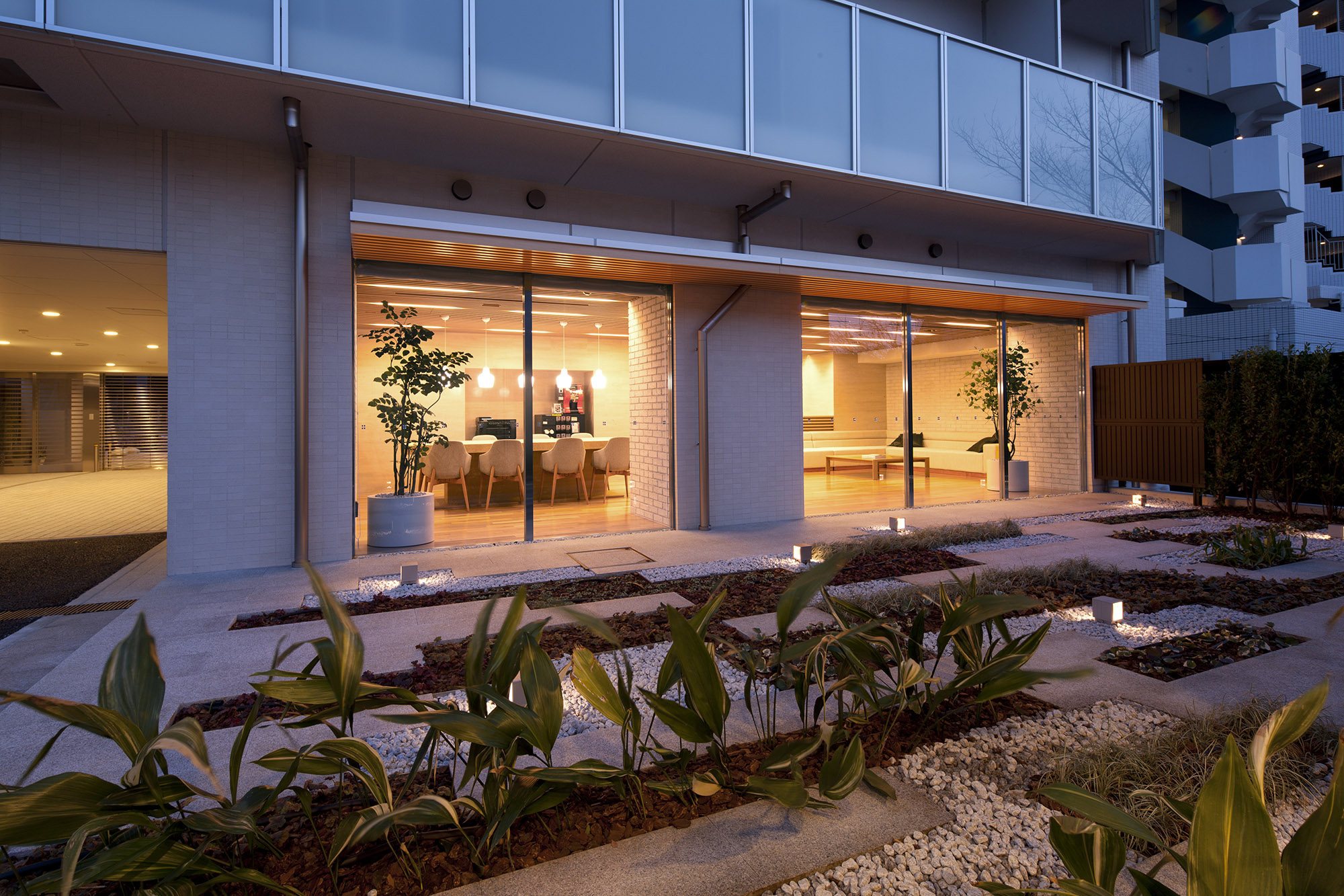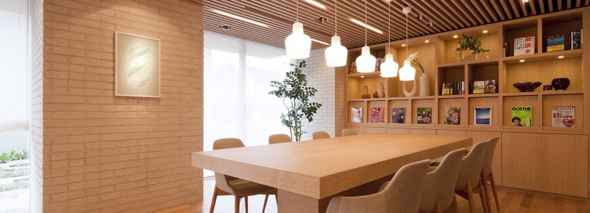 エントランスホールには、北欧風のグラスやオブジェがディスプレイされ、さらに正面には、優しいデザインながら風格を高めるグラスアートが設置されています。住まう方々を優しく迎え入れ、誇らしさと愛着を深める空間です。「ラウンジ・ライブラリー」は、ゆったりとしたソファやパソコンが使用しやすいデスク、コーヒーマシンなどが設置されており、自宅にカフェを持つ感覚で、寛ぎの場所として、来客の応接の場所として利用できます。窓の外には植栽の緑が目に優しい中庭が広がり、華やかな都心の時間を離れ、我が家という愛する場所へと緩やかに気持ちがリセットしていくのを感じられます。
