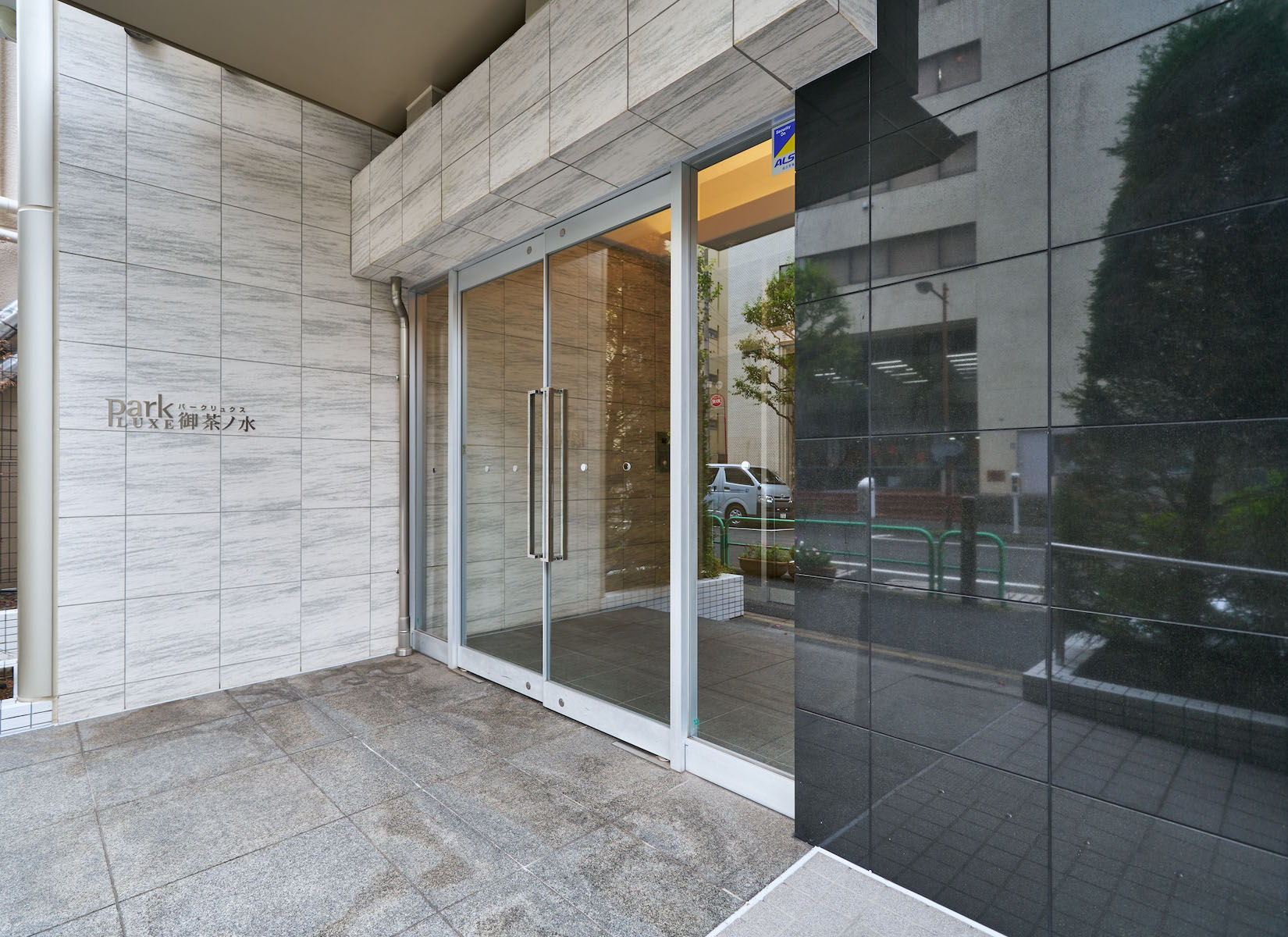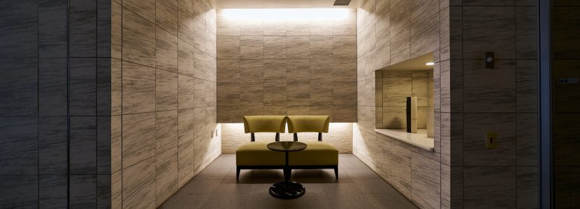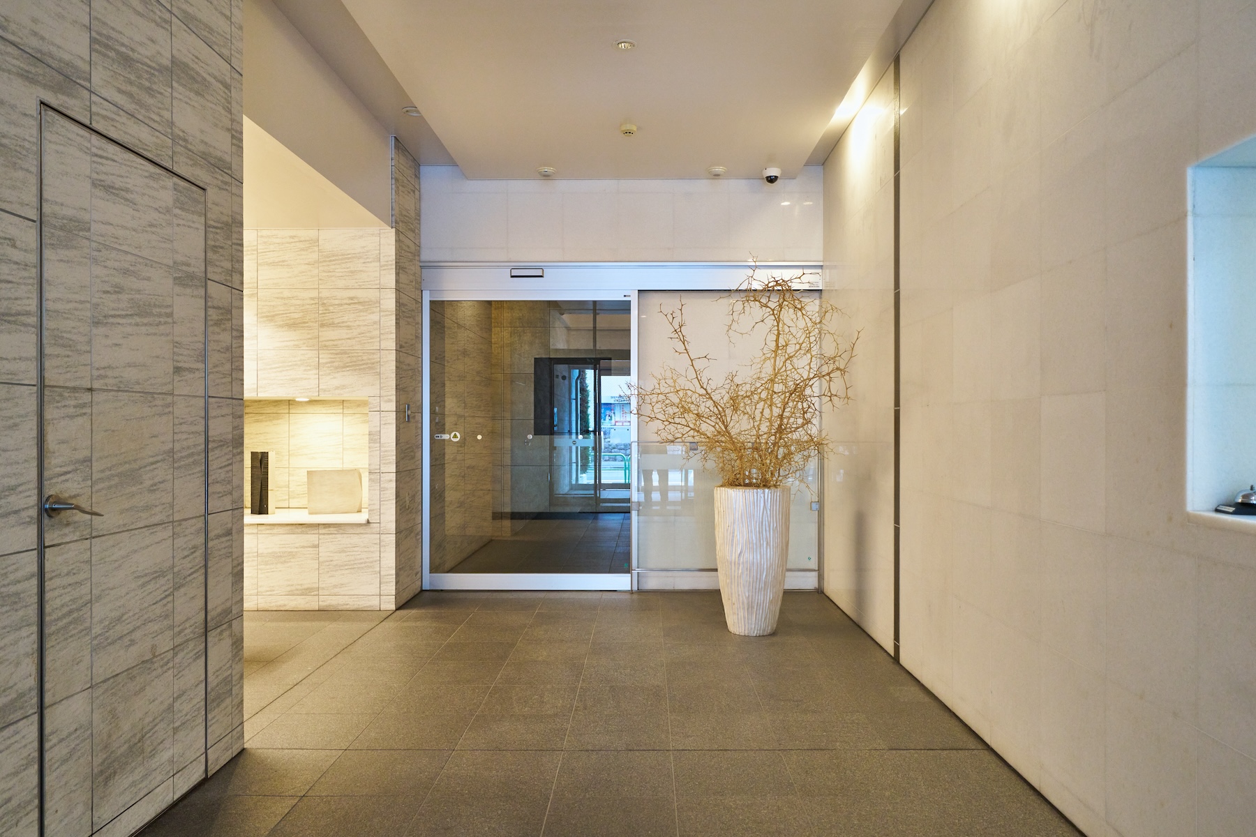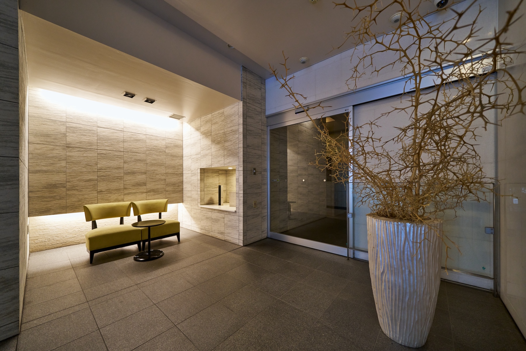 エントランスは白と黒を基調とし、シックな雰囲気が漂っています。間接照明や落ち着きあるラウンジスペース、随所に施されたアートを感じさせる装飾が、高級感のある空間を演出。都会の喧騒から、静かで美しい時間へと誘います。