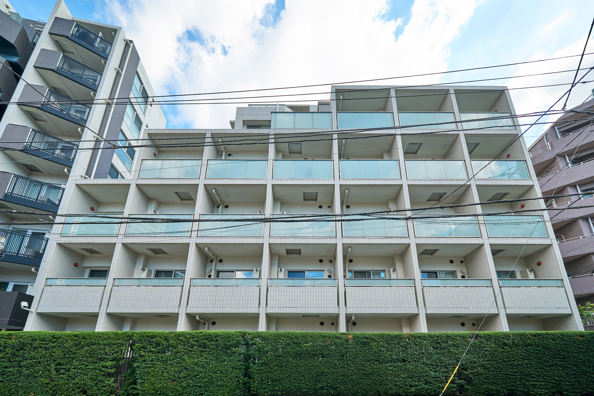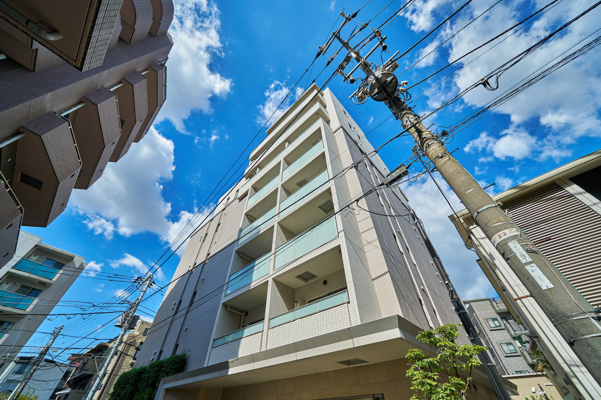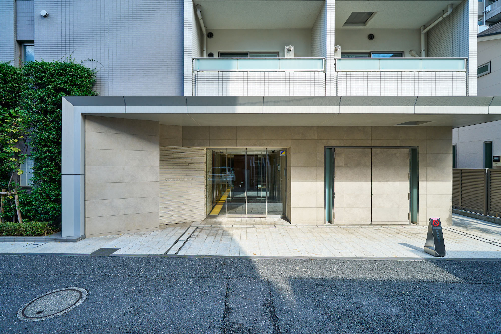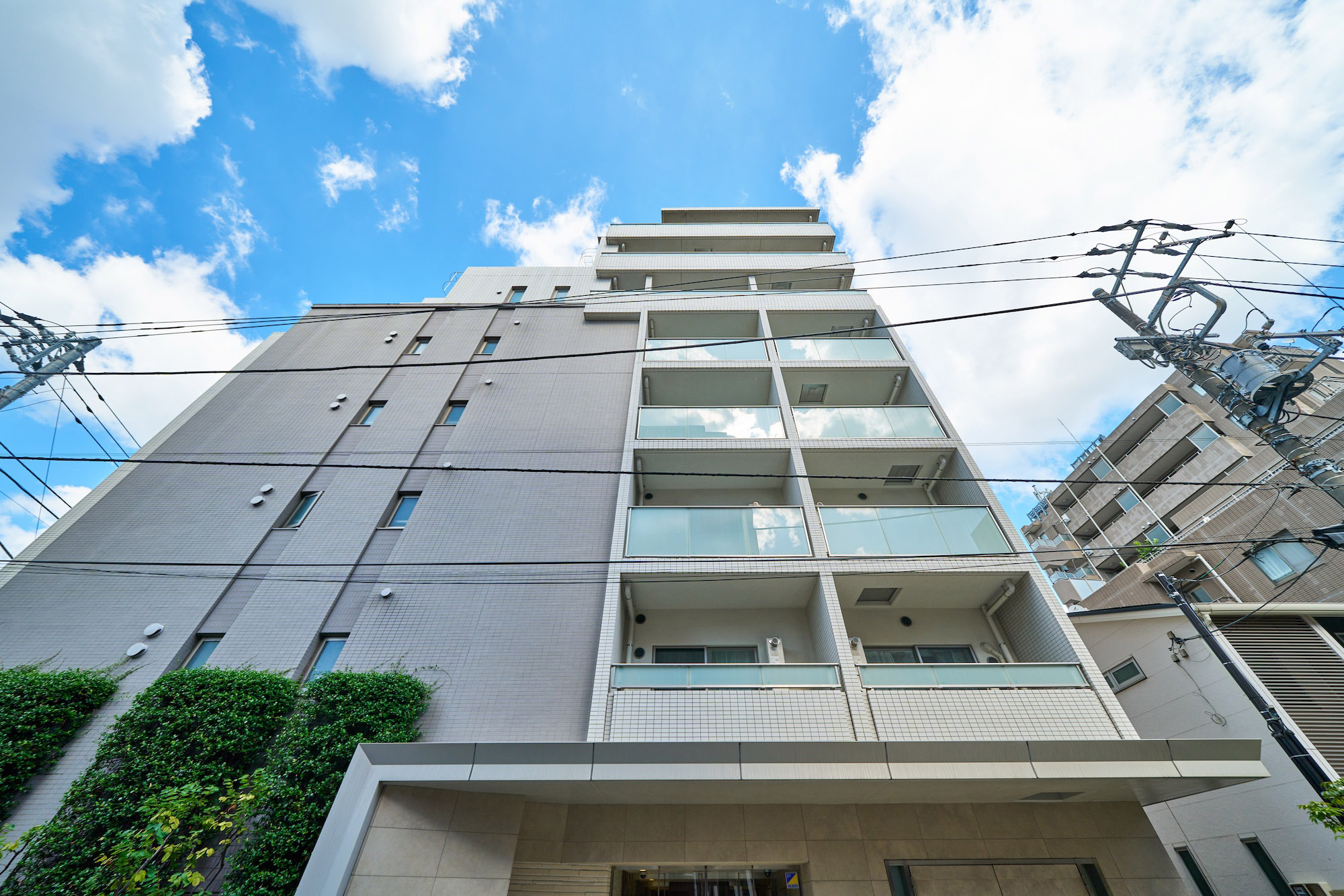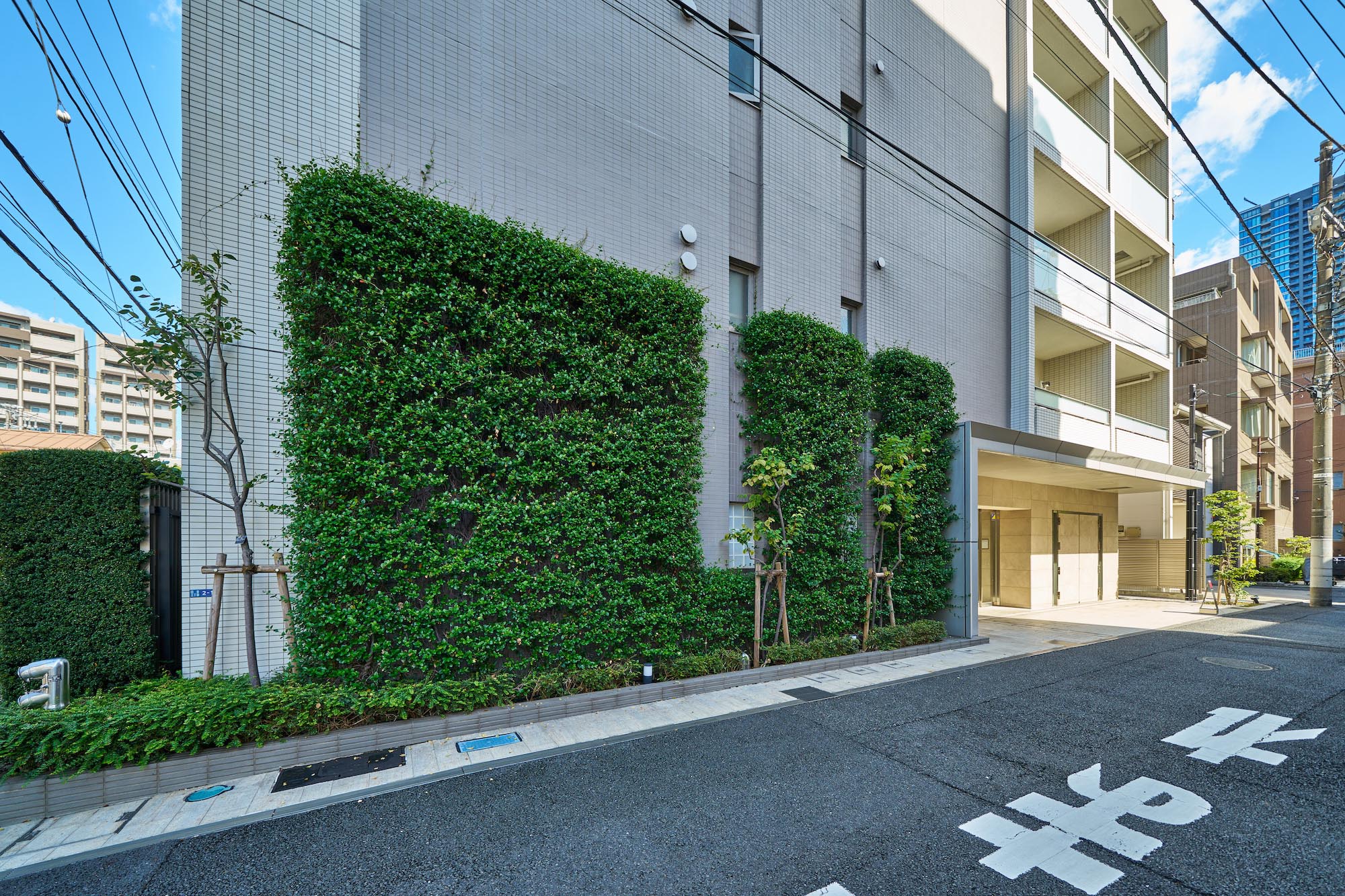 凜とした個性を秘めたグレージュ。清潔感あふれる白。淑やかな2色のコントラストが街に映える、洗練と品格を湛えたファサードデザインです。大らかな庇、グリーンウォール、ガラス手摺、上層階住戸に設けたルーフバルコニーなど、都心の開放感と安らぎを、さまざまに演出。至福の時間をもたらす、白金にふさわしい佇まいです。