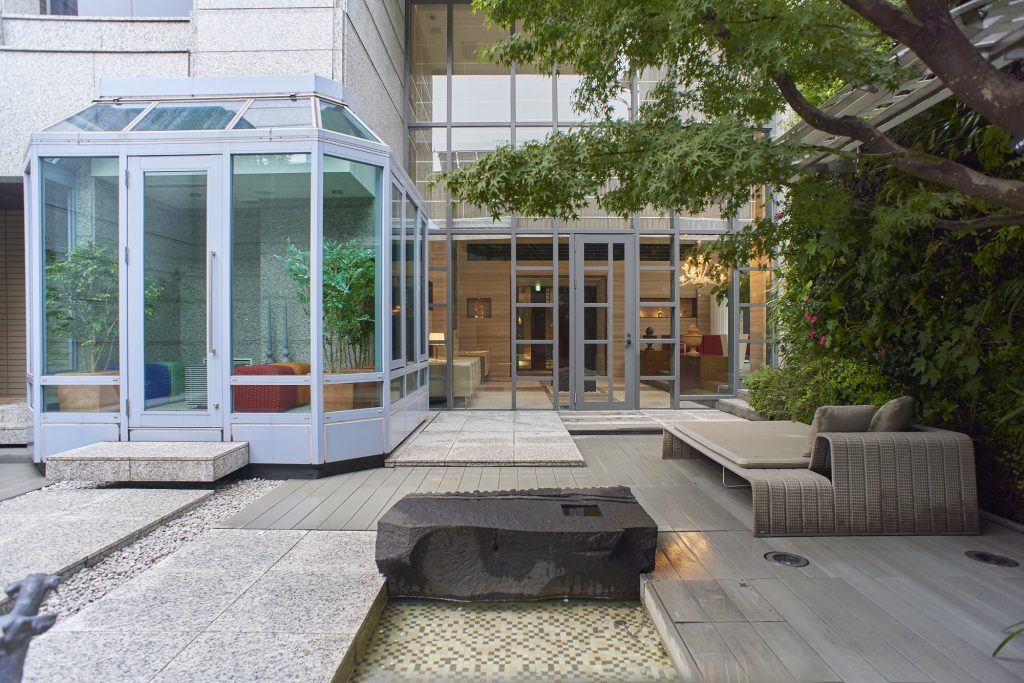 アウトドアファニチャーを特徴とし、ミラノサローネなどで常に注目を集めるイタリア・パオラレンティ社のソファをはじめ、四季を愛でる大きなイロハモミジや壁一面を緑で覆うグリーンウォールなどの約25 種の植栽が、この空間に鮮やかな色彩を創出。