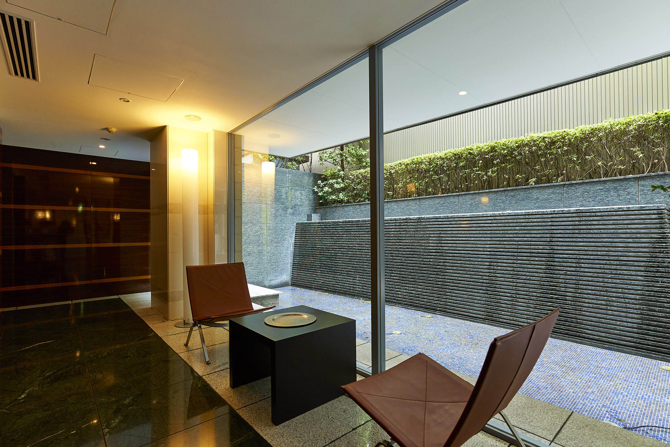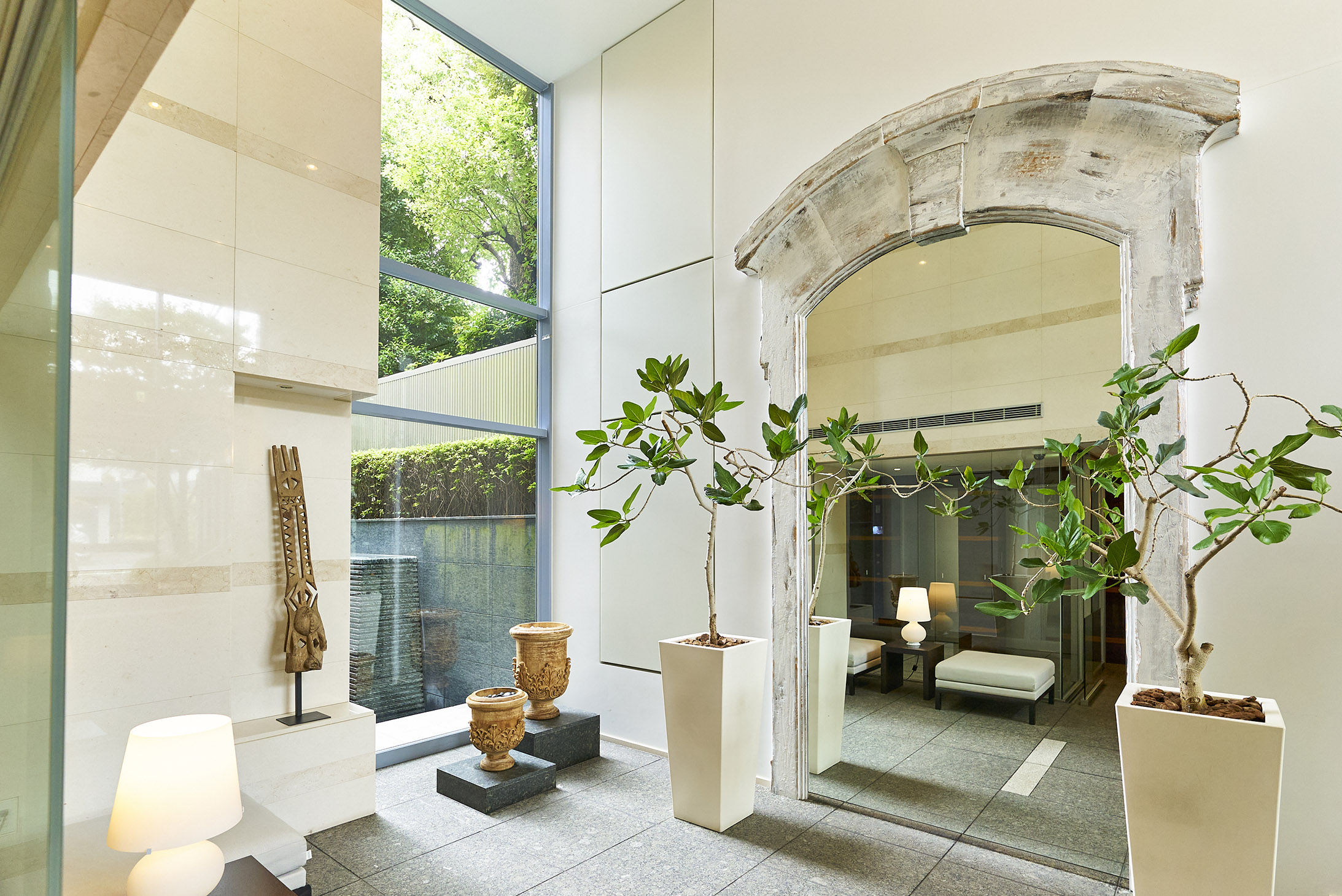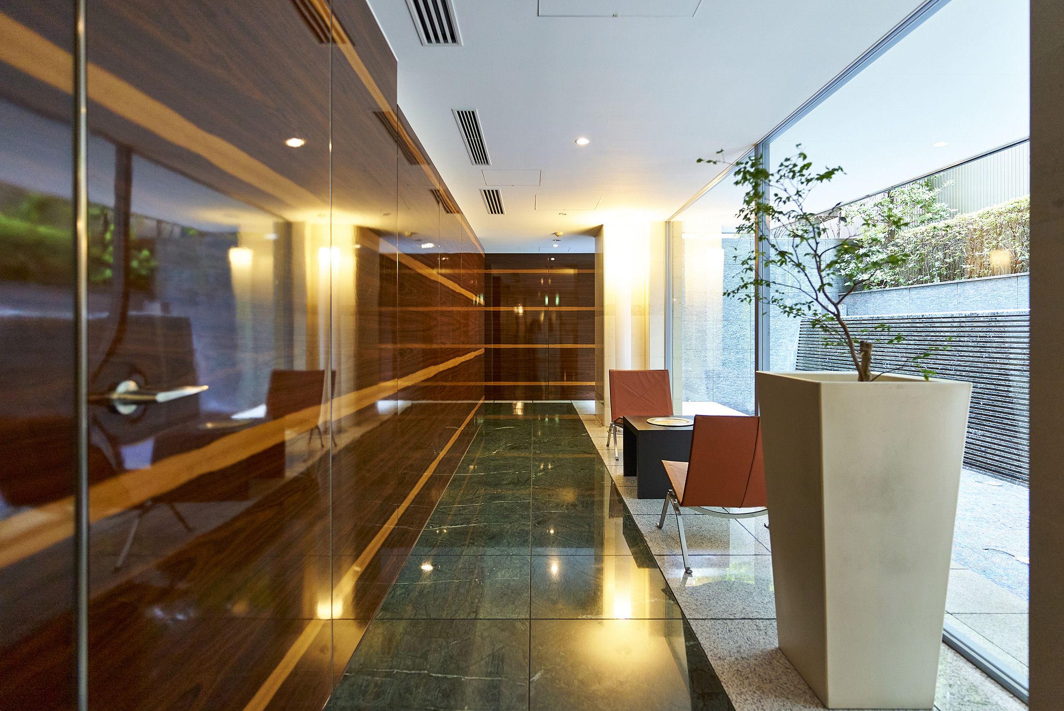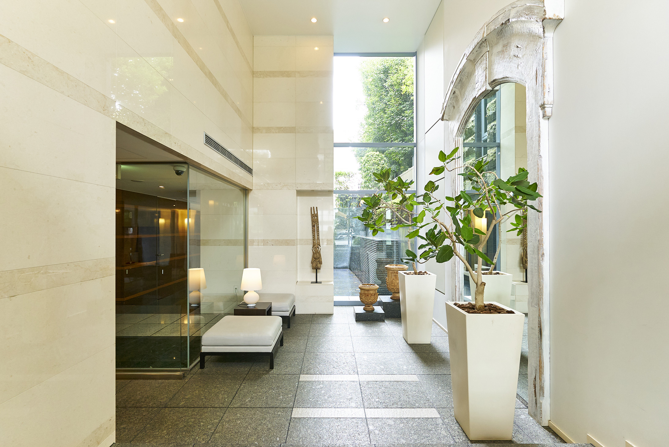 クリアなガラス戸のエントランスを抜けると、鮮やかな光で満たされた2層吹き抜けのエントランスホールが広がります。風格ある額縁の大きな鏡や個性的なオブジェが設られた、代官山らしい感性を刺激する空間です。その先には、水の流れ落ちる水盤が、透きとおった輝きを湛えながら住まう方を出迎え、木目を主張するオリーブウォールナットのコリドーが、プライベート空間へとエスコートしてくれます。