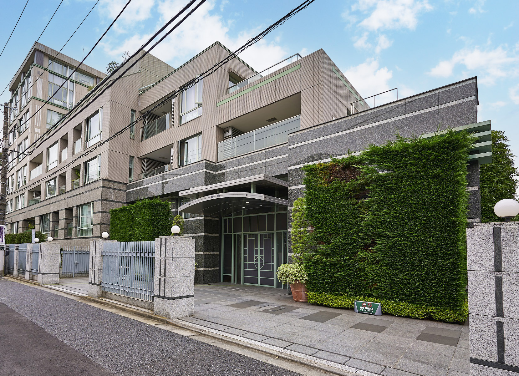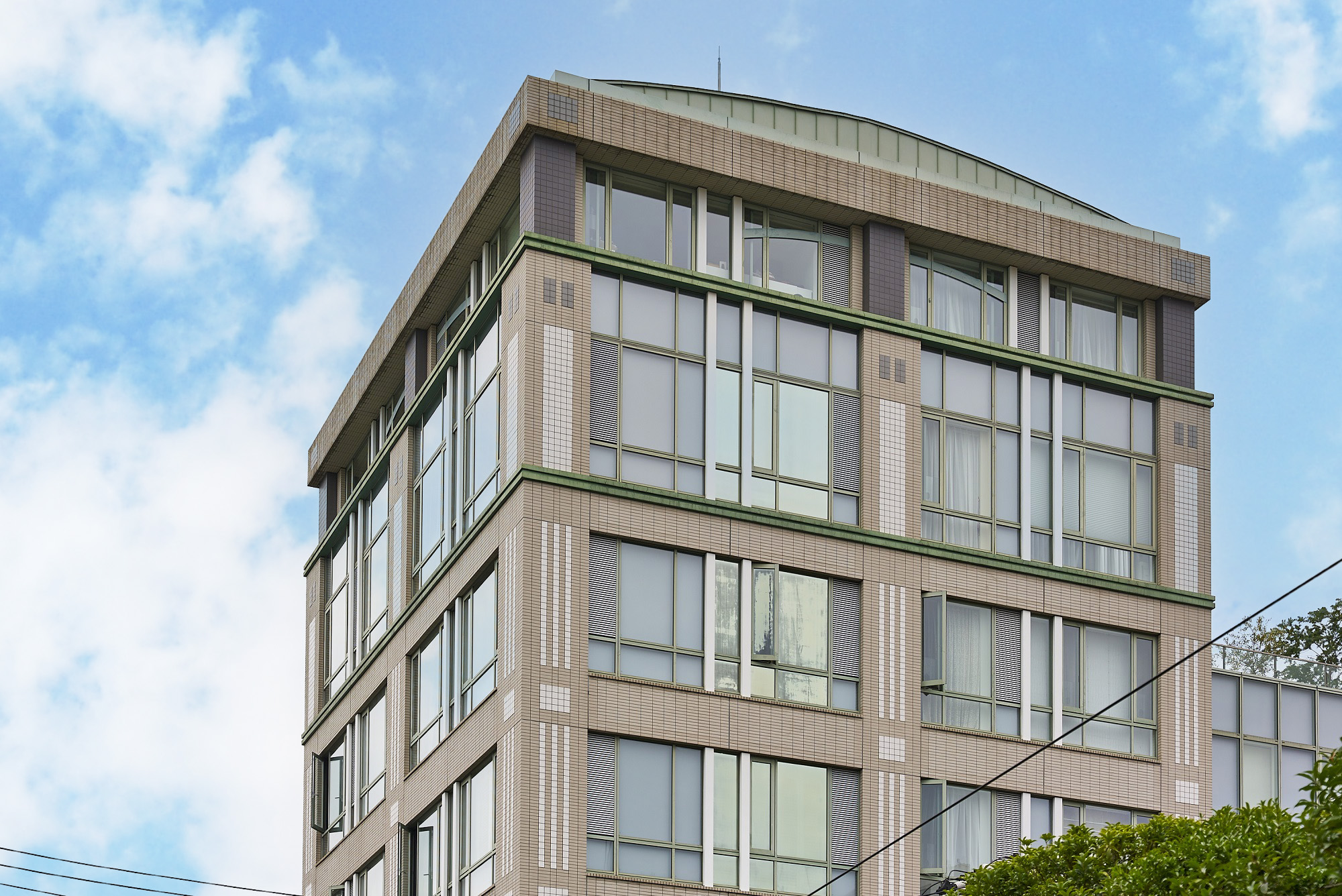 モダンな雰囲気のなかに、ディテールに施された職人の手による装飾やルーフを形どるアールの曲線が、全体に優美な印象を与えています。自然石を多用した低層部、タイルの質感と緑青色の屋根をもった中層部は、住まいとしての温かさと上質感を醸成。旧朝香宮邸にあるアールデコの様式美をエッセンスとしながら、白金台という街に似合う、洗練された佇まいです。