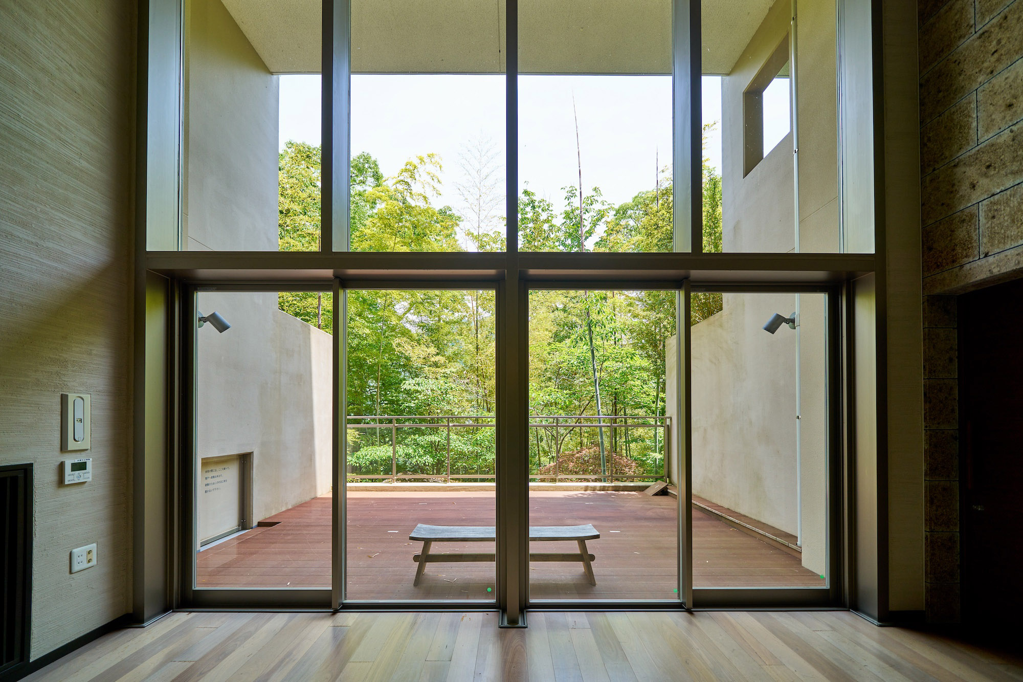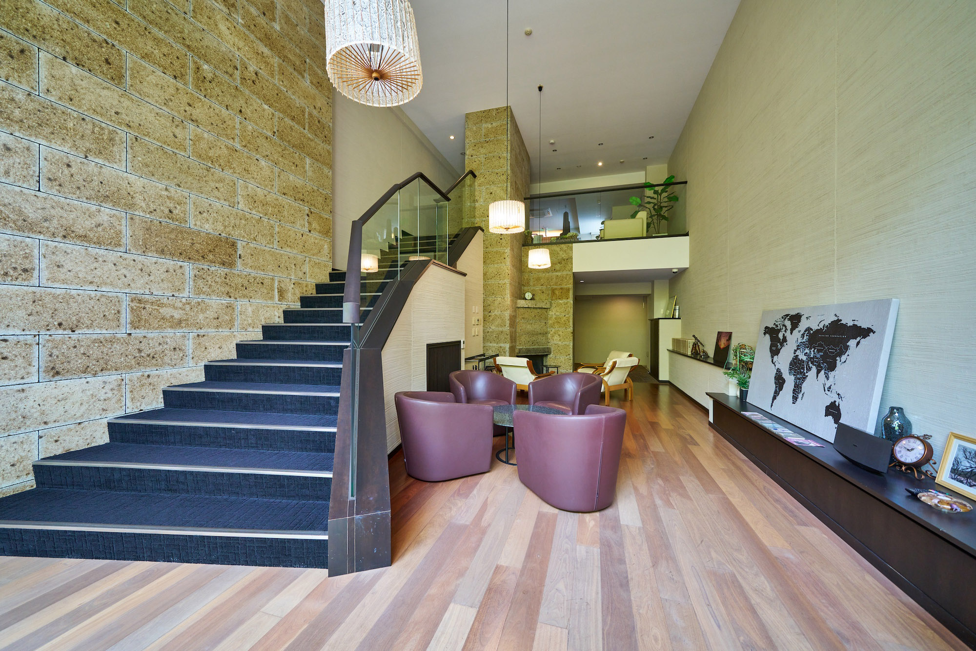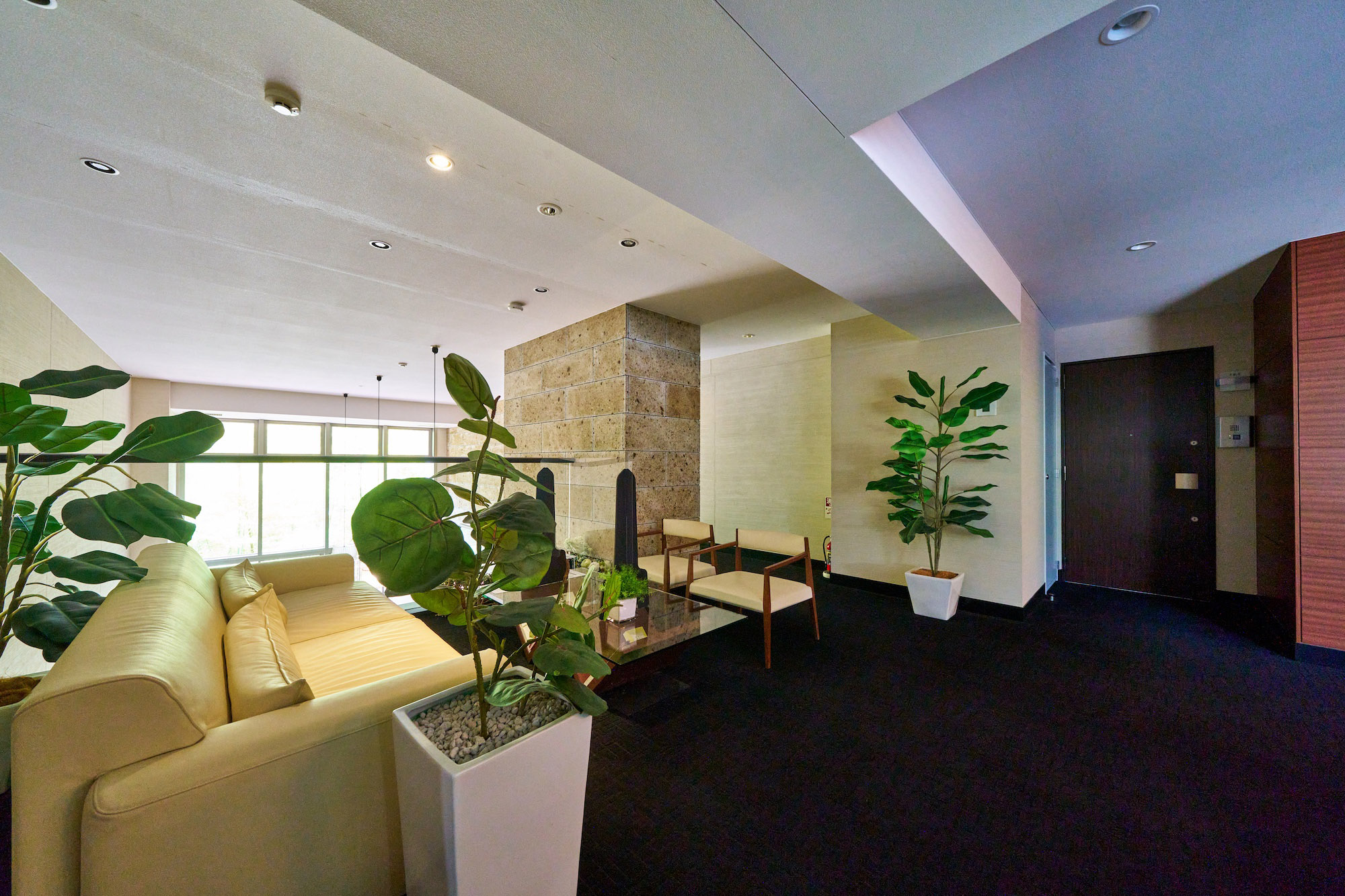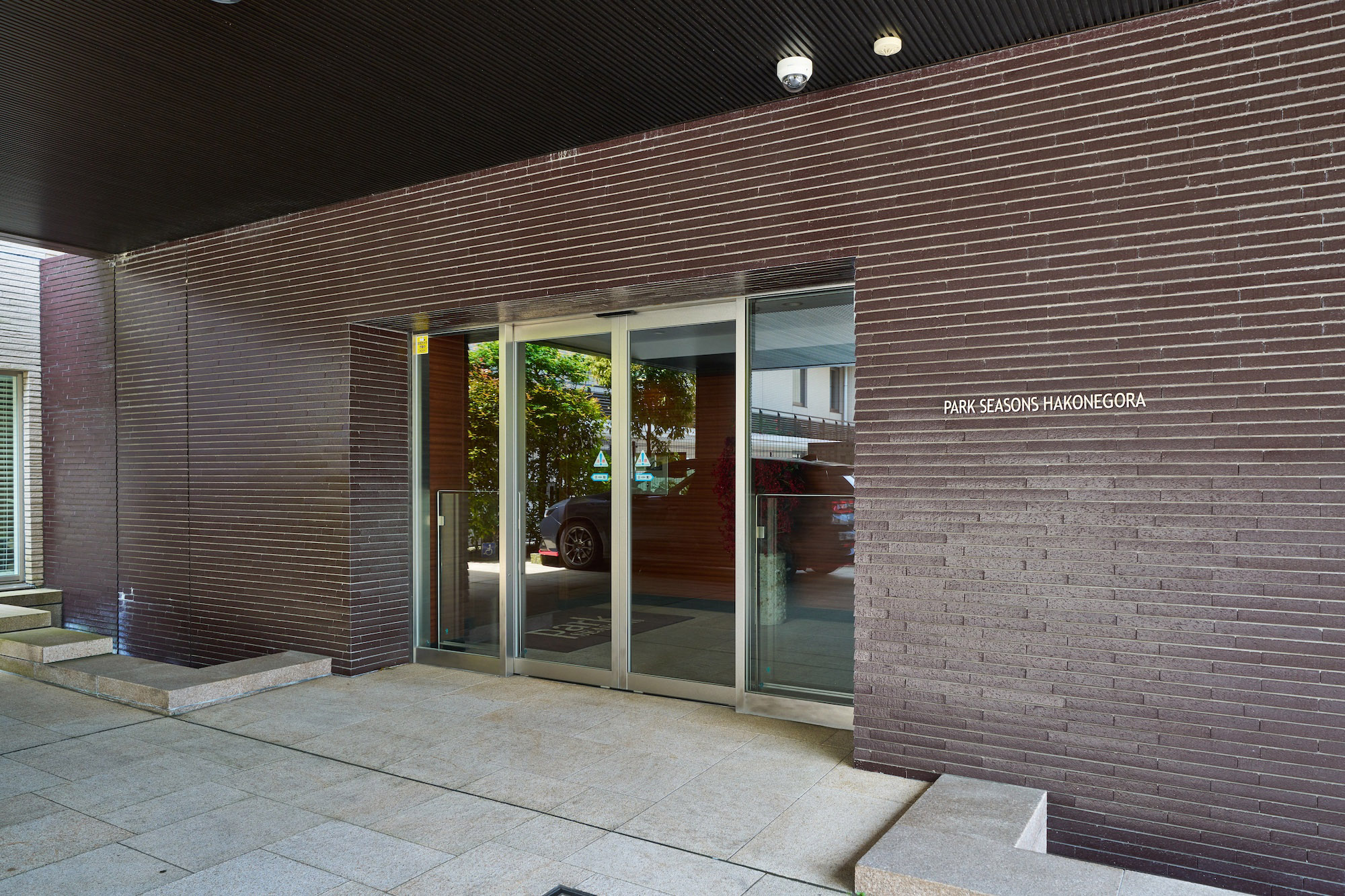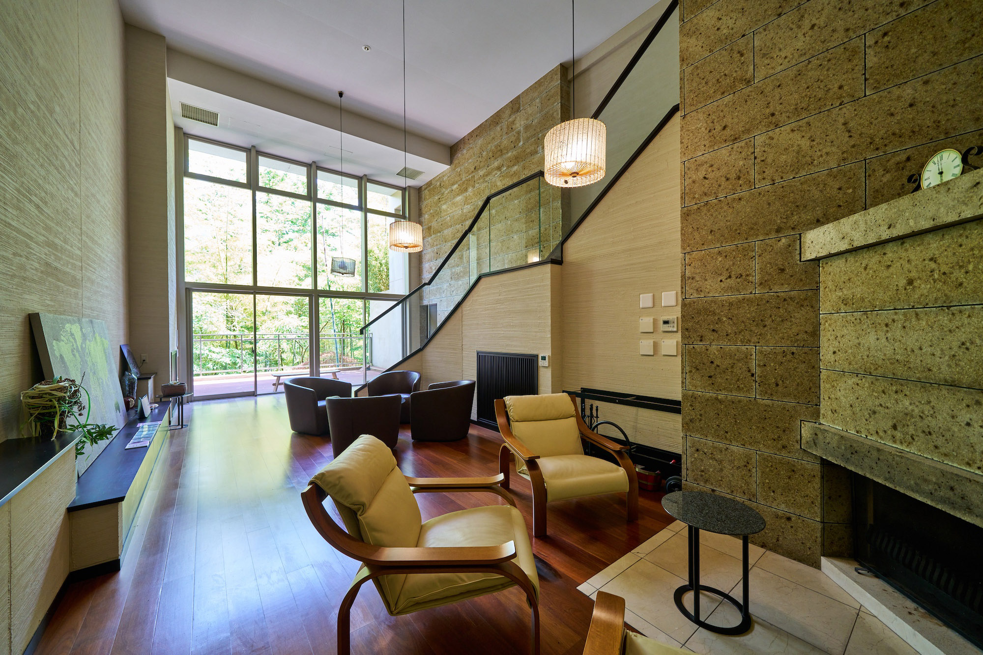 エントランスは、流れる時間さえもゆるやかに感じさせてくれる重厚なる趣き。床材には御影石、外壁には茶褐色のボーダータイルが施され、ホテルライクな車寄せとともに、非日常の世界へ優しく導きます。エントランスホールの向こうは、2層吹き抜けになっており、階段を降りた先にラウンジが設けられています。吹き抜けには高さを最大限に活かした、12枚のガラスで構成された大画面。その中には既存樹を配した風光明美な景色が、ありのままに飾られています。ラウンジは、趣きある大谷石を壁一面に敷き詰め、本格的な薪暖炉を完備。自然を活かし、リゾートならではのこころを灯す——「パークシーズンズ箱根強羅」の誇るアイデンティティのひとつです。