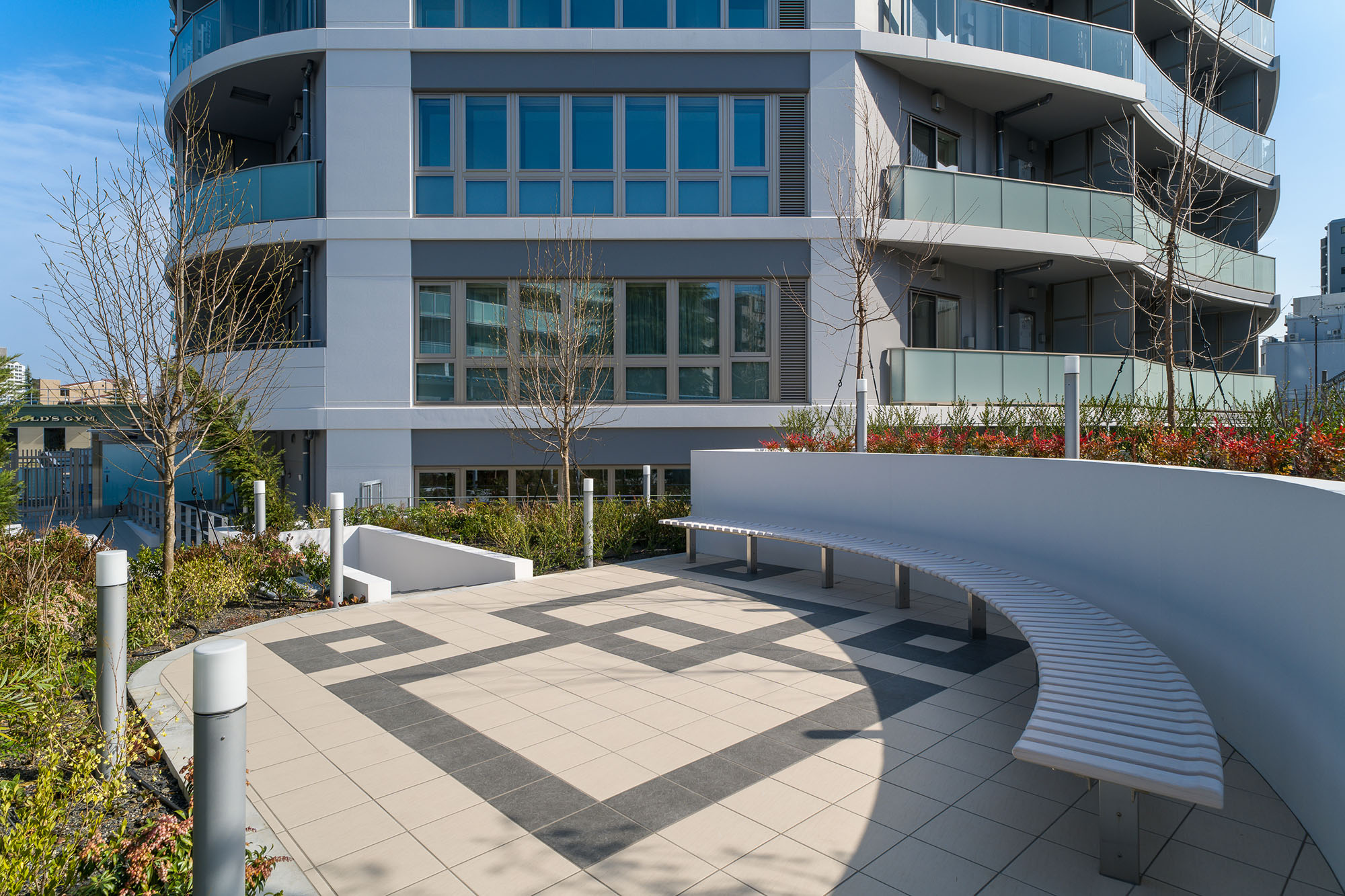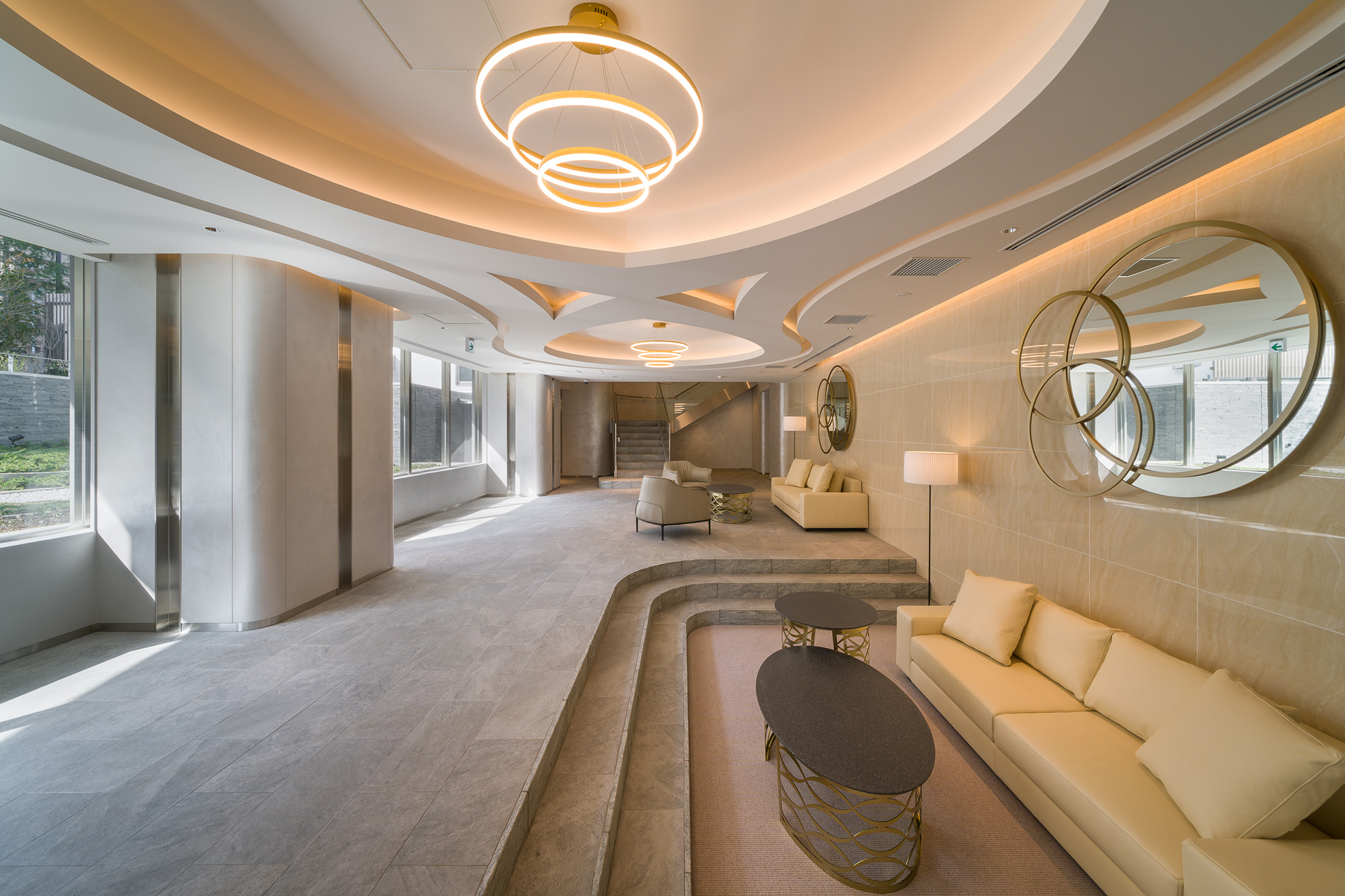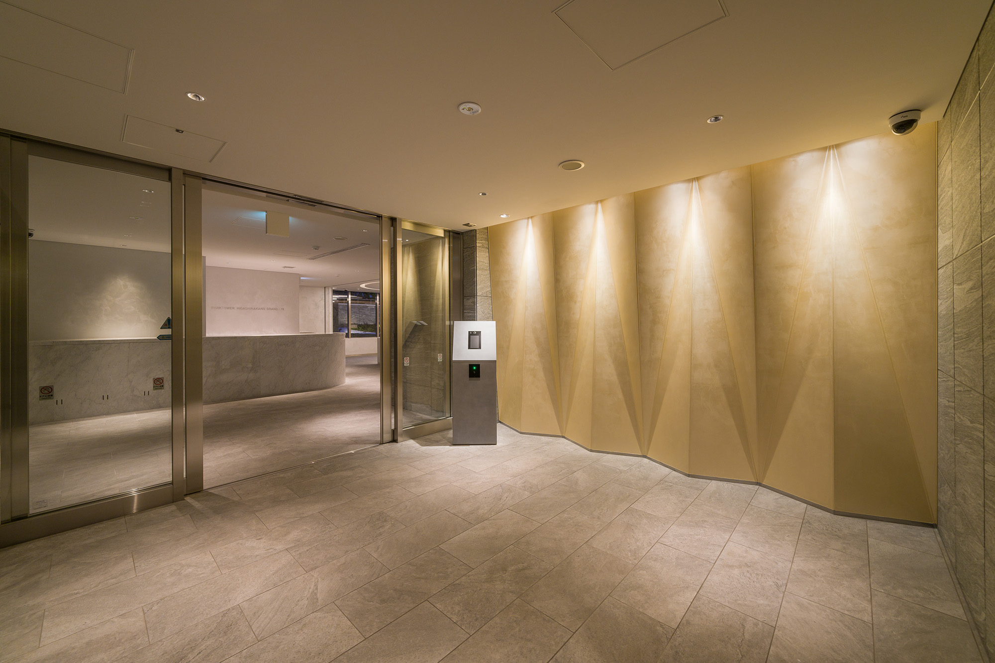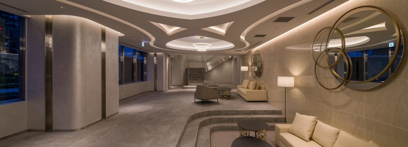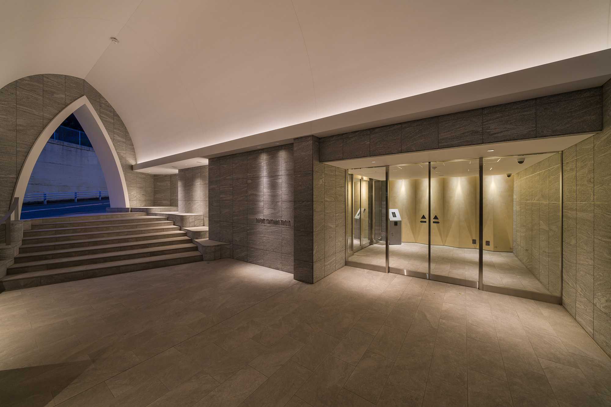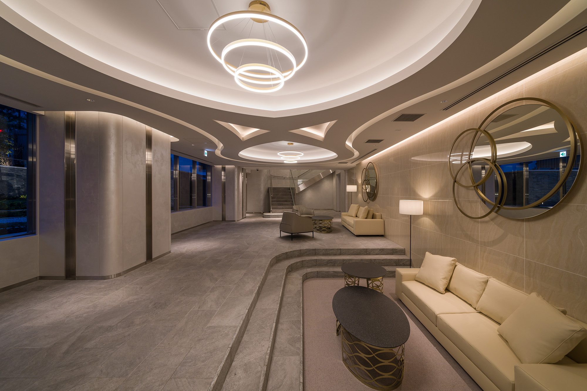 エリアのランドマークとなるヴェールの連なりをモチーフとした、奥行きのあるエントランス。中に入ると、華やかで贅沢な雰囲気のラウンジが広がります。象徴的なシャンデリアや、2階へと続く階段など、ドラマチックな景色の中で、ゲストとの会話や寛ぎのひとときなど、愉悦の時間を過ごすことができる空間です。ビジネスからスタディまで、多彩に利用できるコワーキングスペースには、打ち合わせにも使える2人用の個室やプリンターなども完備。集中できる環境を整えた個室ブースと、開放的なカウンター席を、シーンに合わせて使い分けることができます。屋上のスカイデッキでは、富士山も見晴らす開放的な眺望が広がり、心地よい時間を過ごすことができます。