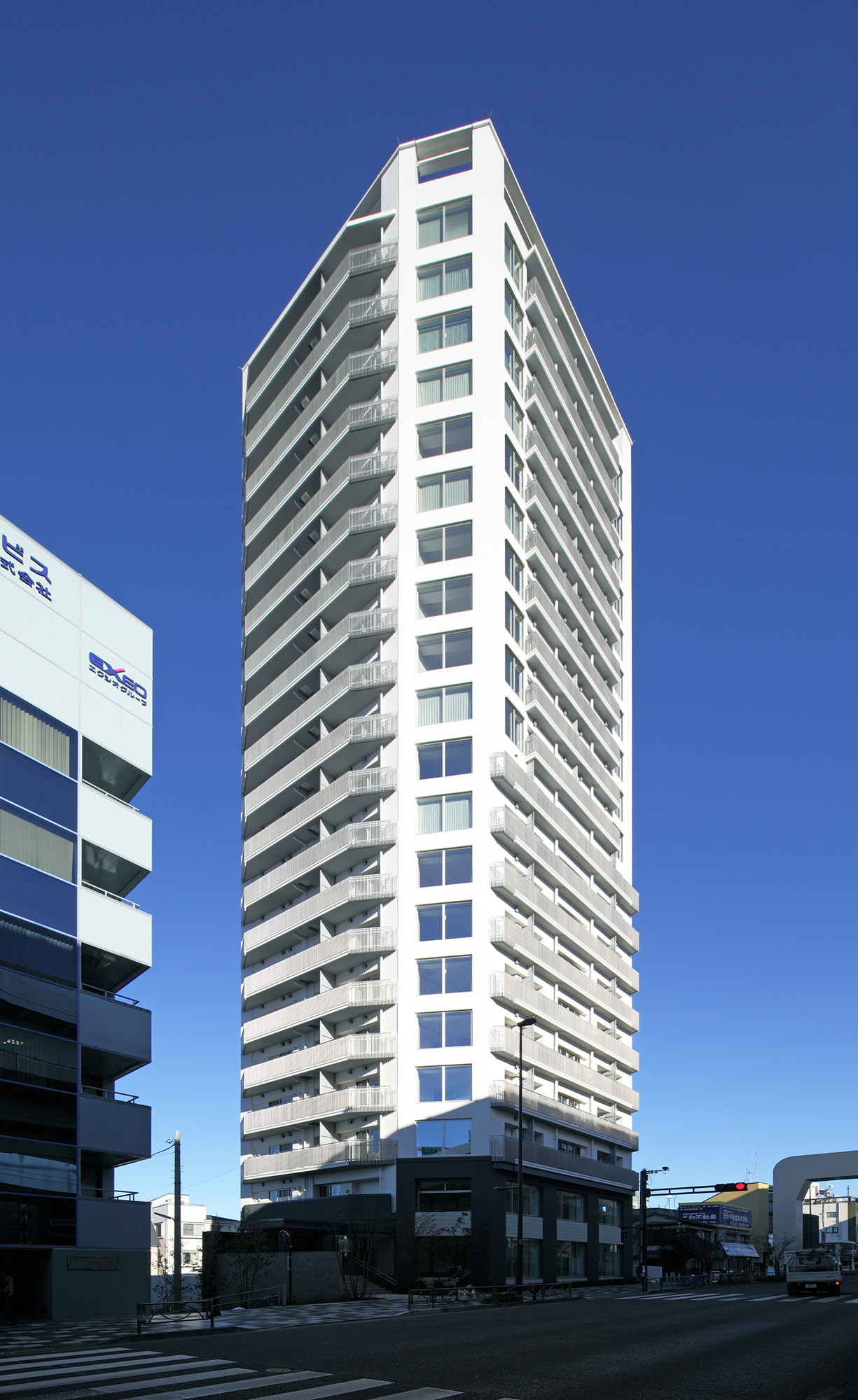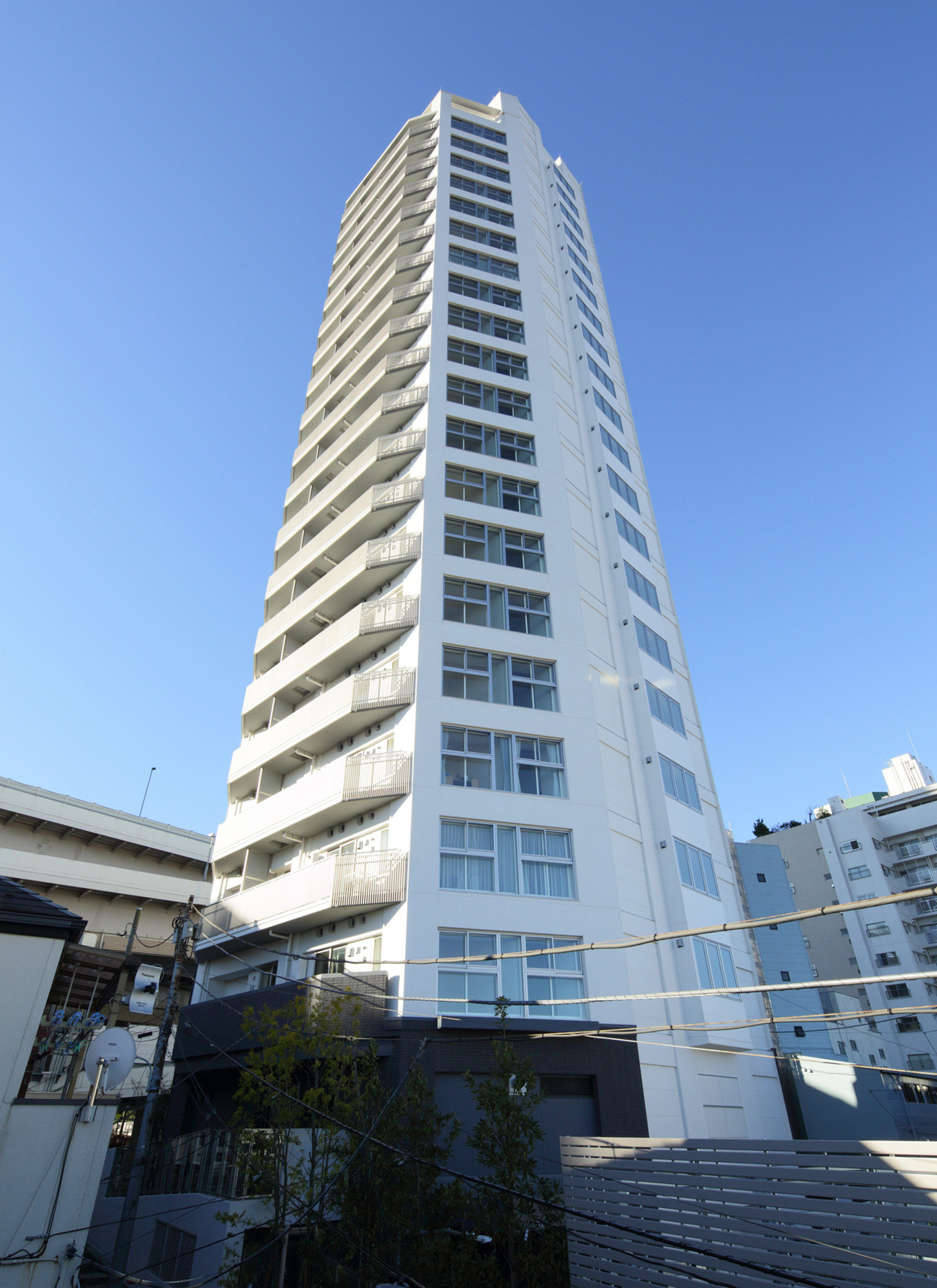 利便性に優れた立地を象徴するような、都会的なイメージを持つシンメトリーでシンプルなフォルムを追求。白系を基調としながら、基壇部では黒系のタイルが重厚感を演出しています。また、コーナー部には、大きなビューウィンドウを設けることにより、圧迫感の軽減された外観を創出。鹿島建設の設計・施工による、信頼の制震構造を採用したタワーマンションです。