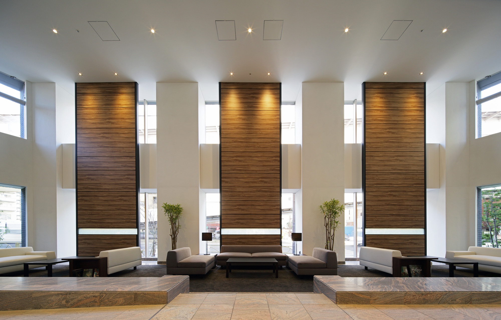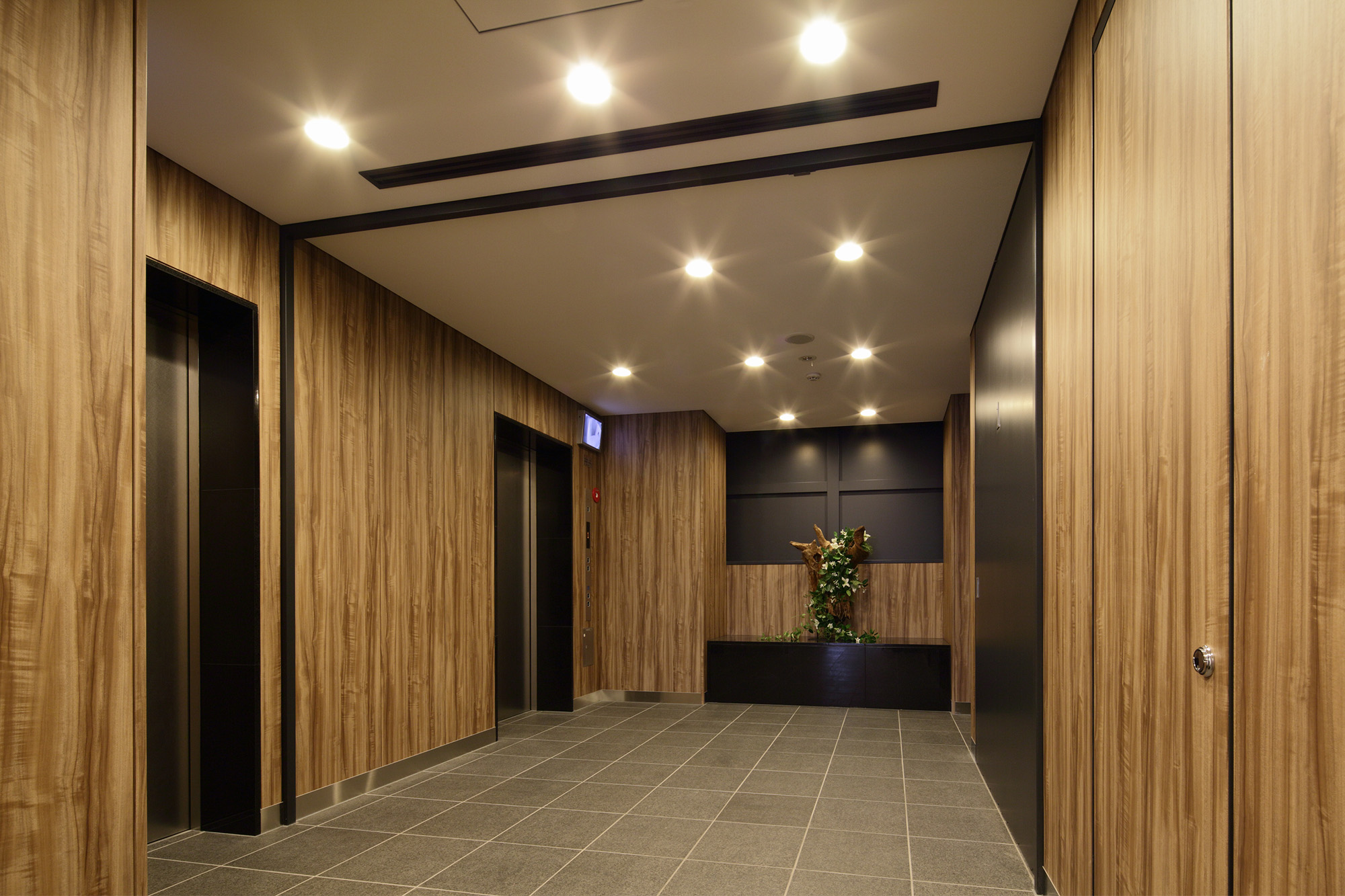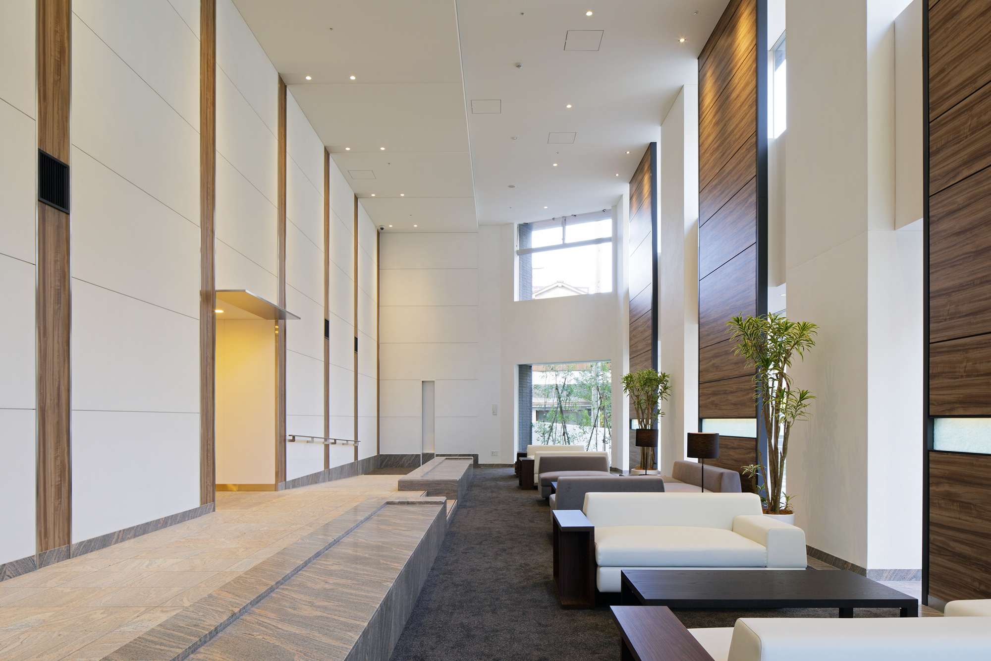 エントランスは、アプローチ空間に壁や階段を設け、外部の賑わいから切り離された邸宅感を演出。その先には、開放感ある2層吹抜の優雅なエントランスホールが住まう方を出迎えます。駅近立地の喧噪も感じさせない悠々とした空間は、壁に木調の素材を配し、温もりある雰囲気を創出。また、ラウンジ部分を一段下げることにより、さらなる開放感とともにゆったりと寛げる空間を生み出しています。