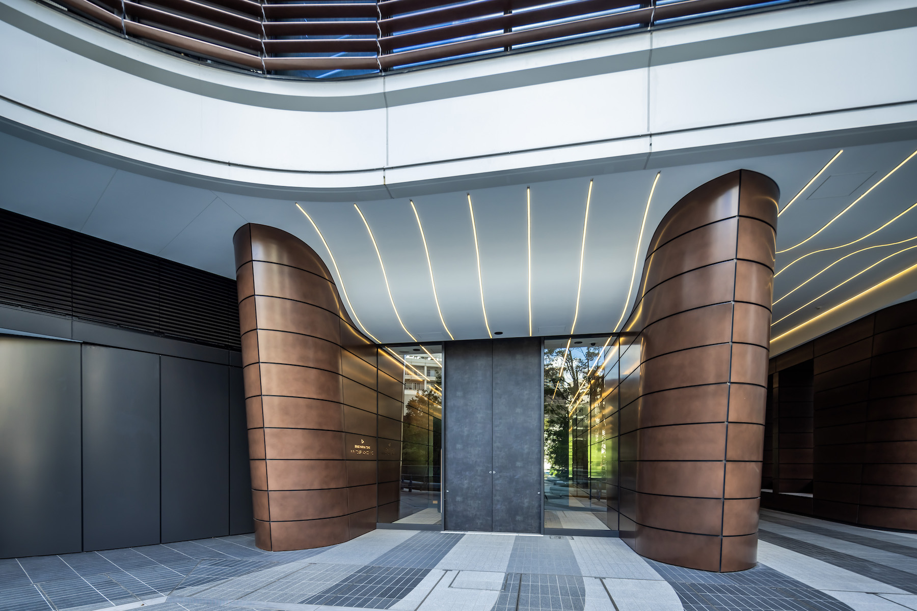 「アイランド」をデザインしたメトロパビリオンの地下は、海中をイメージした駅通路入口となっている。「勝どき」駅とつながる地下通路から雨風の影響を受けることなく、住まう方をエントランスへ導く。
