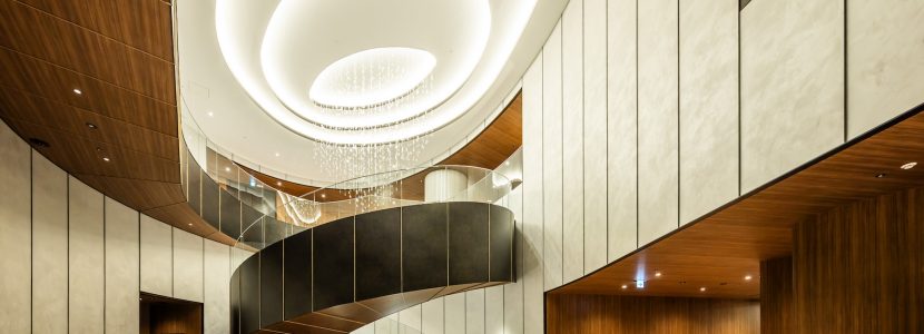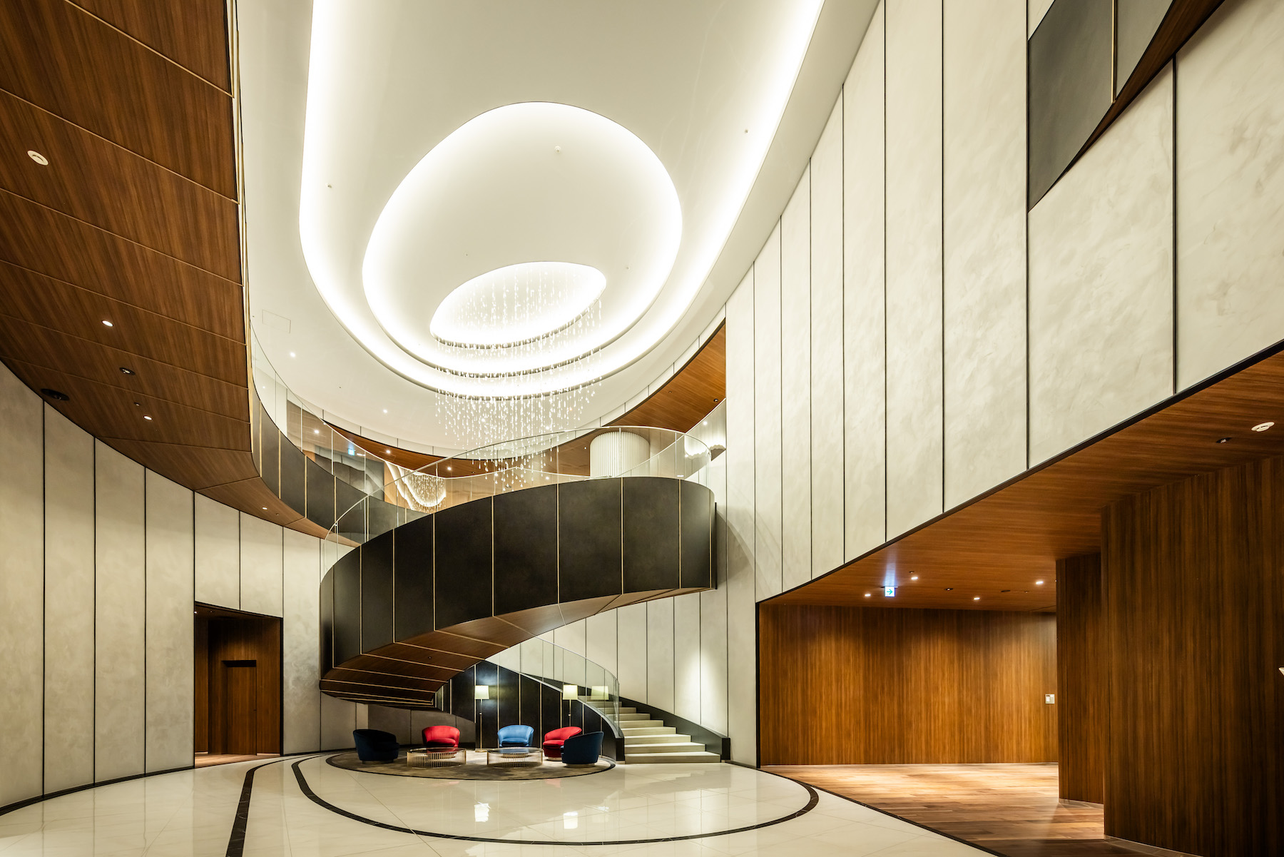 まるで大型客船に設えられた螺旋階段が中央に停む「パークタワー勝どきミッド」のエントランスラウンジ。約9mの吹き抜け空間に、螺旋階段の曲線美がラグジュアリー感を創出。ここに住まう方を、優雅にお迎えする。