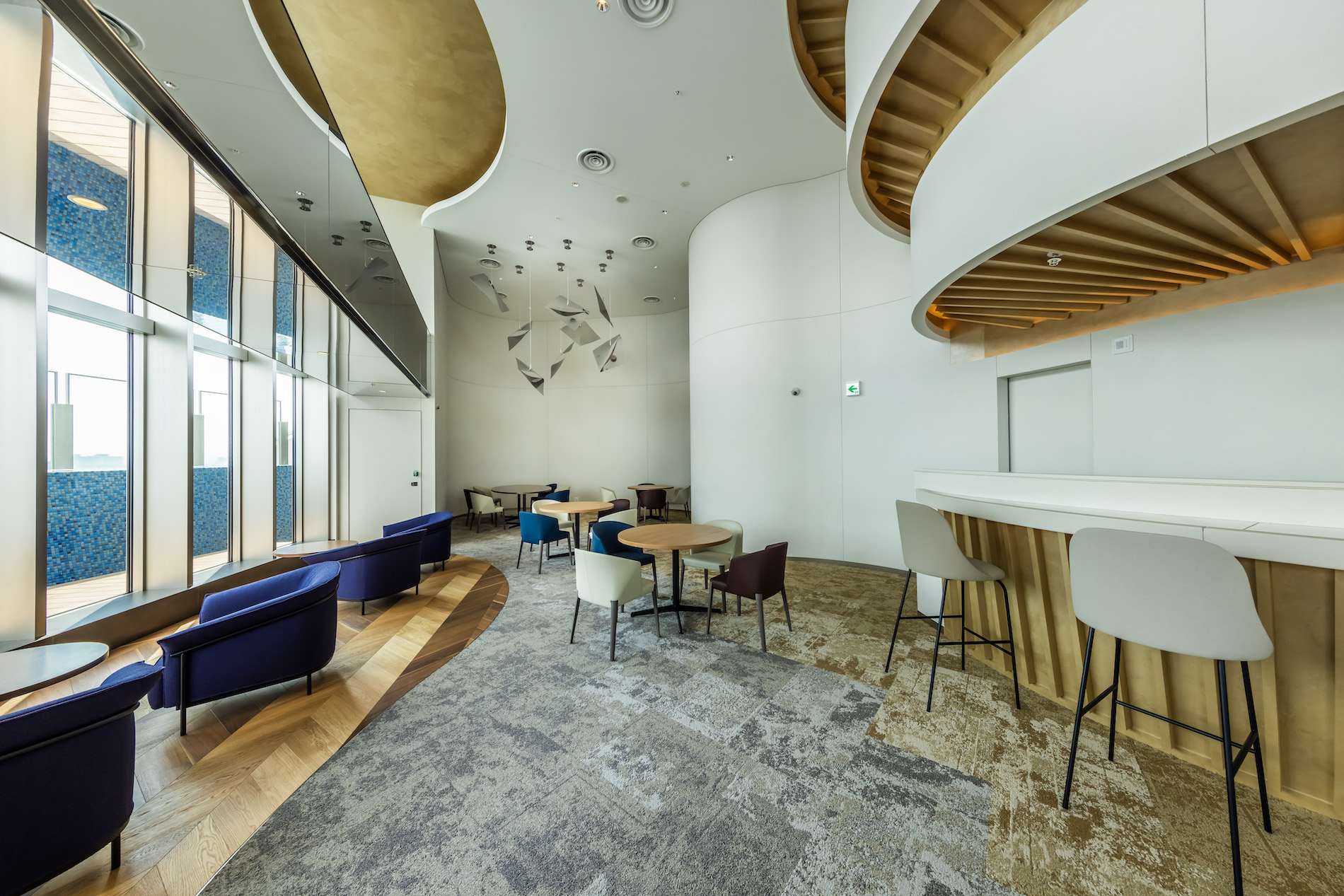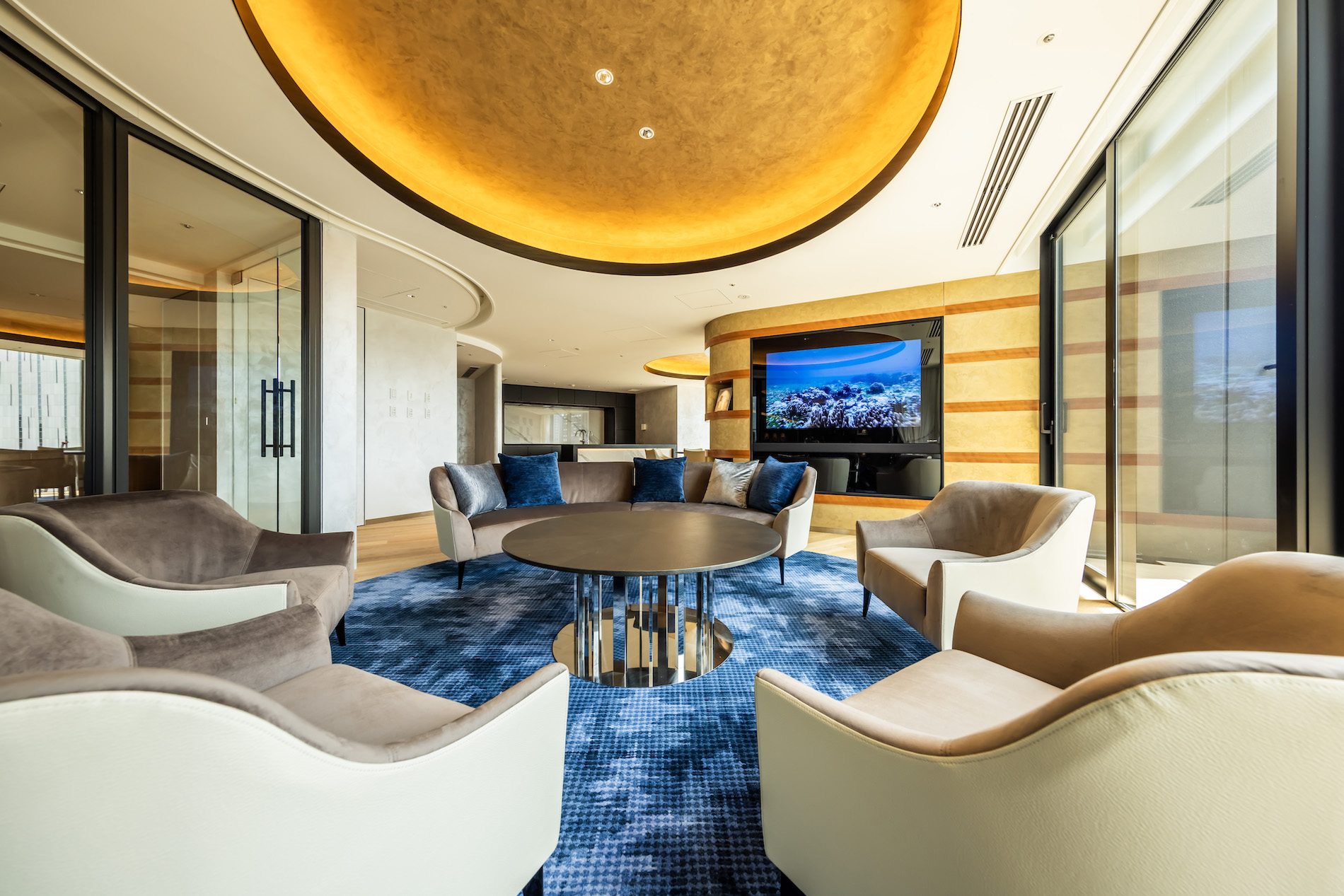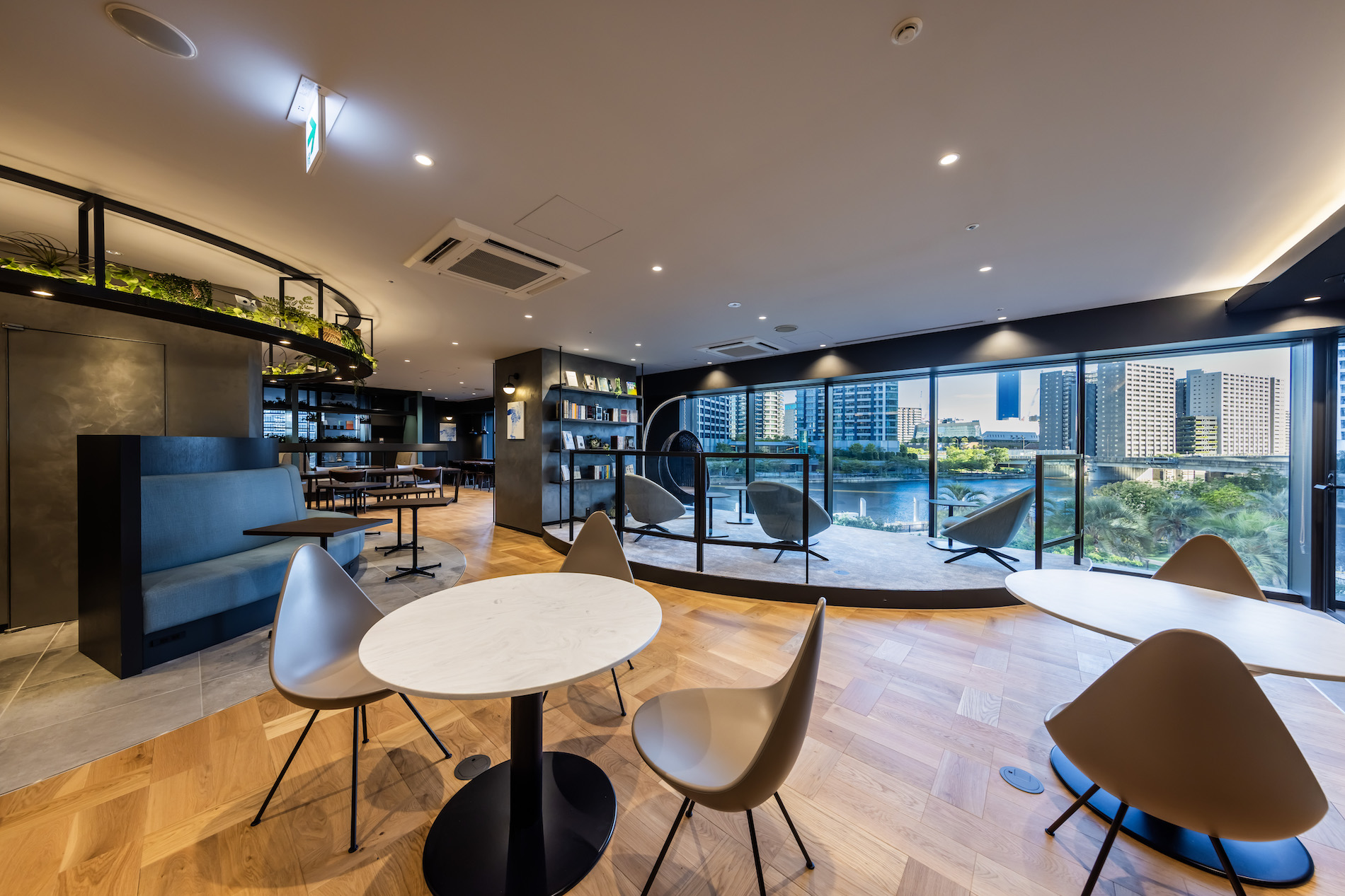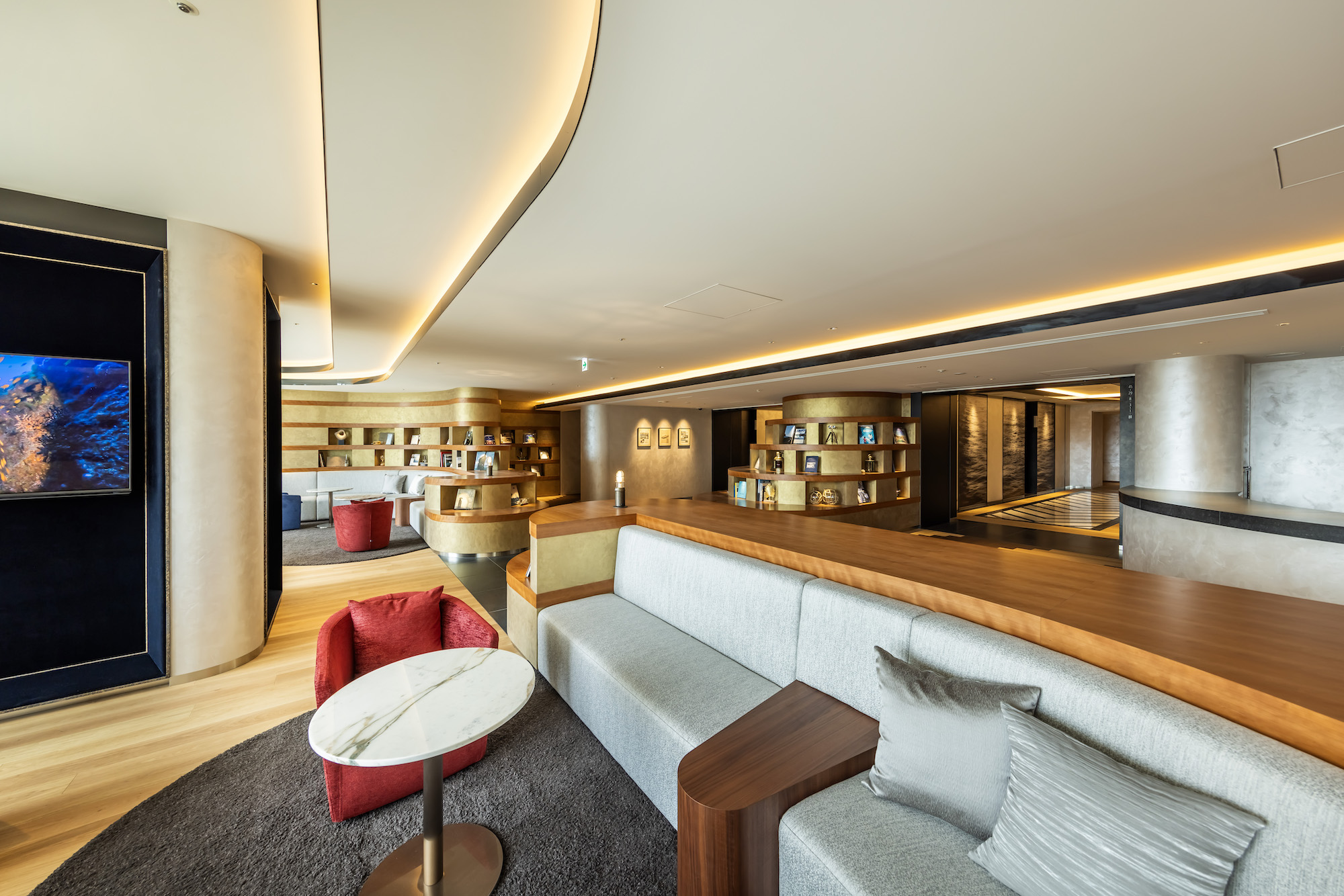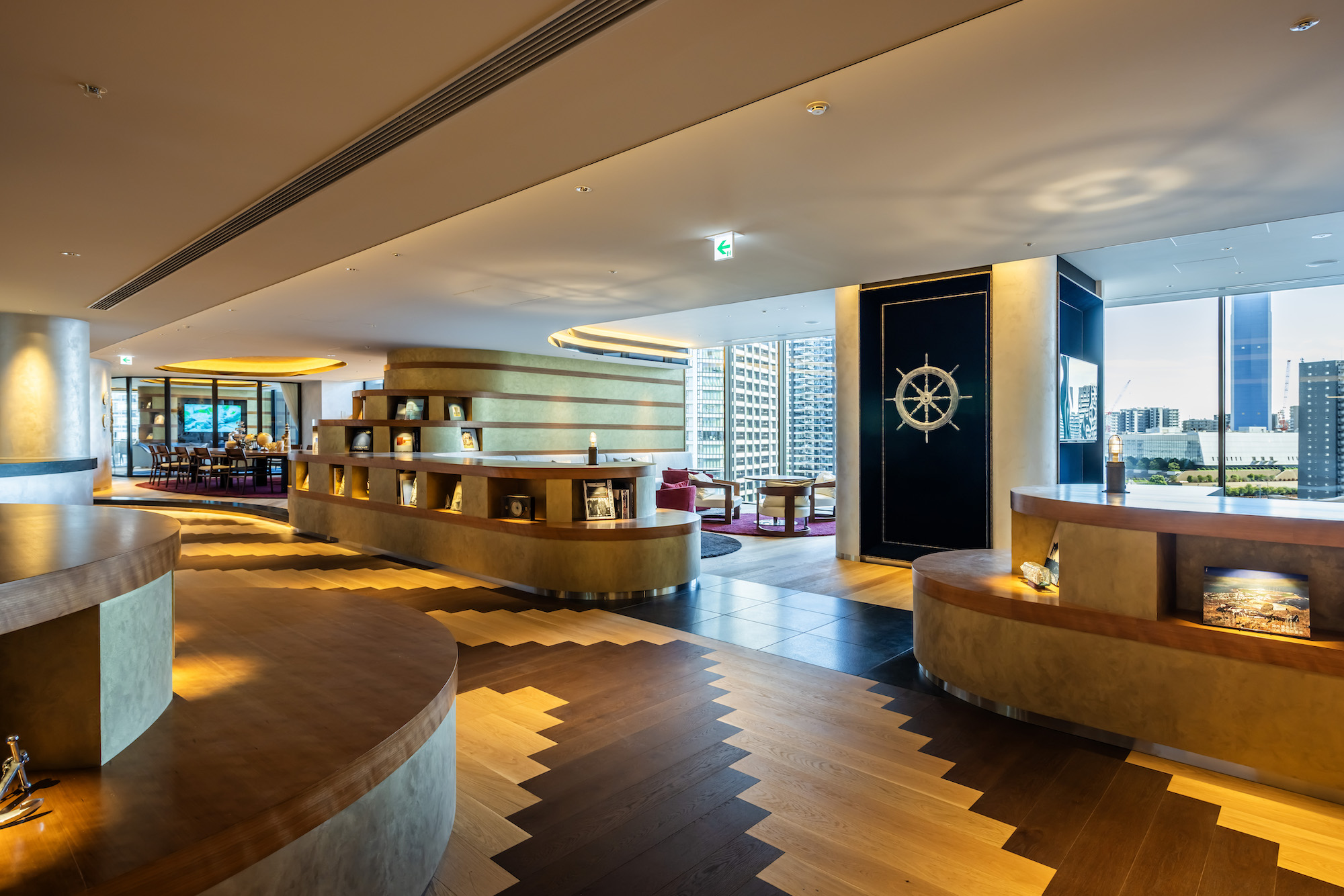 「パークタワー勝どきミッド」の共用空間が集約された8階の象徴的スペースであり、訪れる方を最初にお迎えするウェルカミングラウンジ。タワーのデザインコンセプトを引き継いだ、船のデッキでくつろぐような空間。
