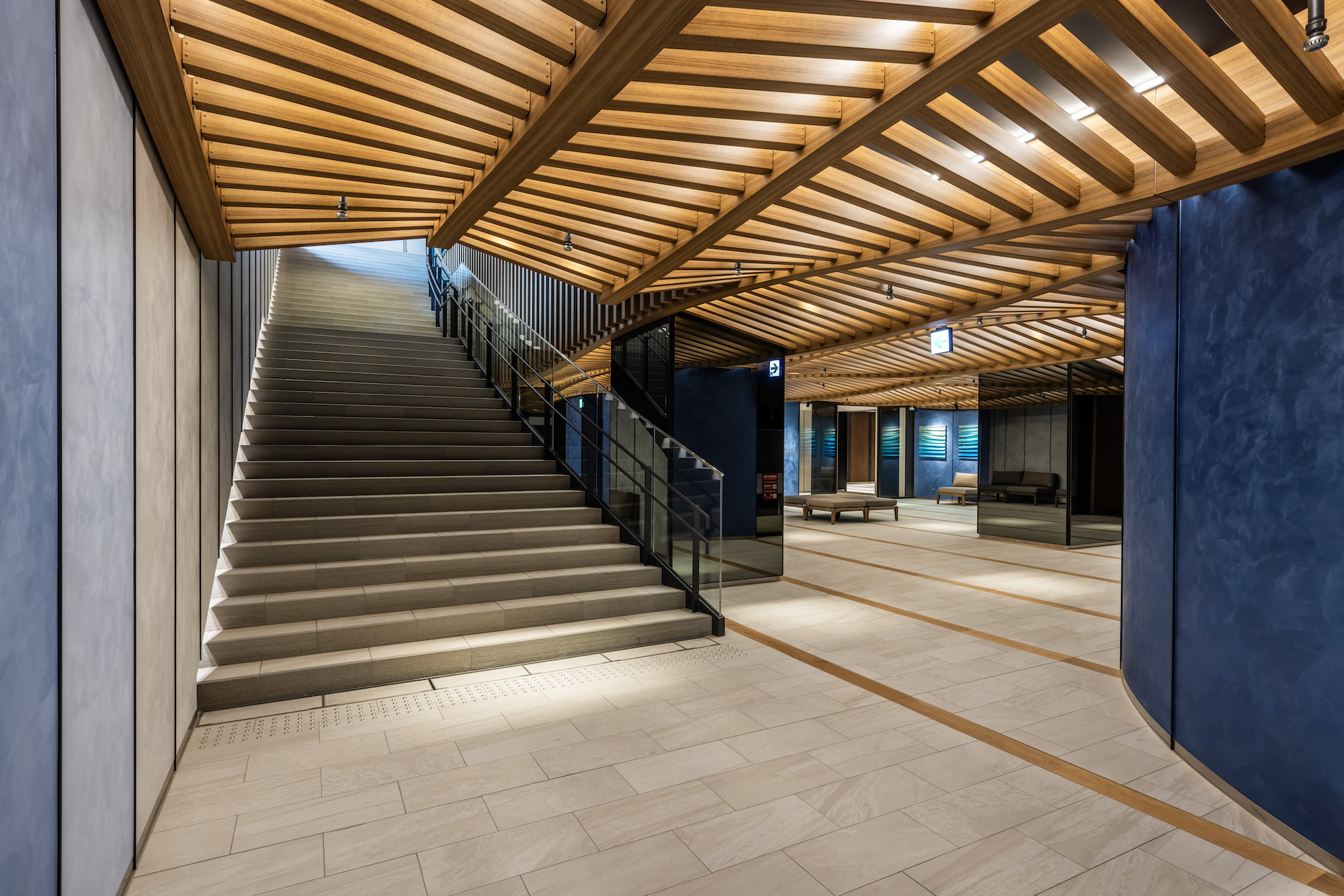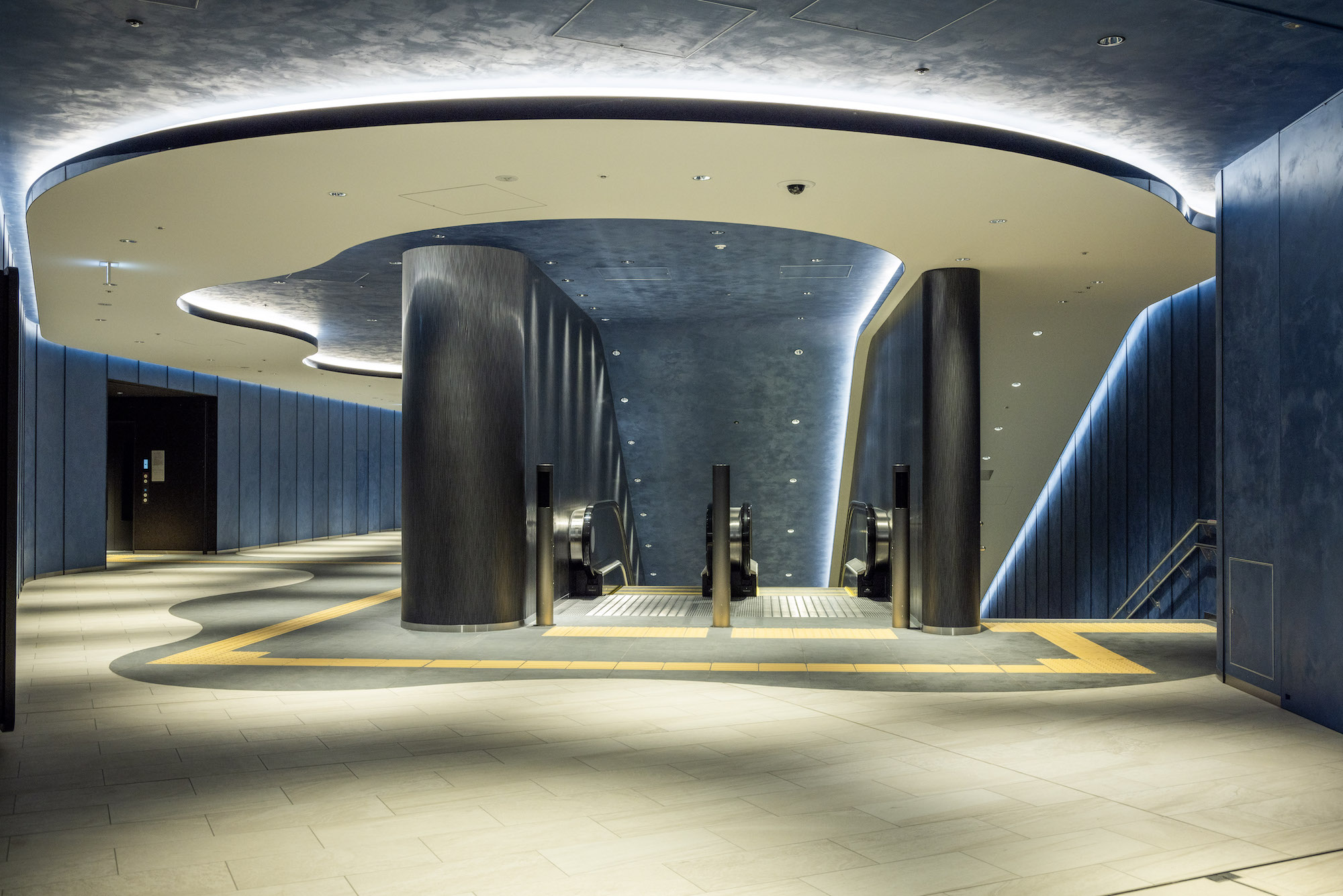 地下エントランスは、まるで船底のような空間を表現。海中(駅通路入口)からこの船底、そして、船(タワー)やアイランド(メトロパビリオン)へのシークエンスを演出。ここから地上の広場や商業施設、オフィスにつながる。