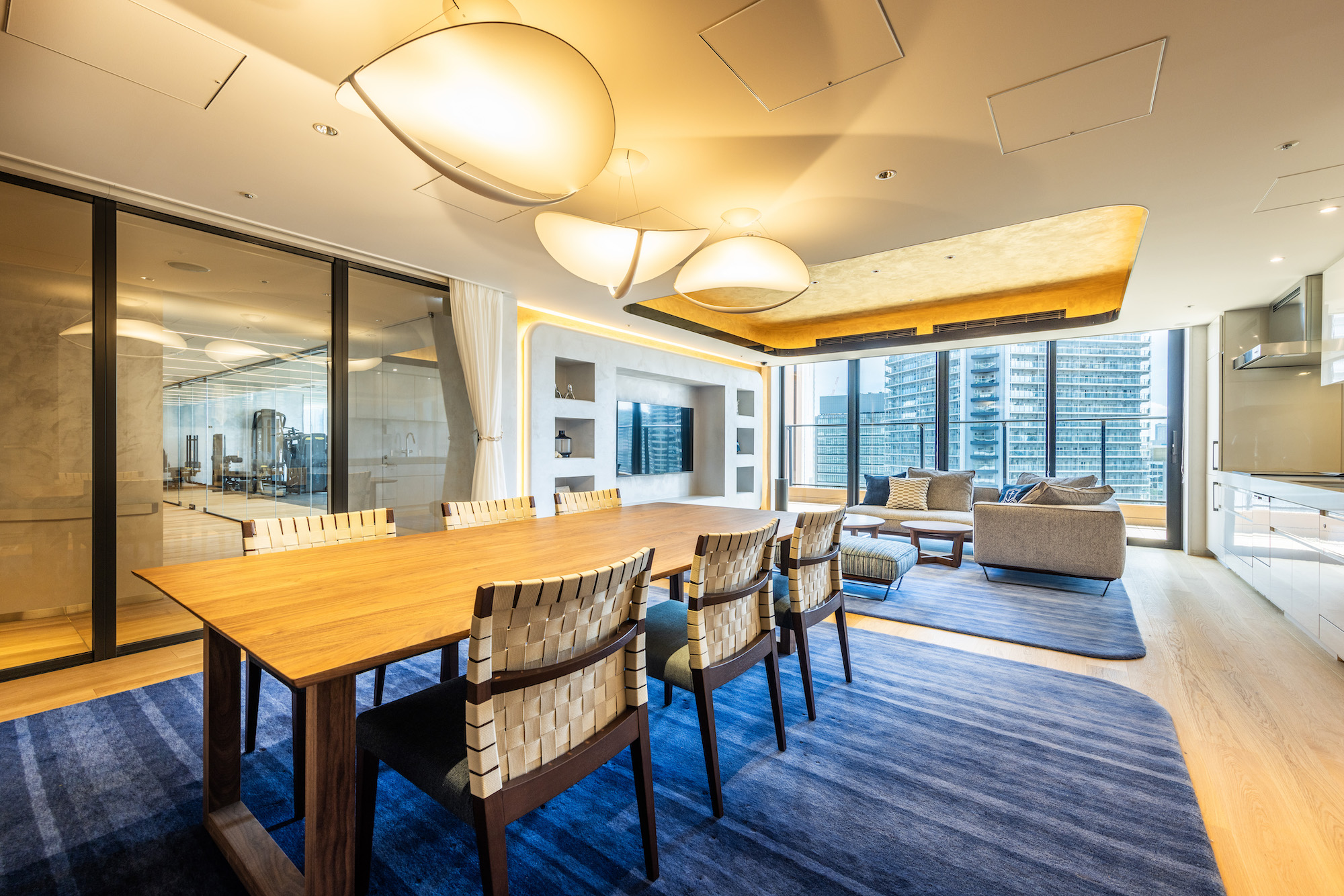 「パークタワー勝どきサウス」の53階と54階の二層吹き抜け空間にルーフトップラウンジを用意。BARカウンターには、スタッフを配置して、軽食やドリンクを提供。気色を眺め、くつろぎの時を楽しめる。