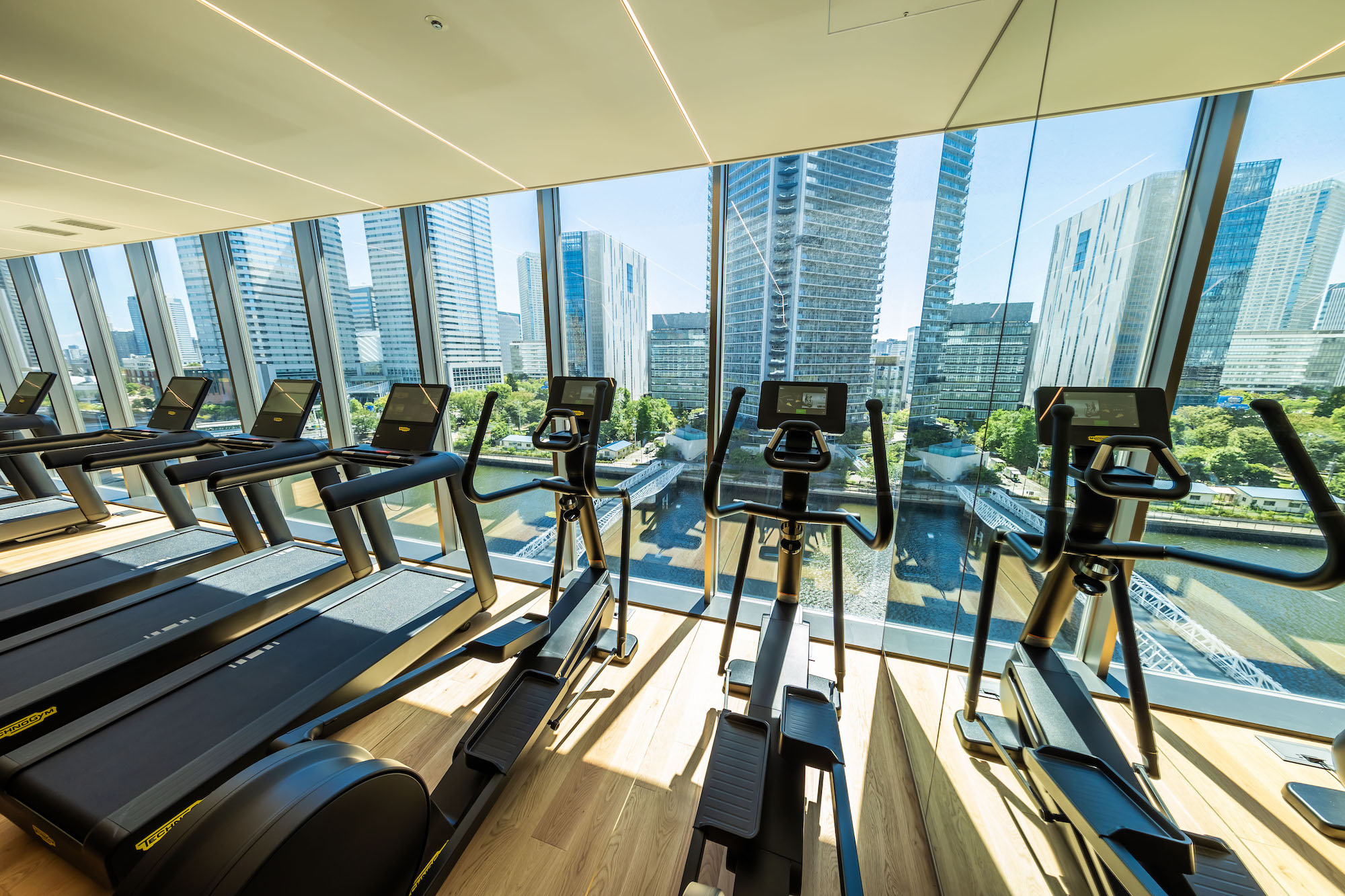 ランニングやウェイトトレーニングなどができる、およそ90miの広々としたフィットネスルーム。休憩スペースやベンダーコーナー(自販機)もご用意。水辺を目の前にした眺望で、心地良いワークアウトを24時間いつでも行える。