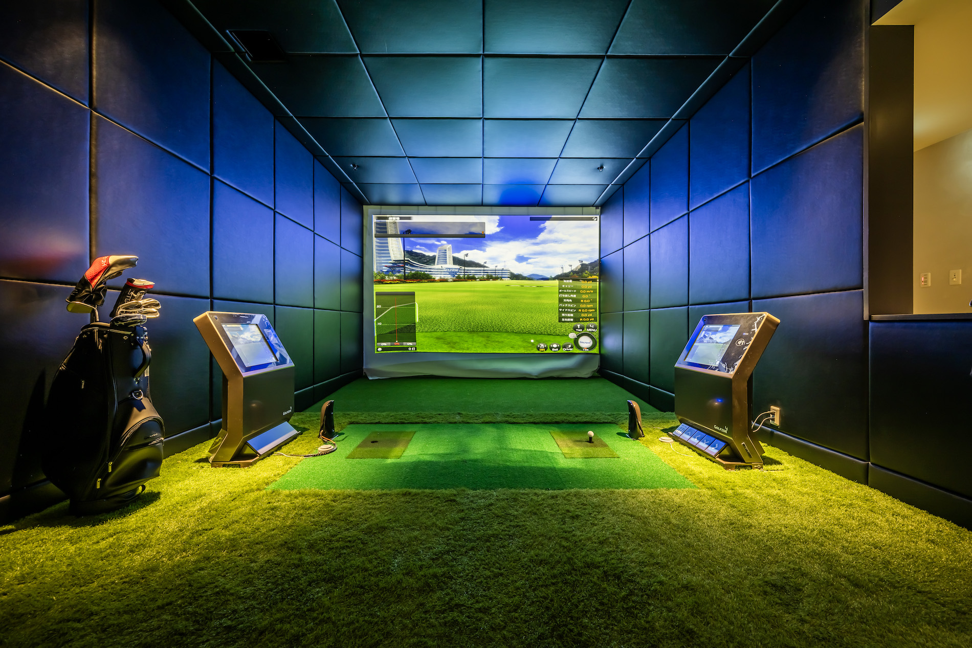 シミュレーションゴルフの機器を設置し、気軽にプレイを楽しめるゴルフレンジを用意。一人での利用はもちろんのこと、ソファを配し、家族や仲間とリラックスしながらプレイができる。
