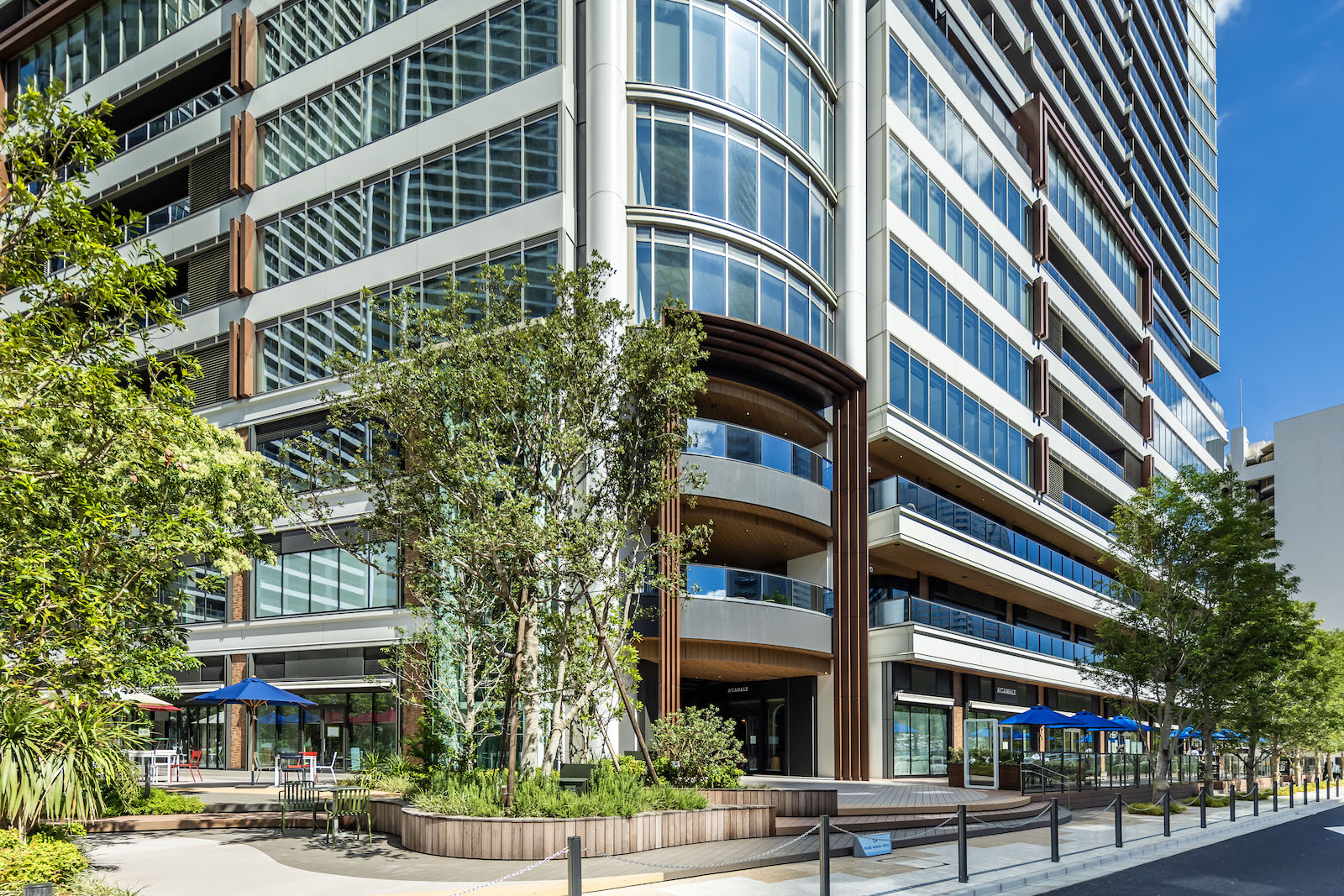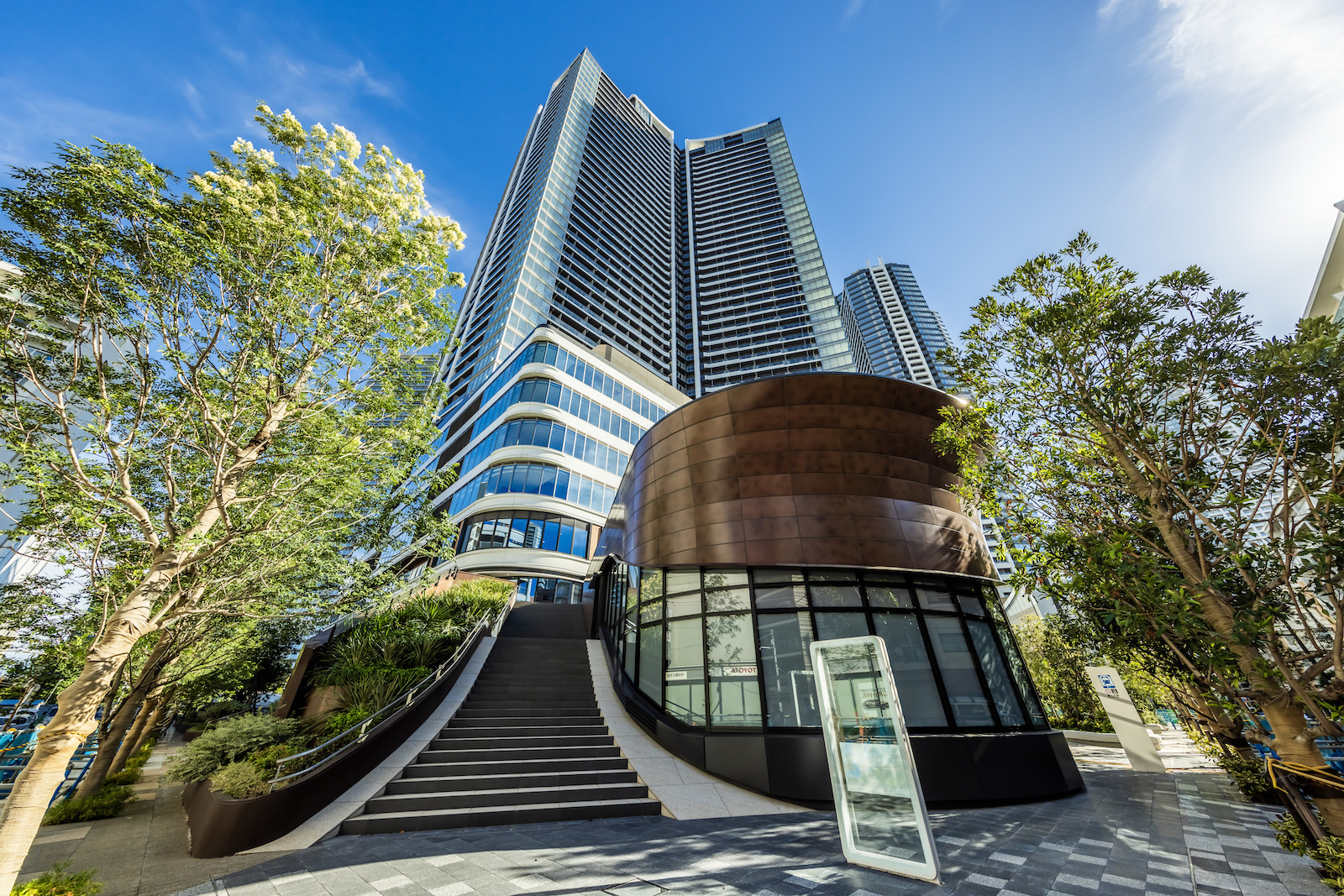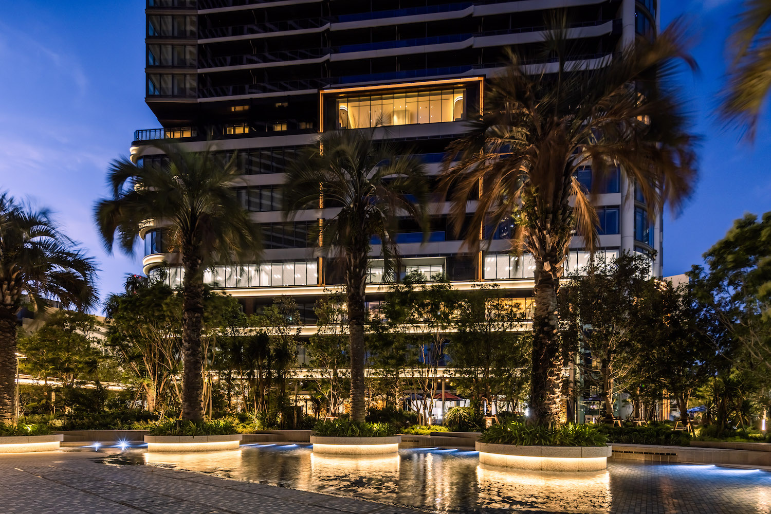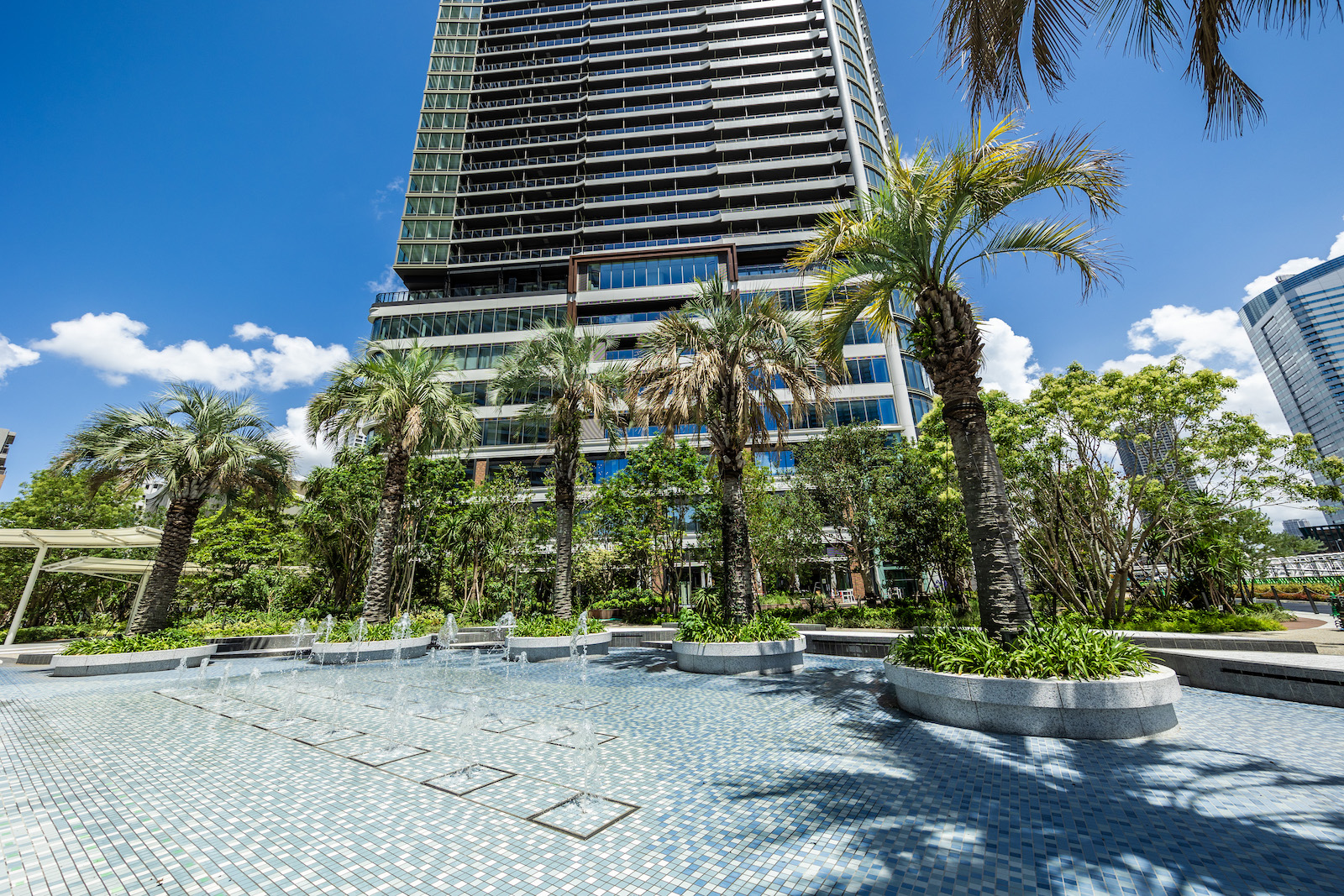 船をデザインモチーフにした柱がここに住む方を気高く迎える地上のレジデンスエントランス。駅出入口のメトロパビリオンから、ここを動線としてセントラルラグーン、そして水辺へとつながる場所。