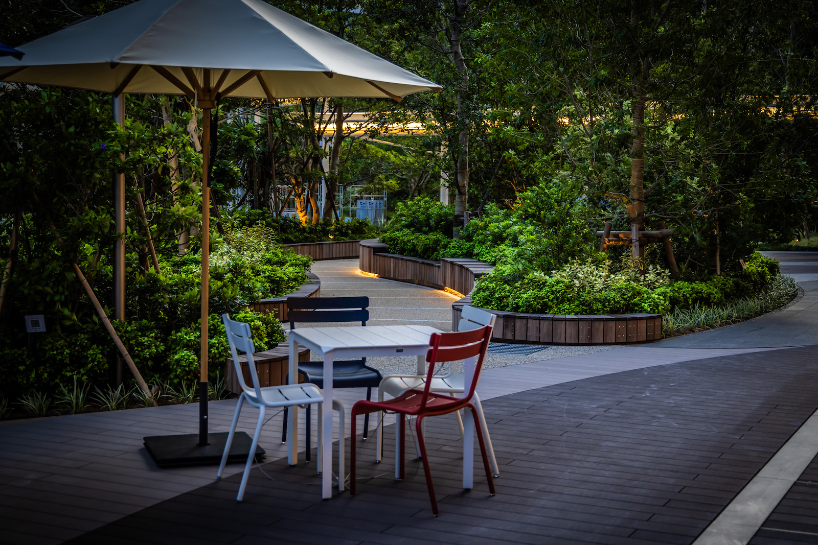 セントラルラグーンは、四季を通じて多様な植物も楽しめる場所。大きなテーブルを配し、カフェのようにここで食事をしたり、パソコンを開いたり、仕事をしたり、さまざまなシーンを演出。家族や人々が集える空間を紡ぐ。
