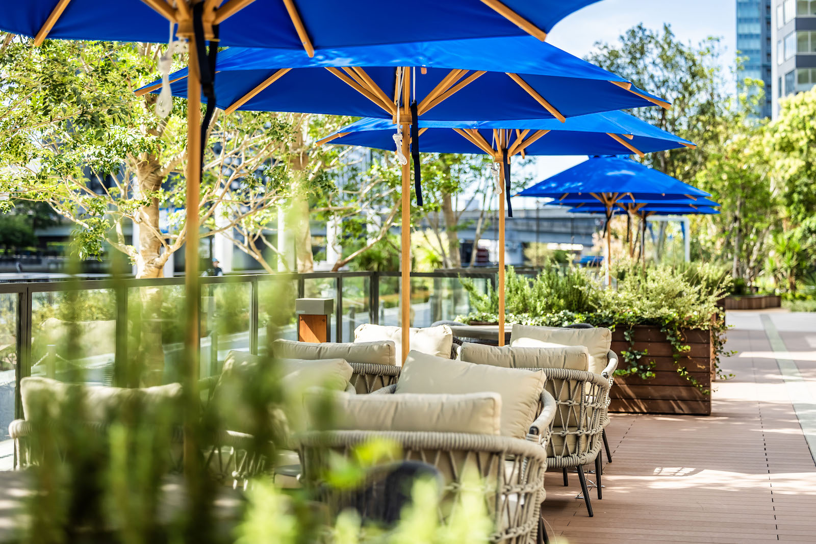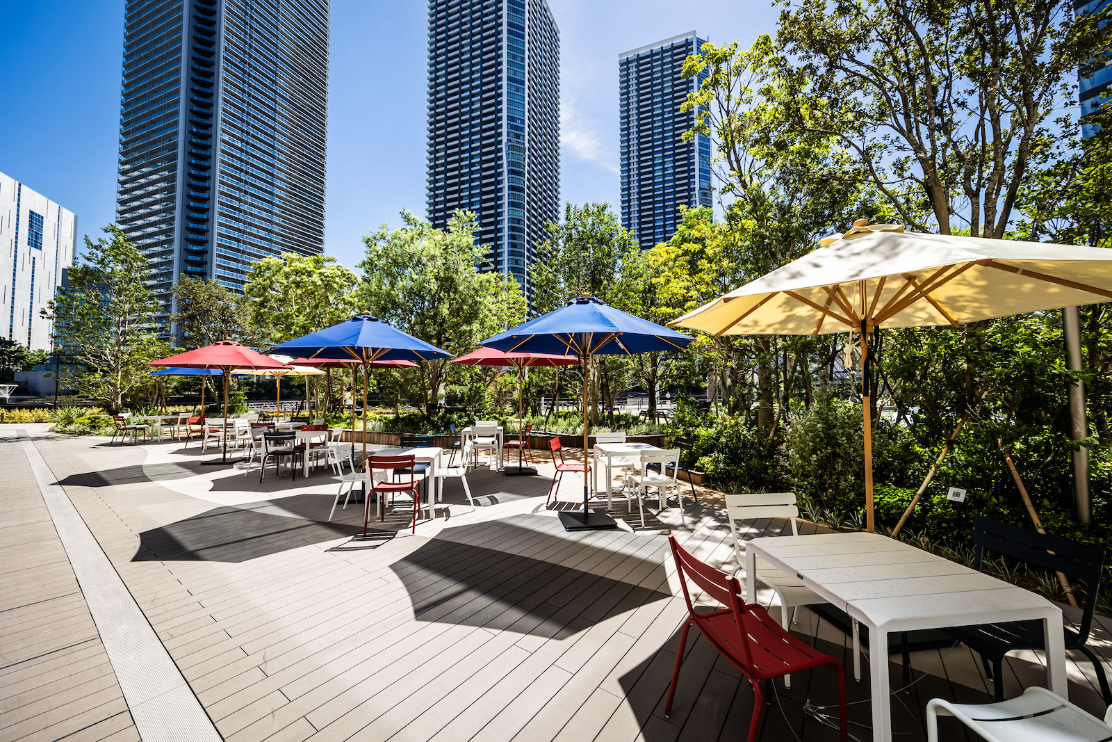 この街は、ウッドデッキを設えた心地の良い屋外空間をご用意。日除けのオーニングテントやパラソルが並び、まるで非日常のシーサイドの暮らしを楽しめる。