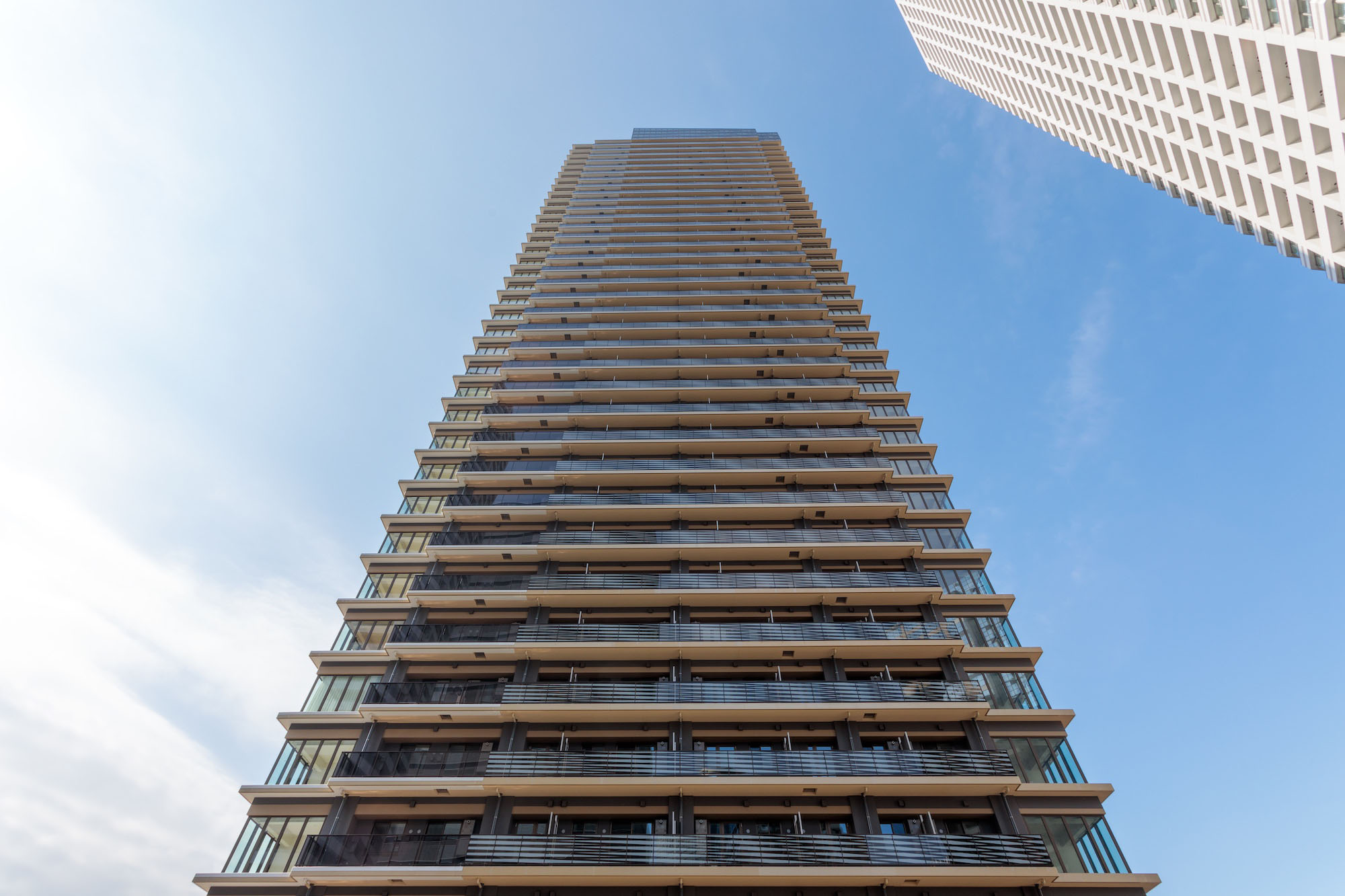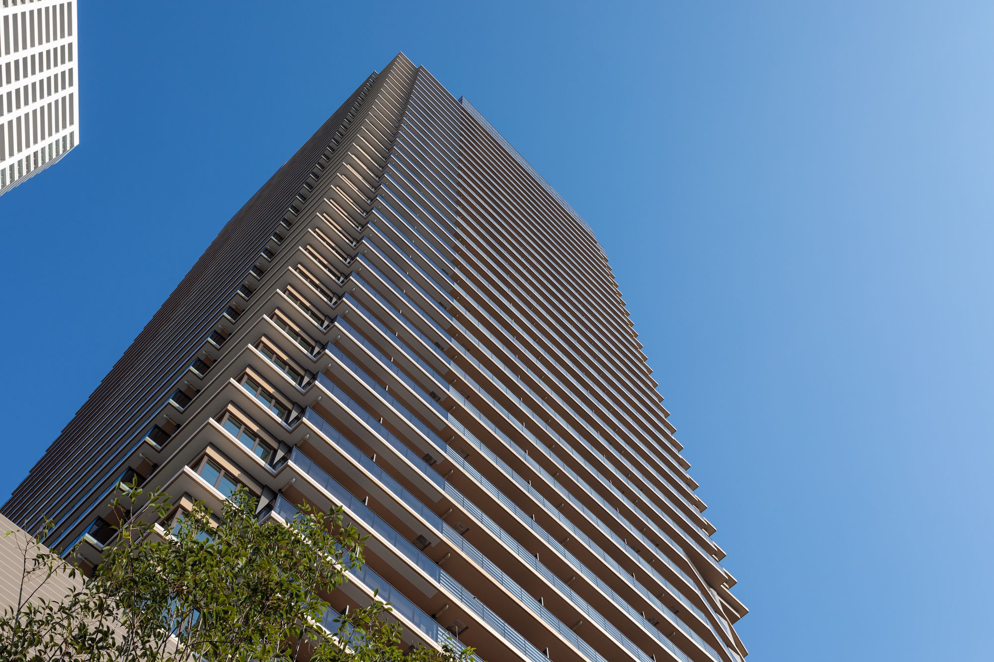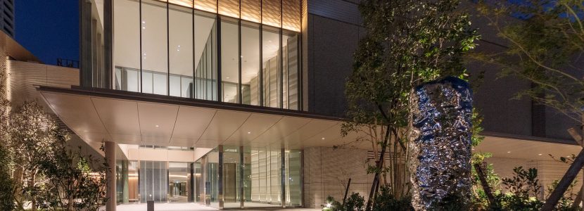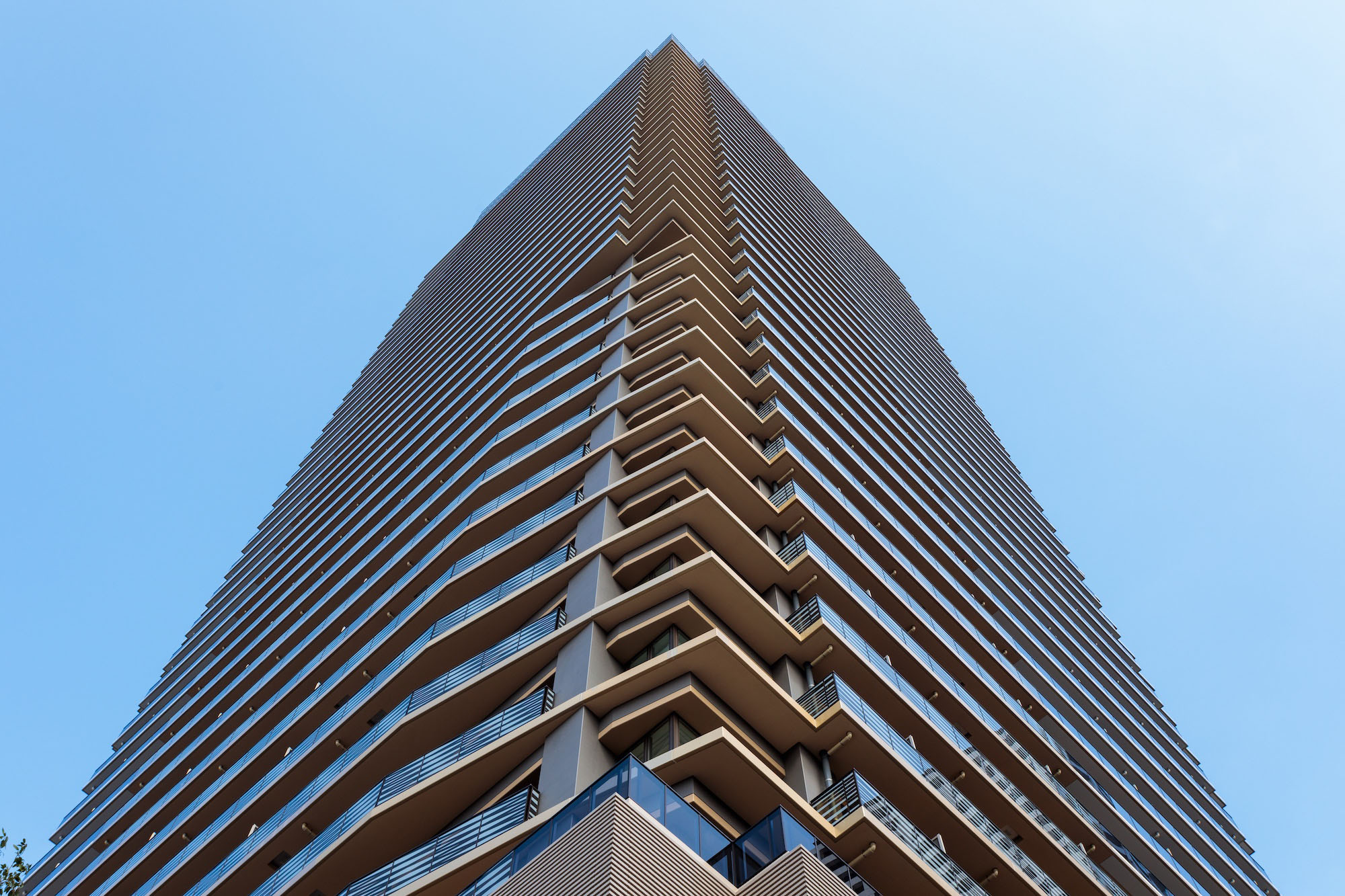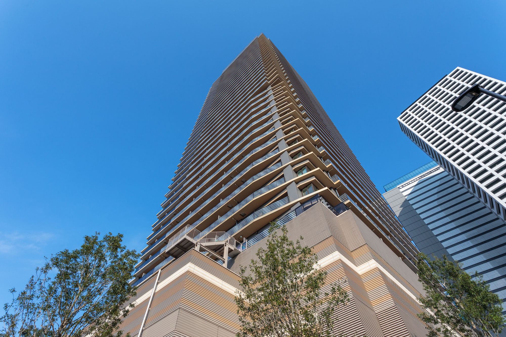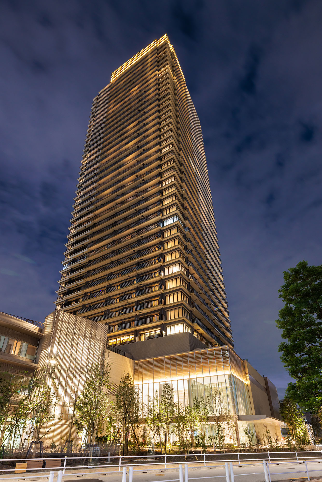タワーの頂部から始まり、低層階へ向かうごとに横からの水流を集め、渓谷を模した基壇部へ流れ落ちる滝をイメージした外観デザイン。かつてこの地にあった十二社の大滝を現代に蘇らせ、街に壮麗な景観が描かれています。ガラス手すりには、茜色のフィルムに白いプリントを重ねたフリットパターンガラスを採用。水平と円弧のラインを重ねることで滝のしぶきを表現し、タワー全体に躍動感を創出しています。基壇部は風合いの異なるタイルやルーバー、塗装など、いくつものマテリアルを組み合わせたデザインが、渓谷に露わとなった深い地層の趣きを演出。緑の木々と石、水の煌めきがつくる自然な植栽を設け、異なるボリュームが遠近感を生み出し、奥行のある景観を生み出すランドスケープへとつながります。