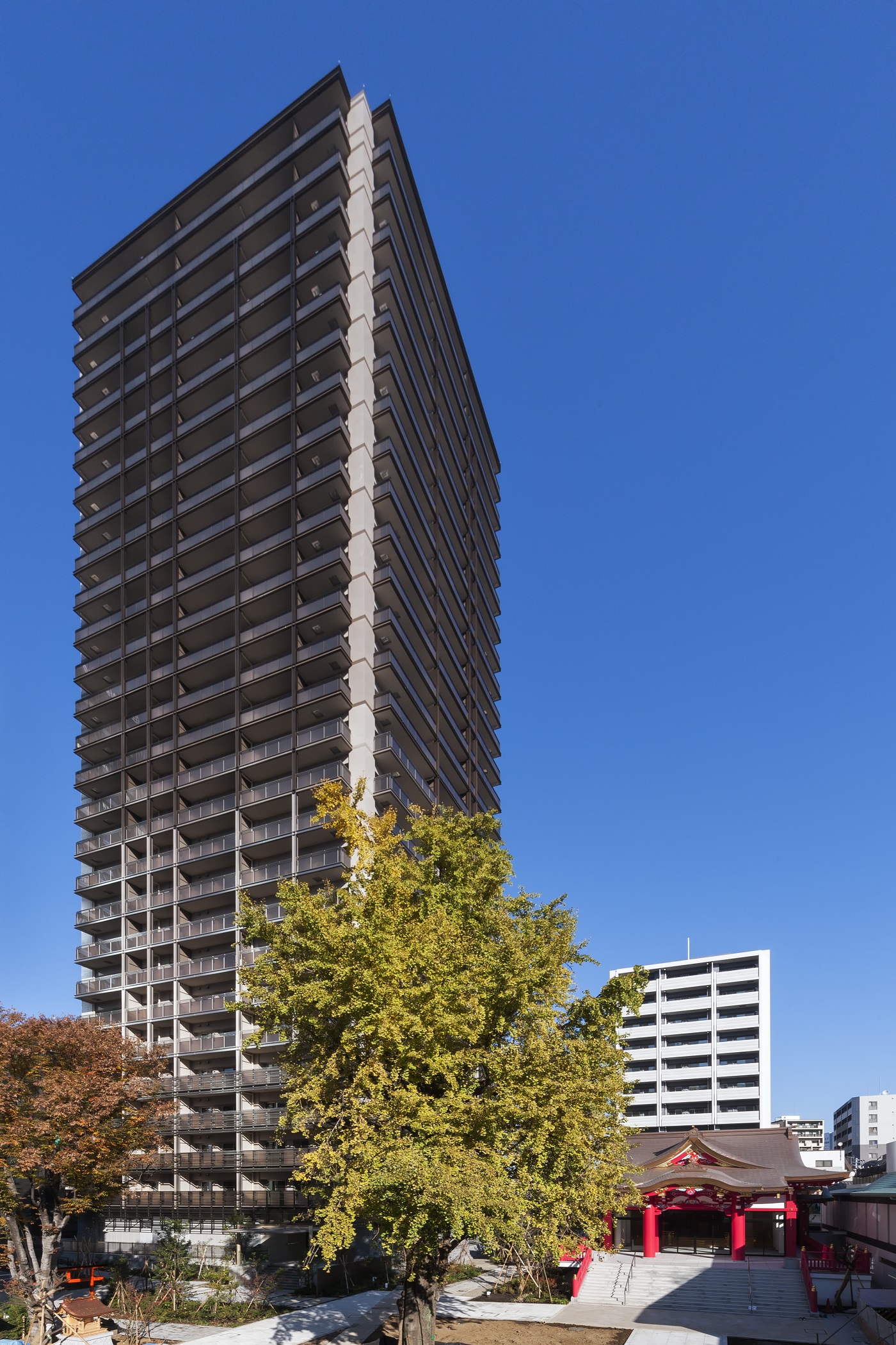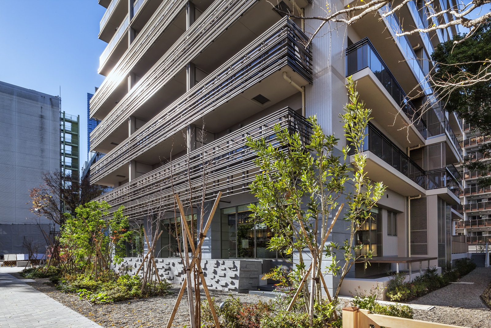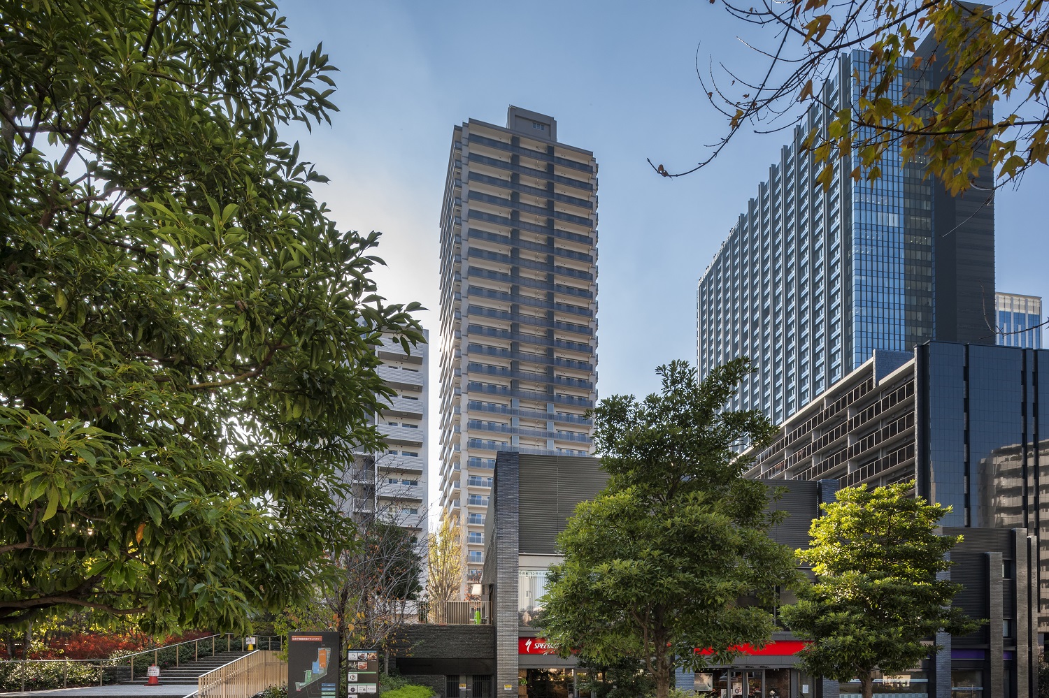 周辺の豊かな緑と建物の境界が溶け込むように、低層部の4層までは温もりのあるアルミのルーバーで建物を被い、落ち着いた雰囲気を演出。高層になるに従って濃さを増す色調と、のびやかなタワーのフォルムを強調するマリオンが、タワーとしての存在感を創出する、繊細で優雅なファサードデザインです。