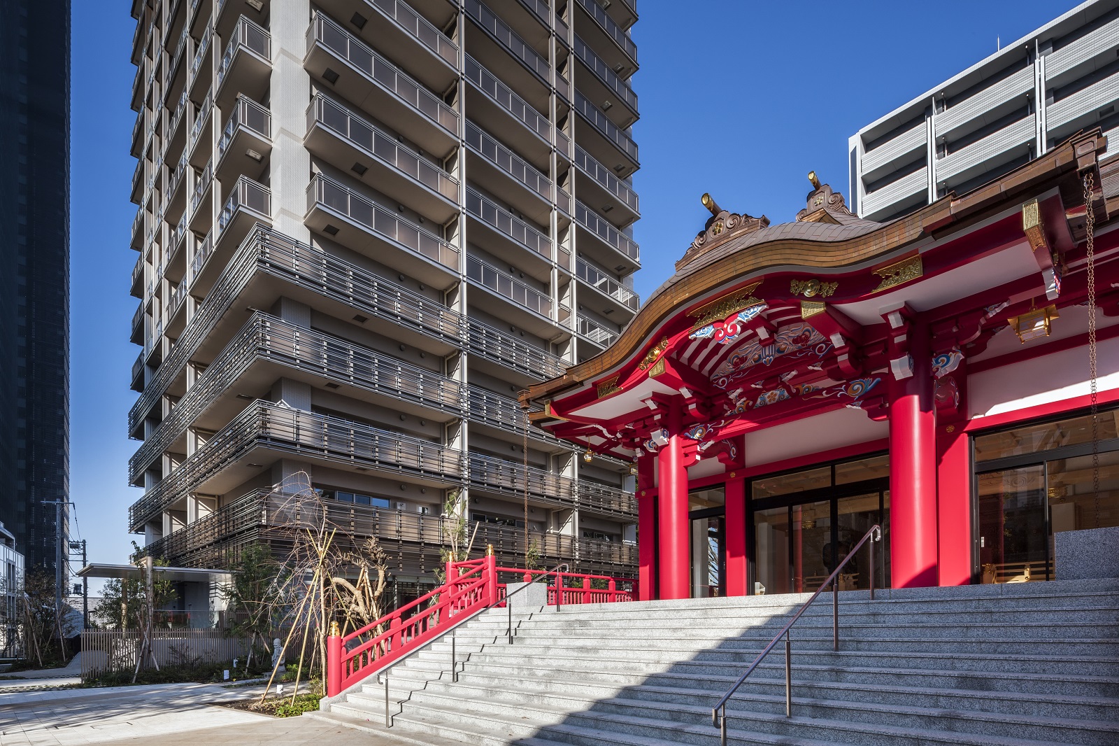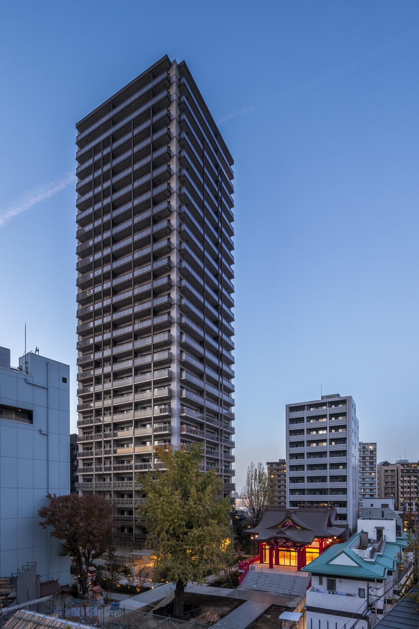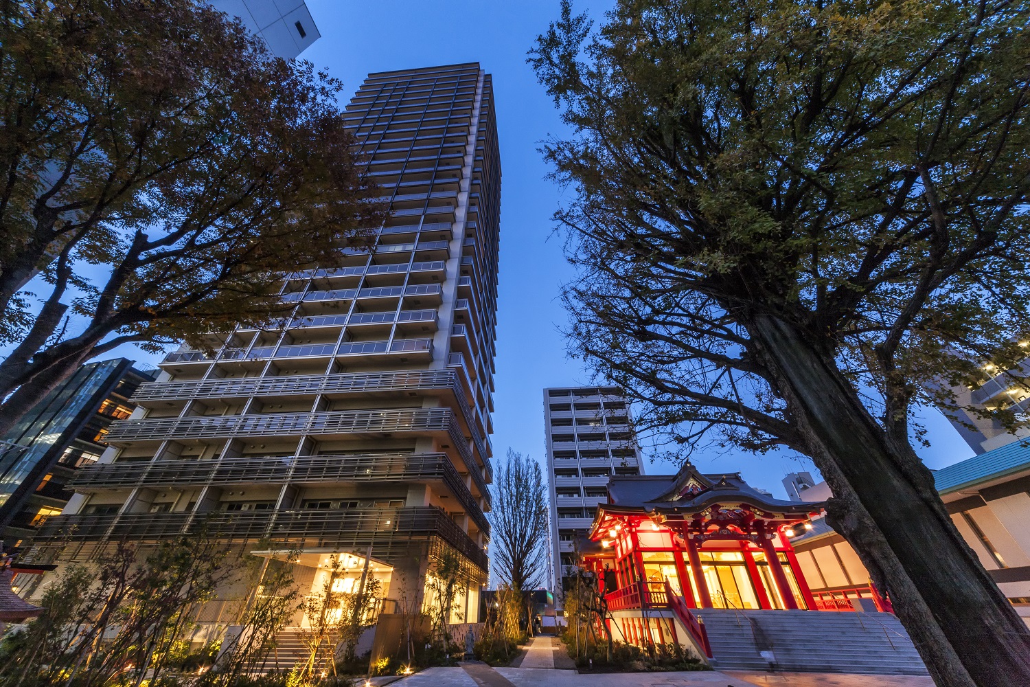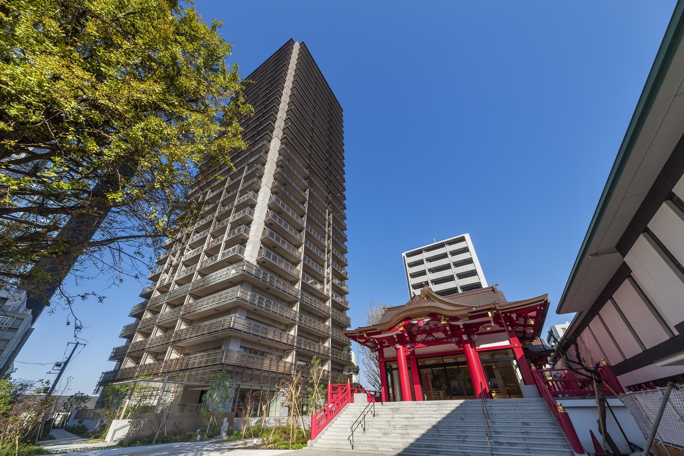 周辺の豊かな緑と建物の境界が溶け込むように、低層部の4層までは温もりのあるアルミのルーバーで建物を被い、落ち着いた雰囲気を演出。高層になるに従って濃さを増す色調と、のびやかなタワーのフォルムを強調するマリオンが、タワーとしての存在感を創出する、繊細で優雅なファサードデザインです。