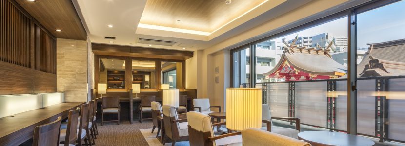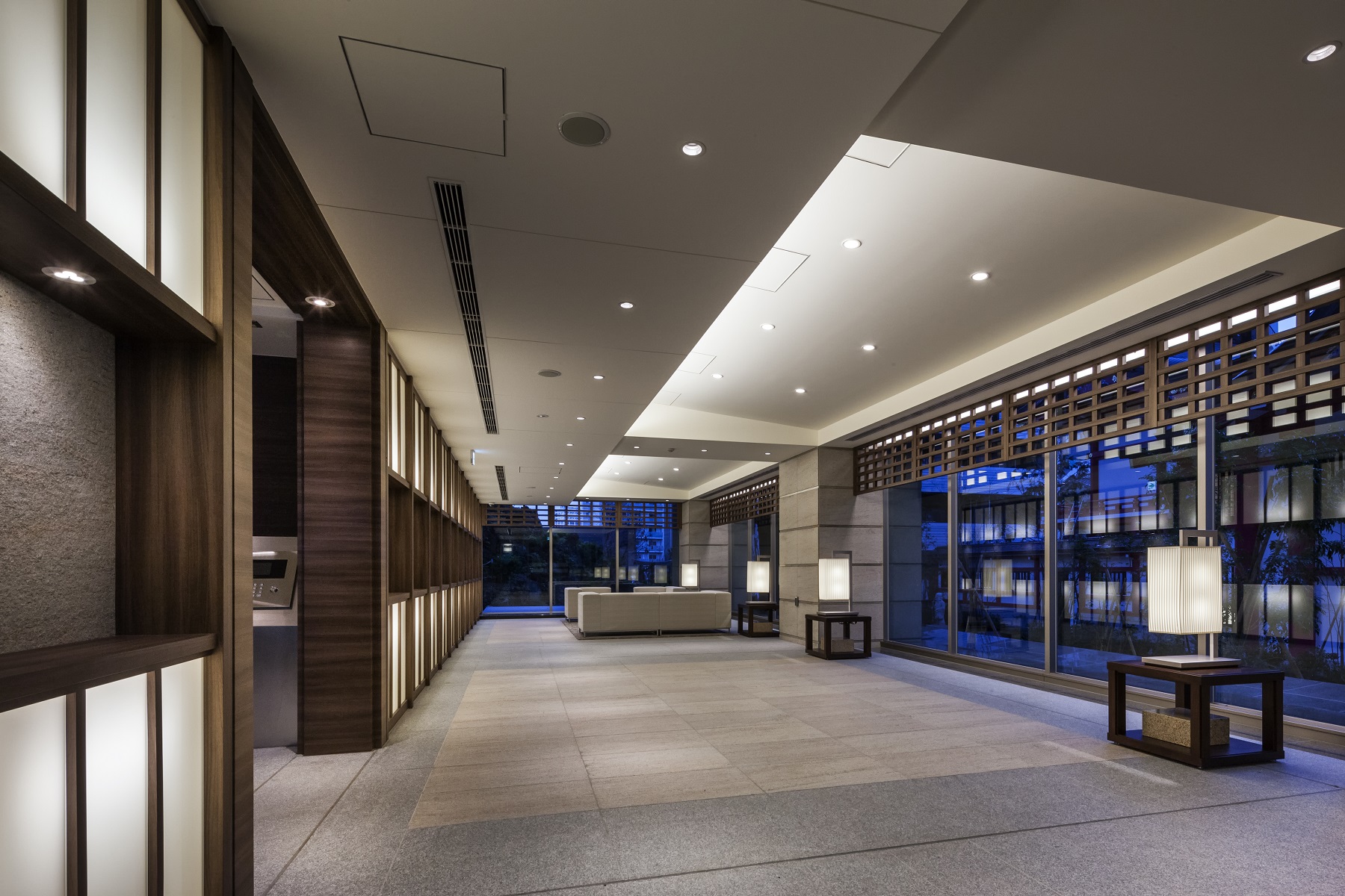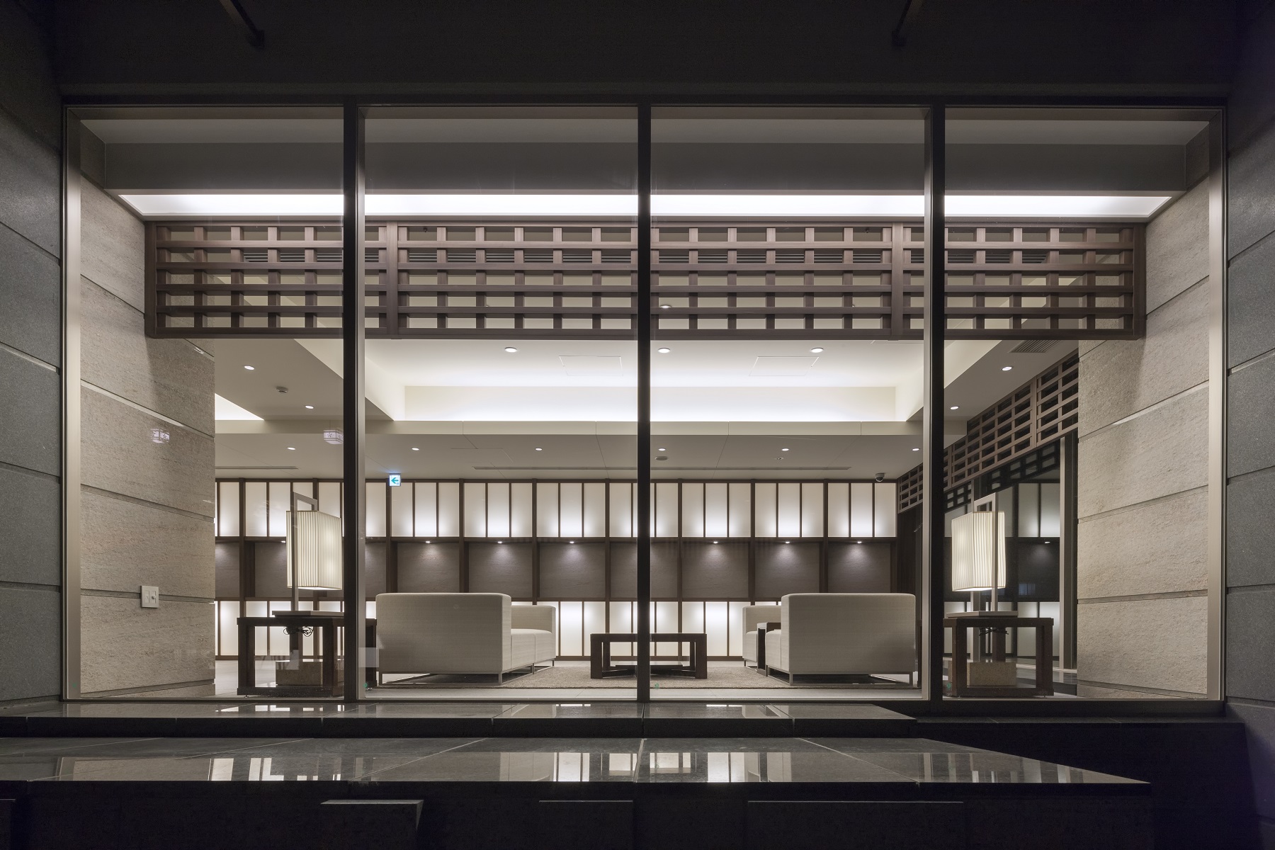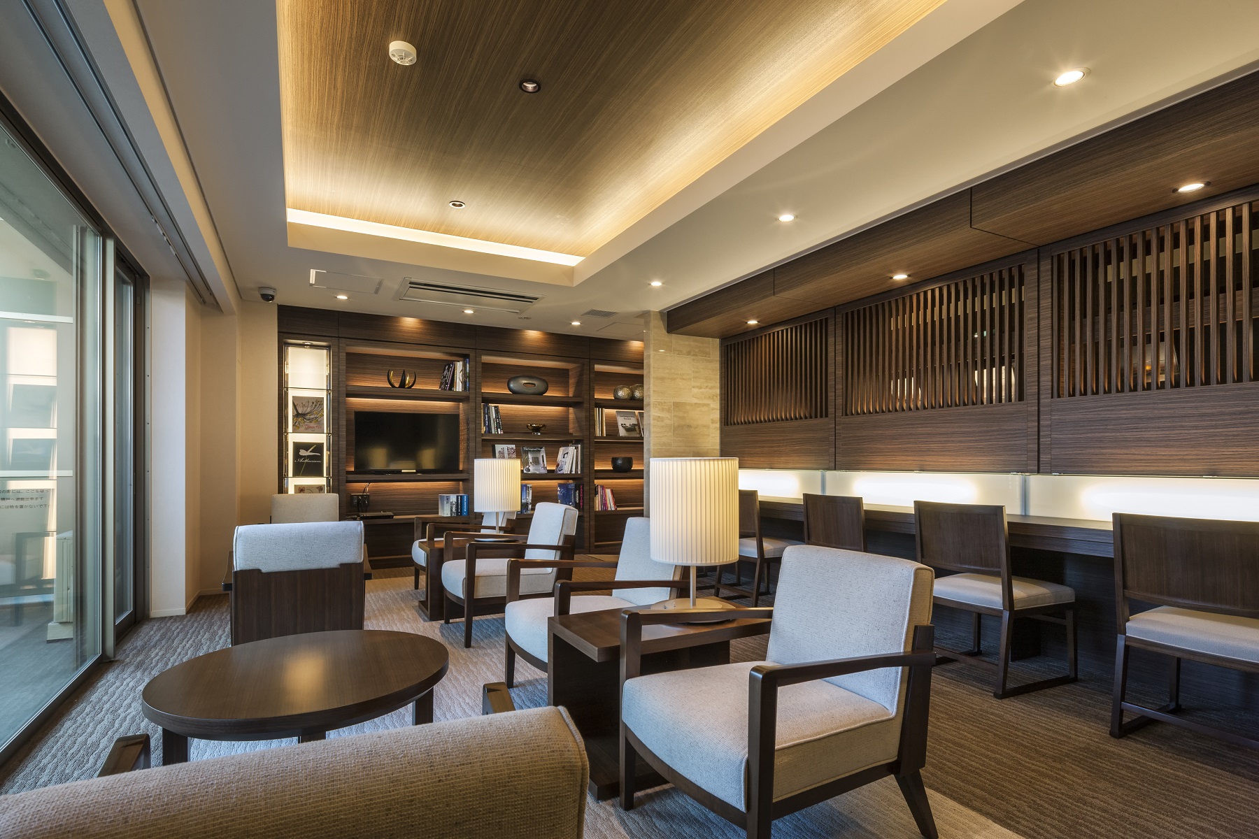 豊かな緑と調和する天然石を使用したエントランス。その先には、借景となる神社の建物や深い緑を、まるで風景画のように見せるガラス張りのエントランスホールが広がっています。花崗岩の趣を活かしたフロアや石肌の化粧柱、飾り格子や折り上げ天井など、和とモダンが融合する落ち着いた空間です。また、書斎代わりとして使えるライブラリーラウンジも完備。持参のパソコンを使いながらビジネスや趣味の時間を過ごすなど、多彩に活用できます。