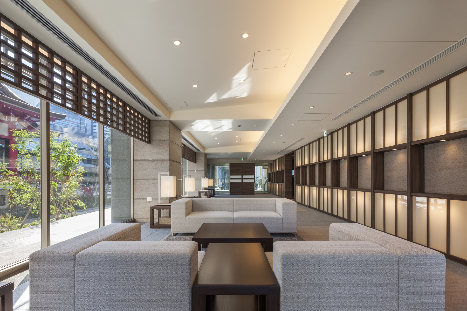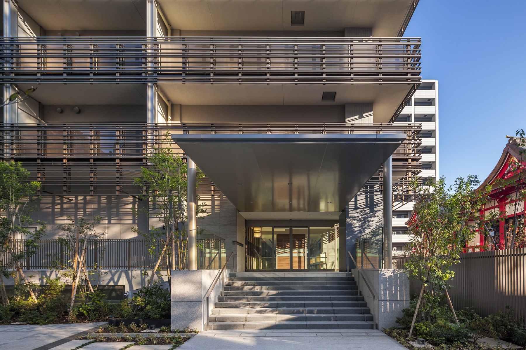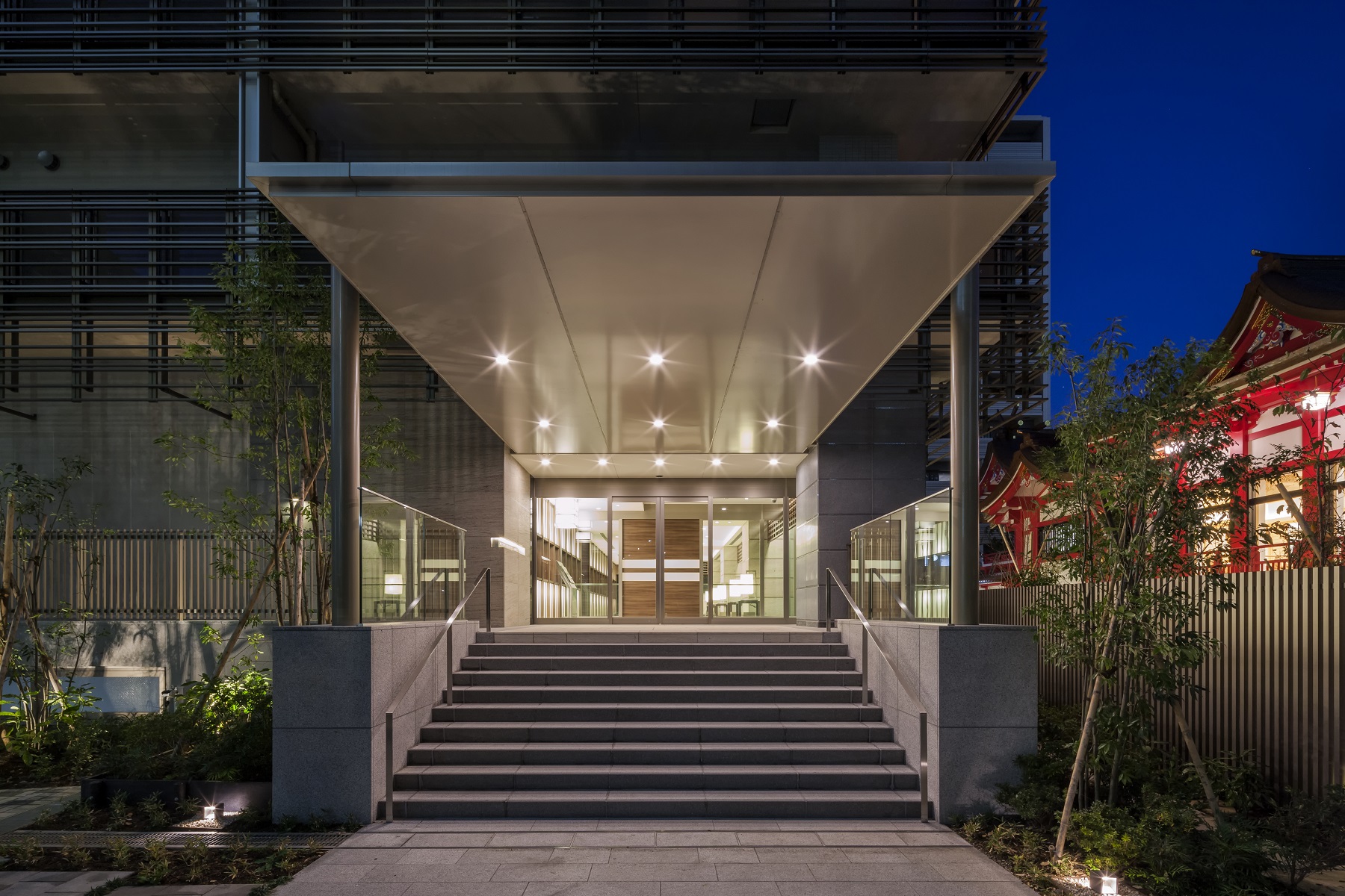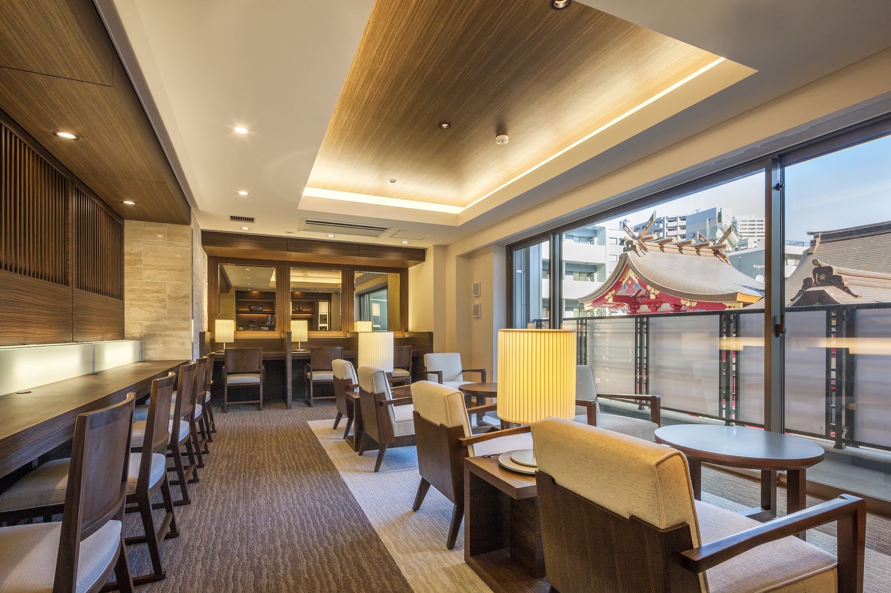 豊かな緑と調和する天然石を使用したエントランス。その先には、借景となる神社の建物や深い緑を、まるで風景画のように見せるガラス張りのエントランスホールが広がっています。花崗岩の趣を活かしたフロアや石肌の化粧柱、飾り格子や折り上げ天井など、和とモダンが融合する落ち着いた空間です。また、書斎代わりとして使えるライブラリーラウンジも完備。持参のパソコンを使いながらビジネスや趣味の時間を過ごすなど、多彩に活用できます。