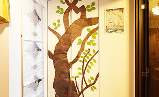 花びら舞う桜や紅葉など、季節ごとに壁や扉の飾り付けを変える。