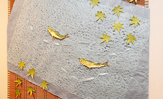 和紙を清流に見立て、手作りの鮎を泳がせた簾もインテリアの一部。