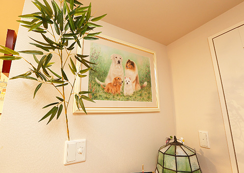 家族を象徴するワンちゃんのパステル画が出迎える玄関。