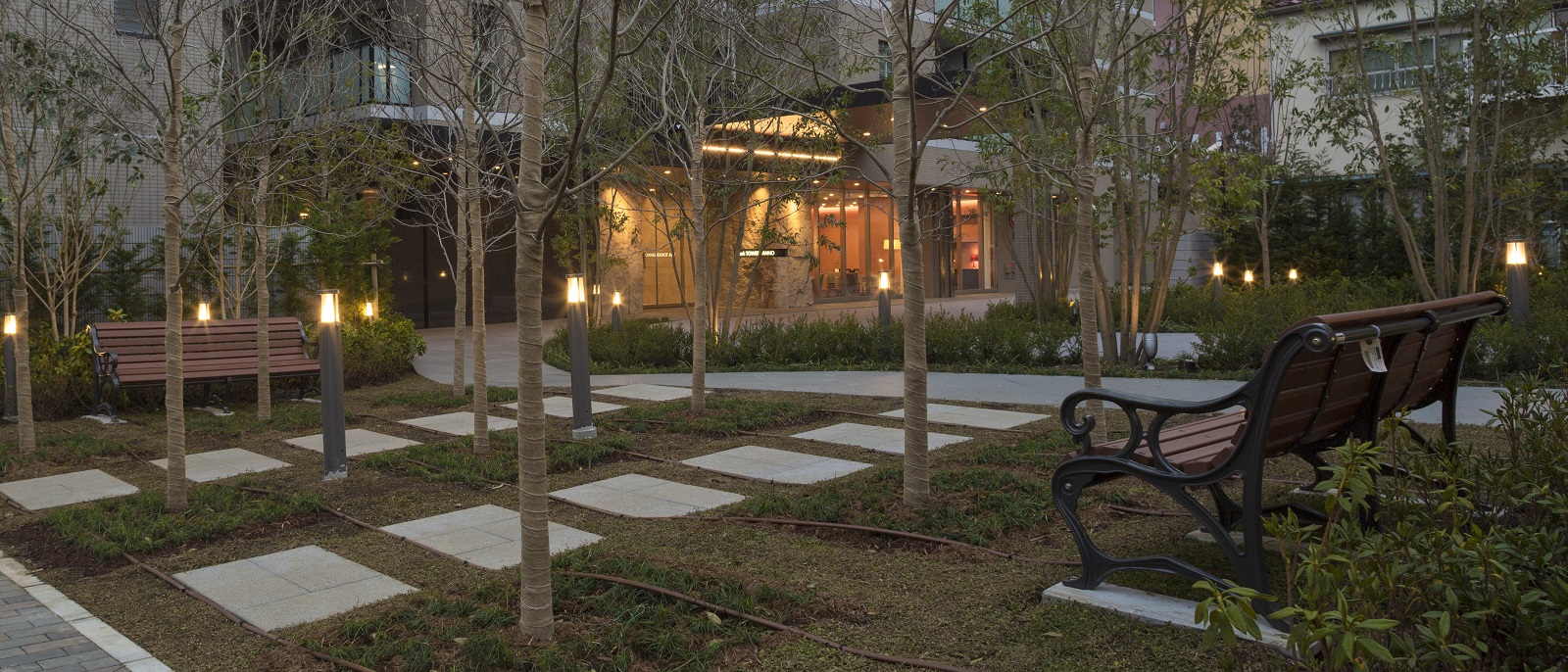 アプローチ横には緑の庭園があり、住まいへ向かいながら、四季折々の景色が楽しめます。