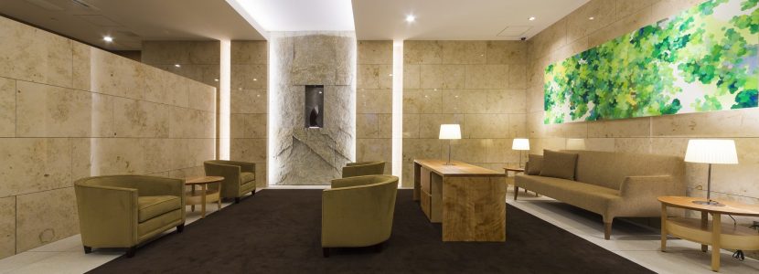 アイストップとなる場所には、エントランス同様に庵治石をアクセントとしてレイアウト。さらに、アートの彩りをプラス。空間とアートの協奏が凛としたスペースに柔らかな印象を醸します。