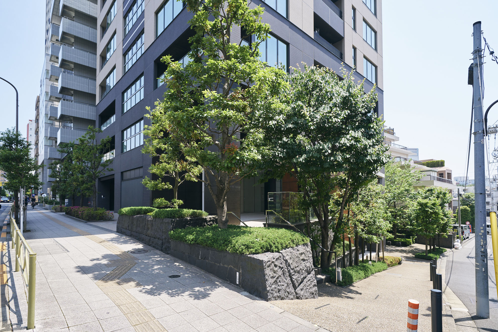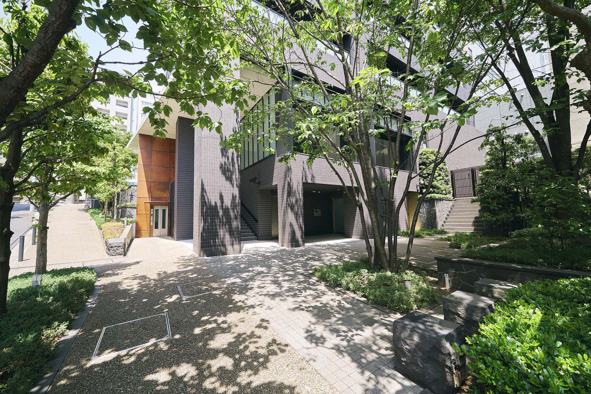 高輪の歴史を現代にアレンジするため、外構には江戸時代の関所である「大木戸門」をイメージした自然石を使用。外観は武家屋敷の漆喰壁と屋根瓦をモチーフにした、ページュと黒のタイルによってシンメトリーなファサードとするなど、高輪の地にふさわしい和を意識したモダンなデザインとなっています。建物の足元部分には、人々をおおらかに迎え導くように、石と金属による2層吹き抜けの大きなゲートを構築し、さらに高輪の持つ「緑豊かな高台」のイメージを崩さないよう、周辺に残る自然との連続性を意識した植栽を豊富に配置。照明が美しいエレベーターホールは、夜になると桜田通りに一本の「光の柱」が浮かびあがるように計算されています。全体にもディテールにも、高輪らしさを感じさせるデザインです。