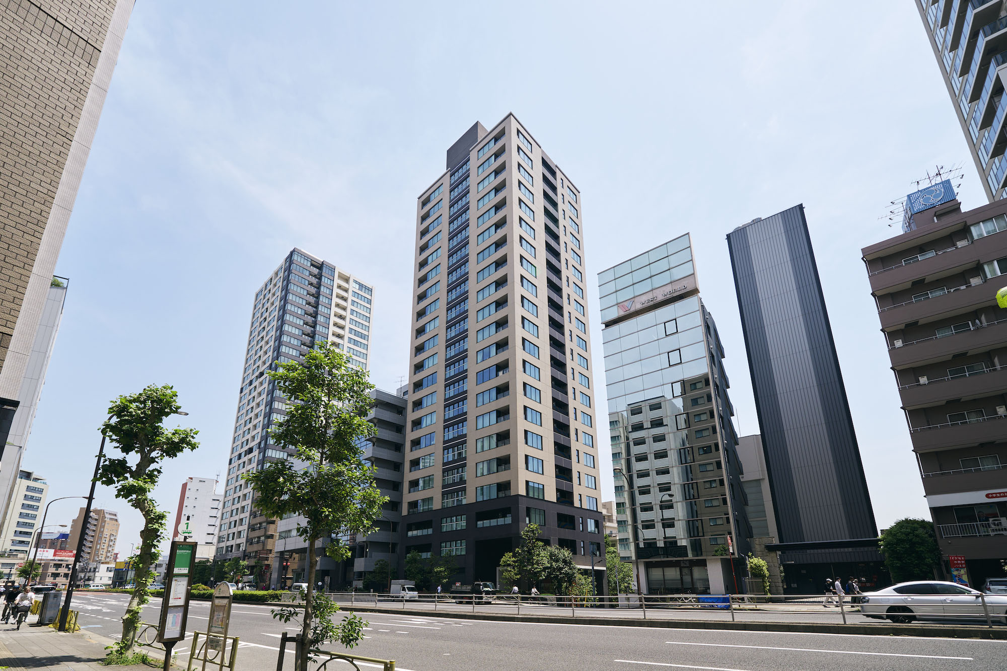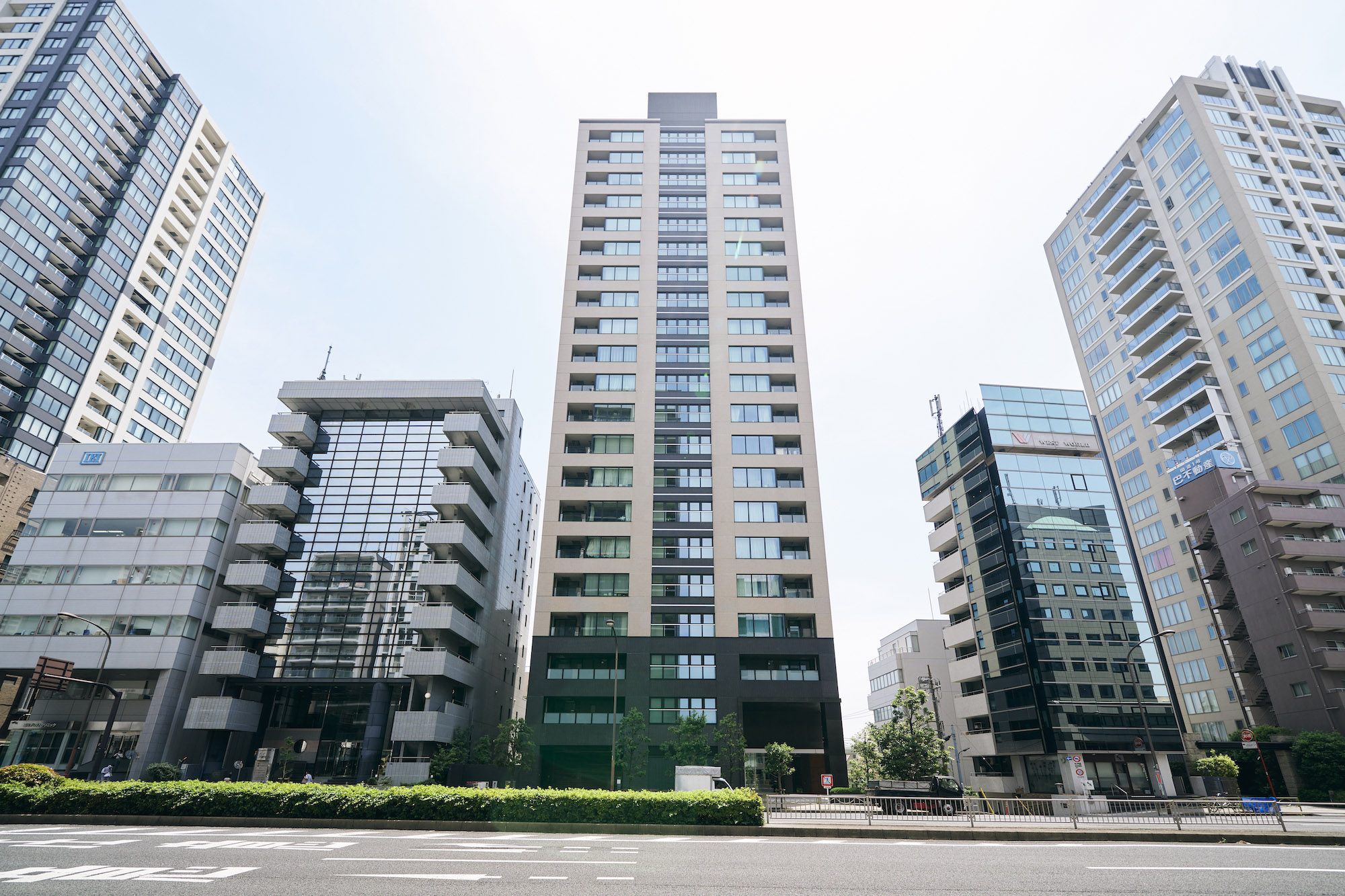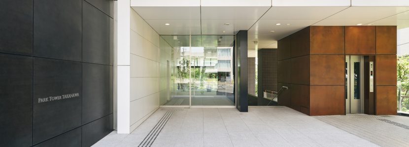 高輪の歴史を現代にアレンジするため、外構には江戸時代の関所である「大木戸門」をイメージした自然石を使用。外観は武家屋敷の漆喰壁と屋根瓦をモチーフにした、ページュと黒のタイルによってシンメトリーなファサードとするなど、高輪の地にふさわしい和を意識したモダンなデザインとなっています。建物の足元部分には、人々をおおらかに迎え導くように、石と金属による2層吹き抜けの大きなゲートを構築し、さらに高輪の持つ「緑豊かな高台」のイメージを崩さないよう、周辺に残る自然との連続性を意識した植栽を豊富に配置。照明が美しいエレベーターホールは、夜になると桜田通りに一本の「光の柱」が浮かびあがるように計算されています。全体にもディテールにも、高輪らしさを感じさせるデザインです。