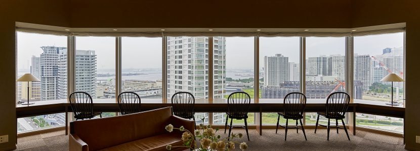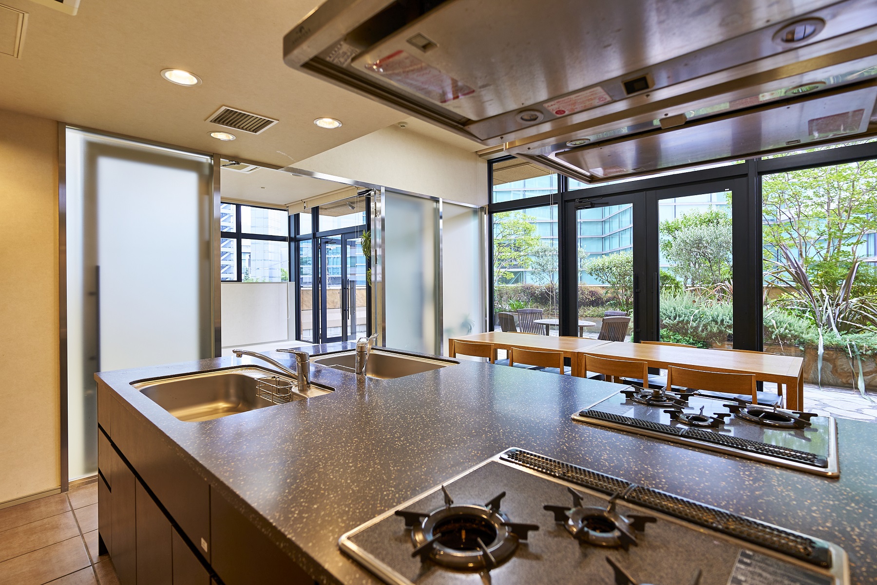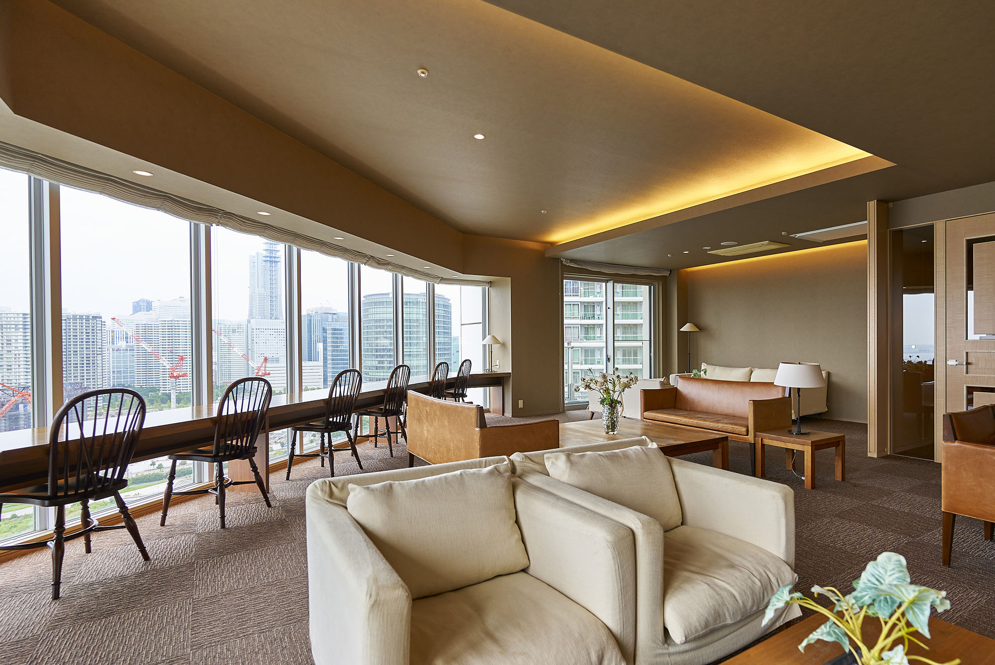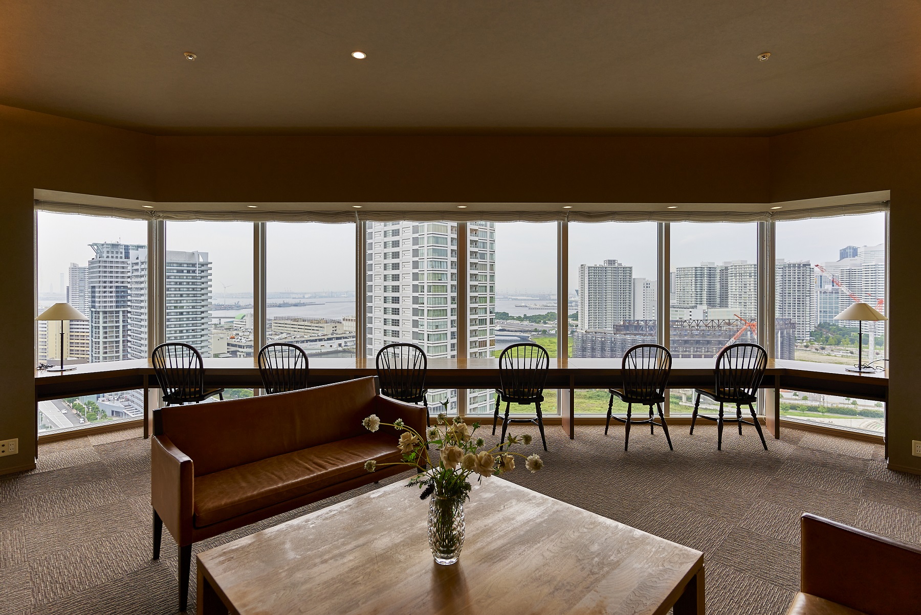 1階の「ゲストラウンジ」は、訪れた人にくつろいでいただけるしっとりとした空間。エントランスホールの一部として、お客様をおもてなしできます。2階にある「多目的ルーム」は、大きなキッチン付きでパーティーでの利用も可能。19階の「ゲストルーム」は、奇を衒わずに機能的で過ごしやすい空間になっています。19階の「スカイラウンジ」は、海の眺望を大事にしたシンプルなつくり。バーカウンターでお一人でも楽しめるようになっています。