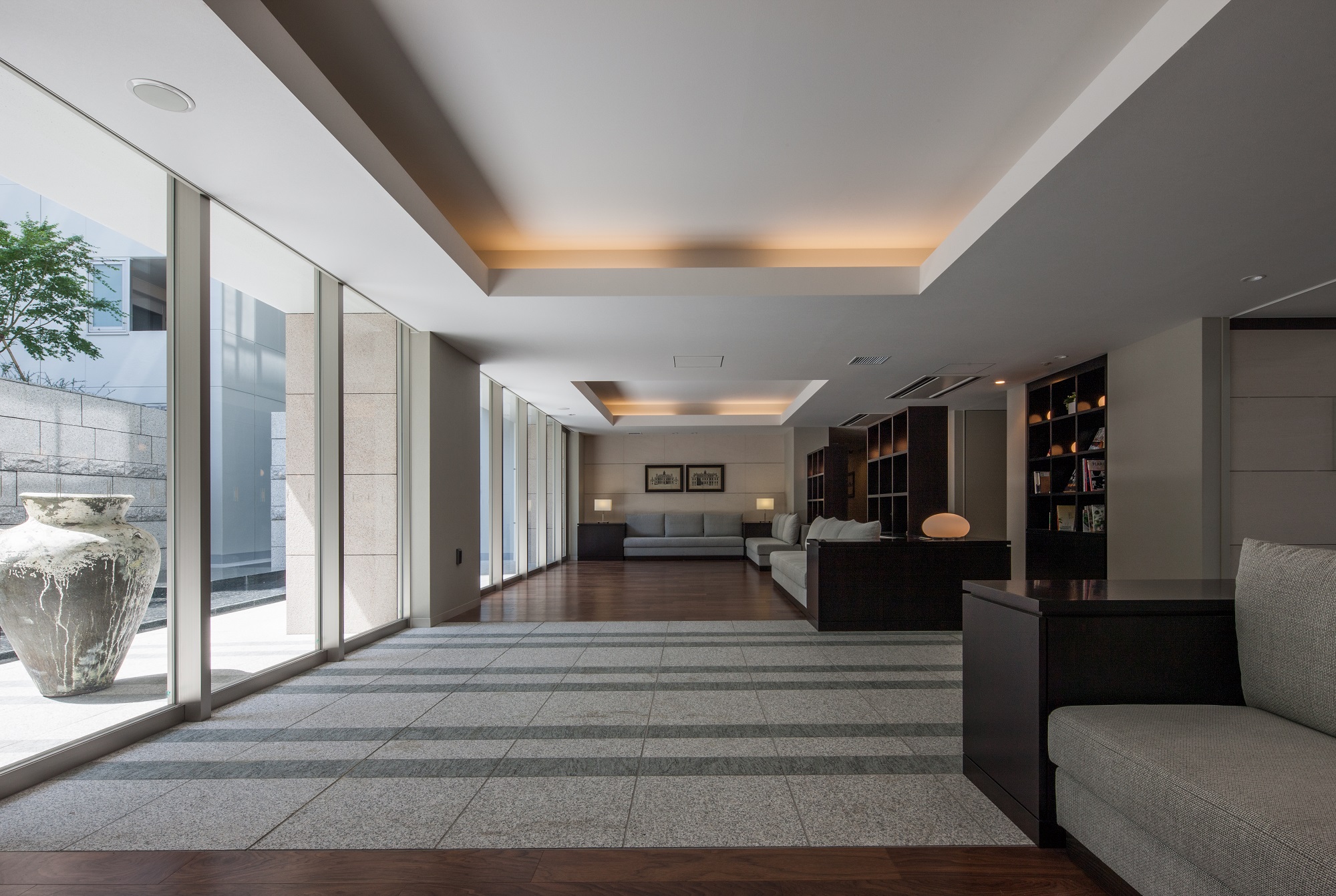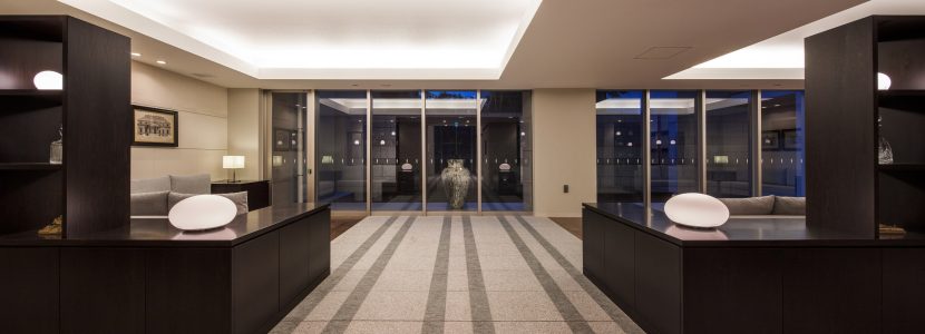 重厚感あふれるこぶ出しの御影石が外壁から内壁までつづく、風格あふれるエントランス。その先には、アートを配した二層吹き抜けの大空間「ギャラリーホール」が、まるで美術館の大広間のように壮麗に人を迎え入れます。ゆったりと奥へ歩いていくと、流れ落ちる水と美しい水面が癒しの空間を演出する「カスケードホール」が広がり、住まう方々がもうひとつのリビングルームとして利用できる寛ぎのスペースとして、ブックシェルフやライブラリーが、文化の薫り高いヨコハマを感じさせます。自分の住まいに帰ることが「人生の想い出」になる。そんな美しい舞台がここにあります。